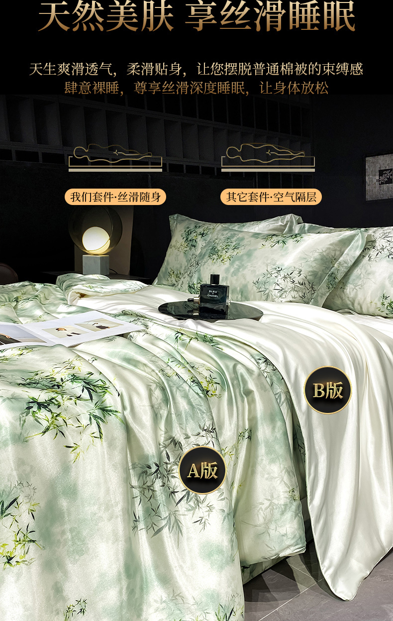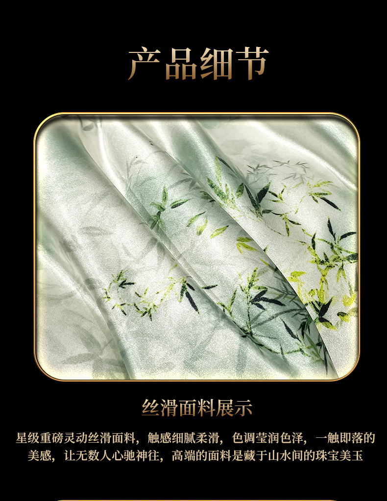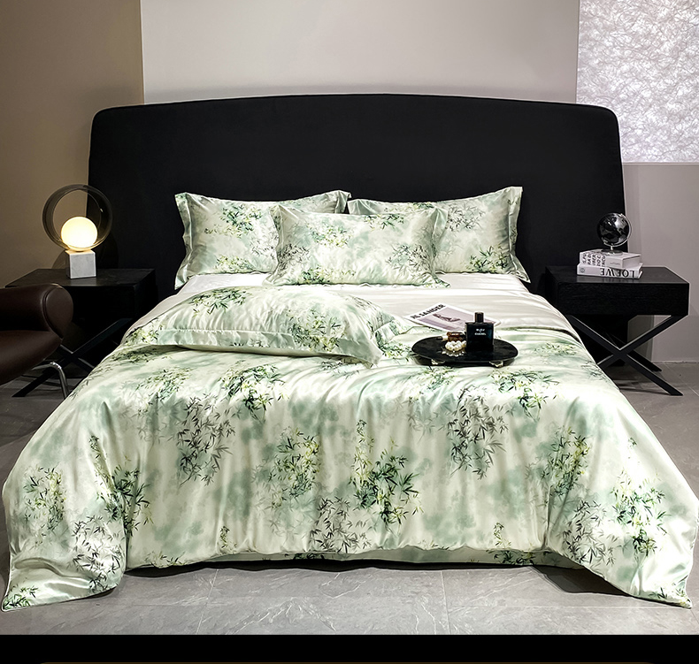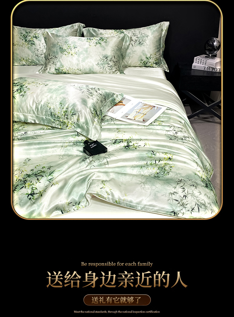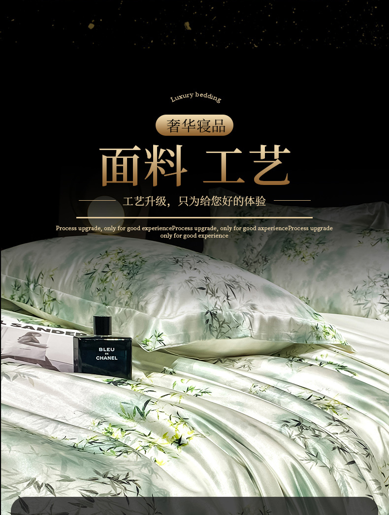 商品名称:黄鹂鸟 2025新款高端轻奢丝滑裸睡丝绸数码印花水洗真丝天丝四件套系列 -风格四 东方竹韵