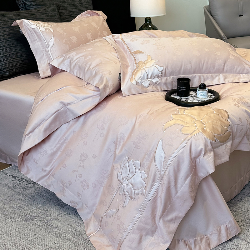 商品名称:若未家居 LOVEWE HOUSE 2025新款50S长绒棉提花800T锦缎贴布绣工艺四件套-博洛-自然光实拍 博洛-粉