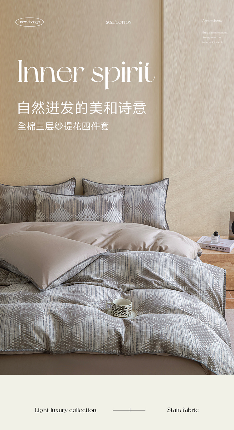 (总)2025新款亲肤全棉三层纱提花四件套,菱格-赤缇,菱格-露褐,菱格-月灰,叶语-兰苕,叶语-嫩灰,叶语-珠子褐,韵律-沉香,韵律-黛绿,韵律-星灰