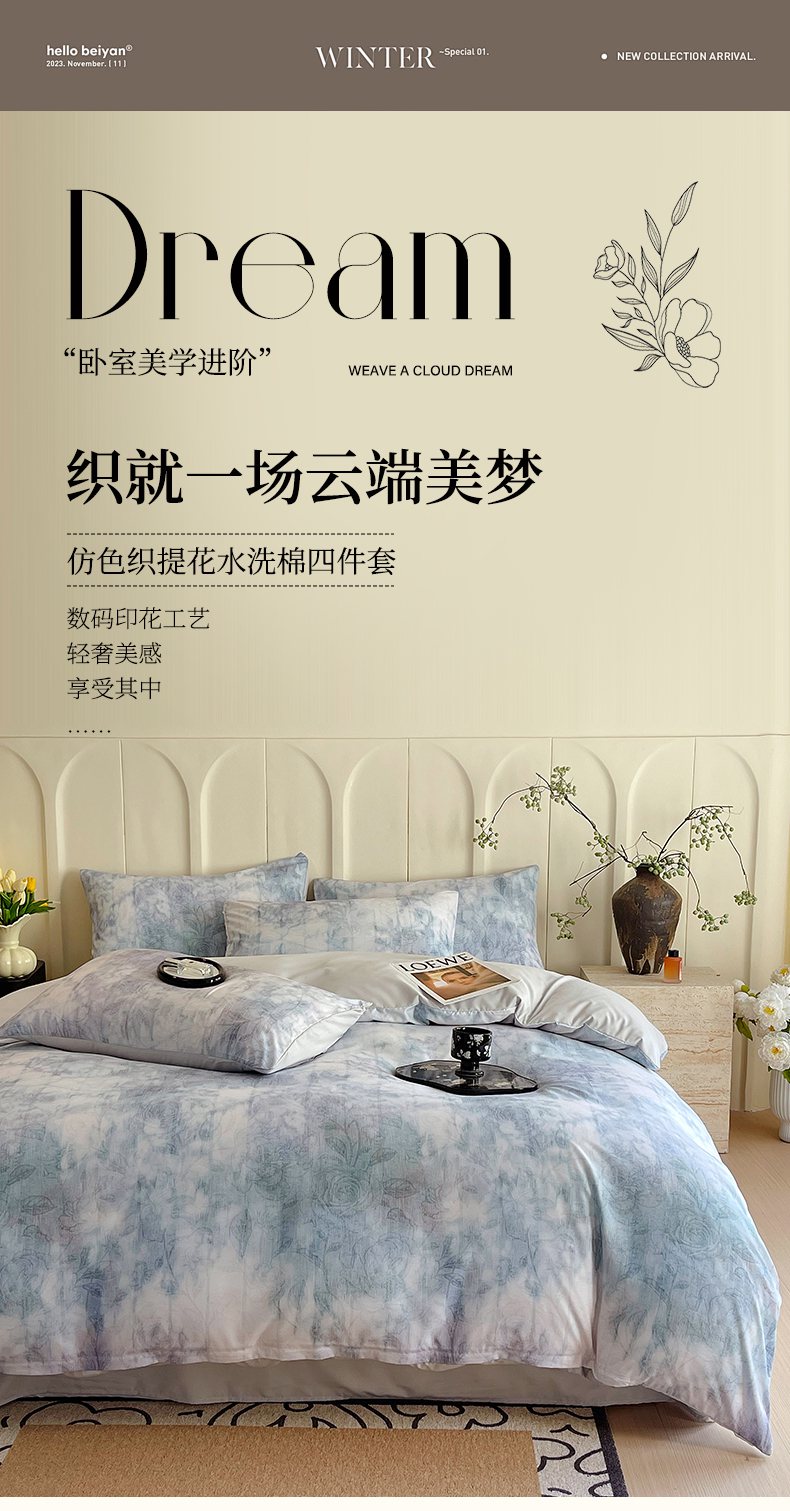 商品名称:2025新款仿色织提花数码印花水洗棉四件套 隐纱 蓝