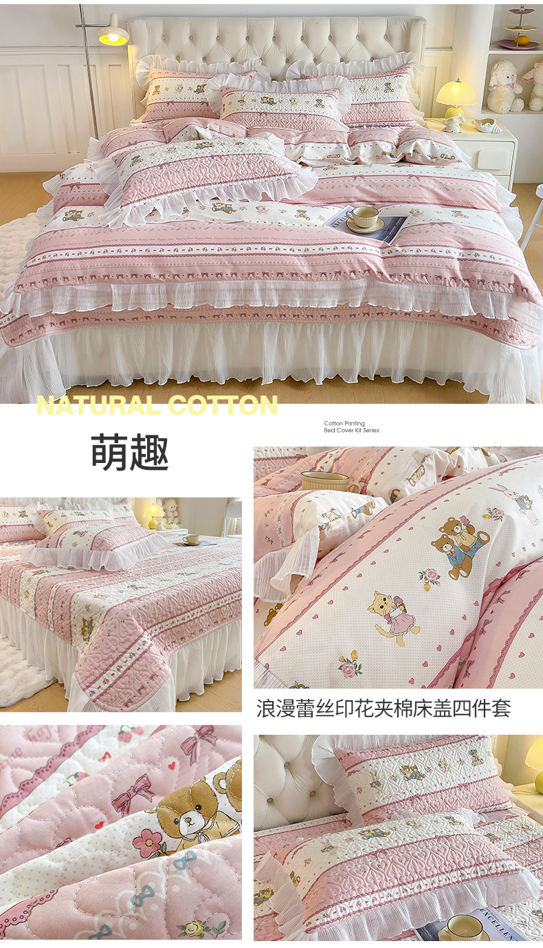 • 91家纺网 家纺一手货源 找家纺 宜凡家纺2025新款雪纺花边印花夹棉床盖三件套四件套 萌趣