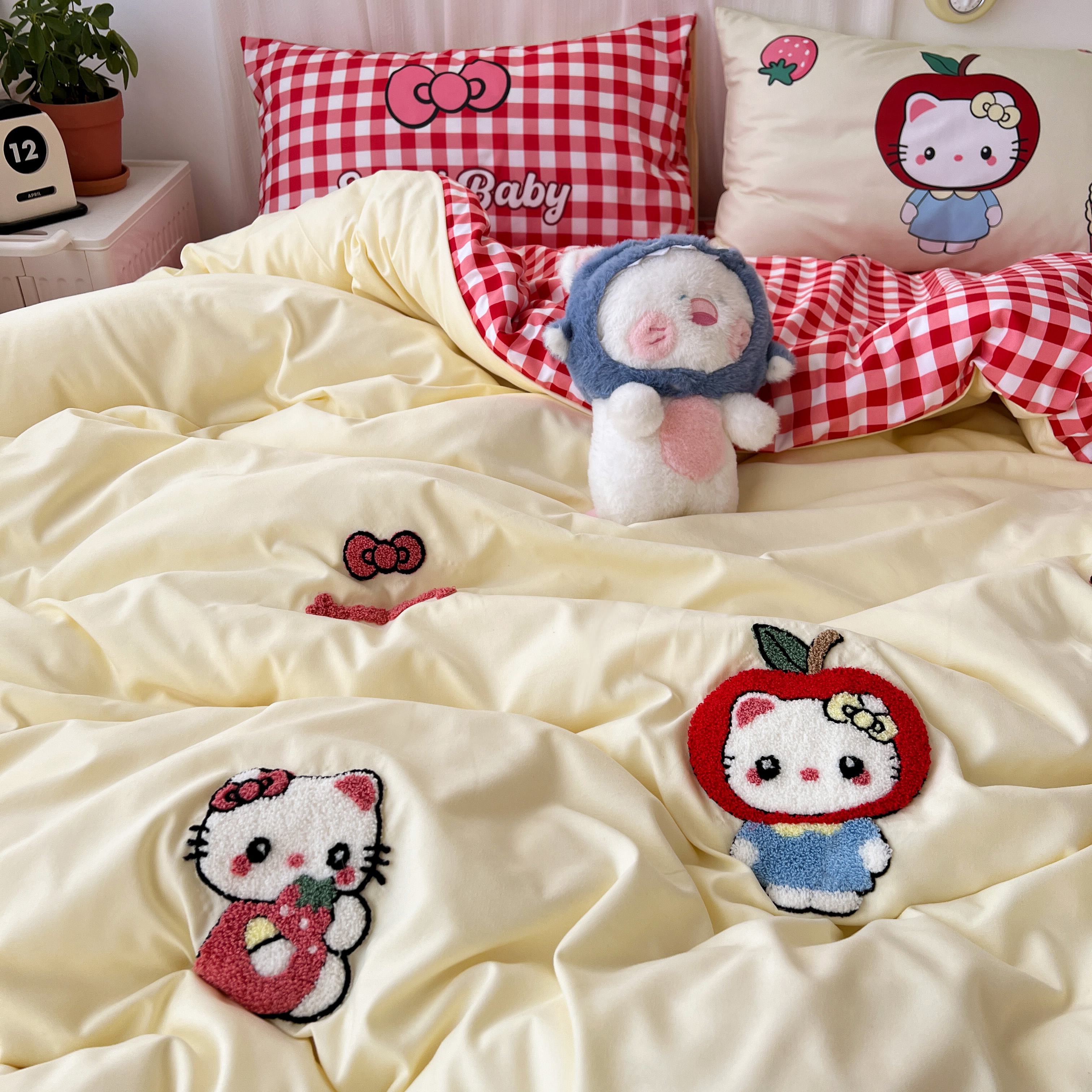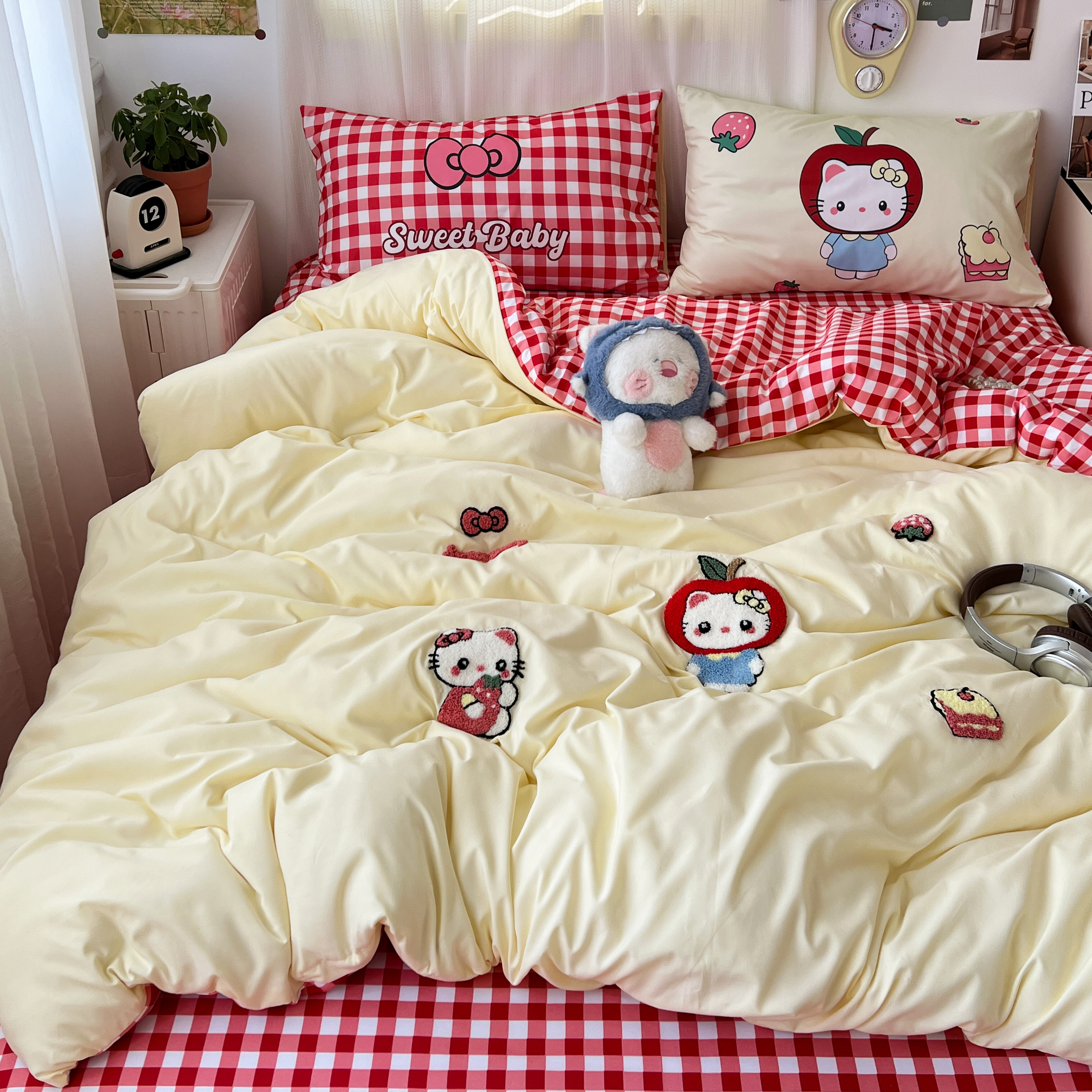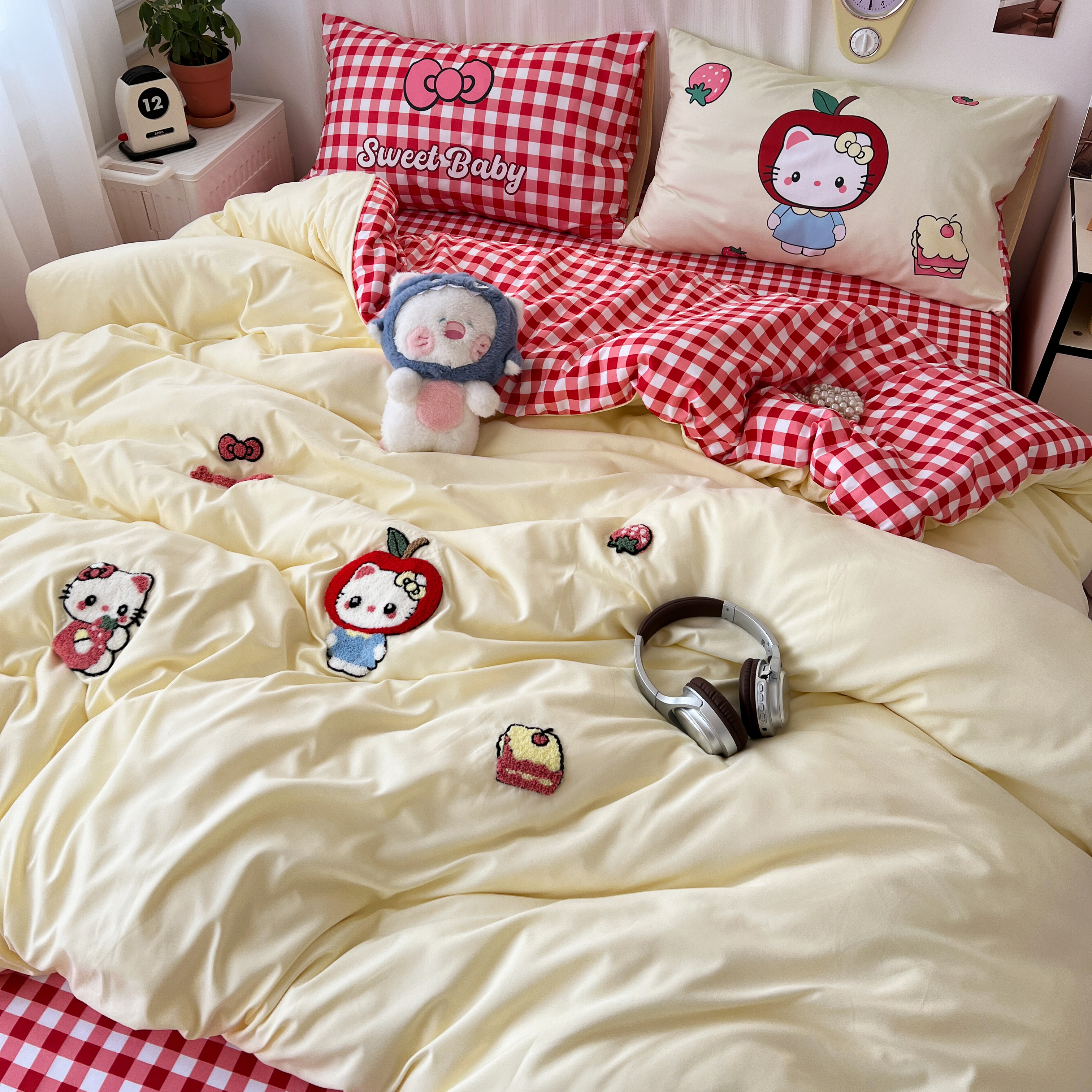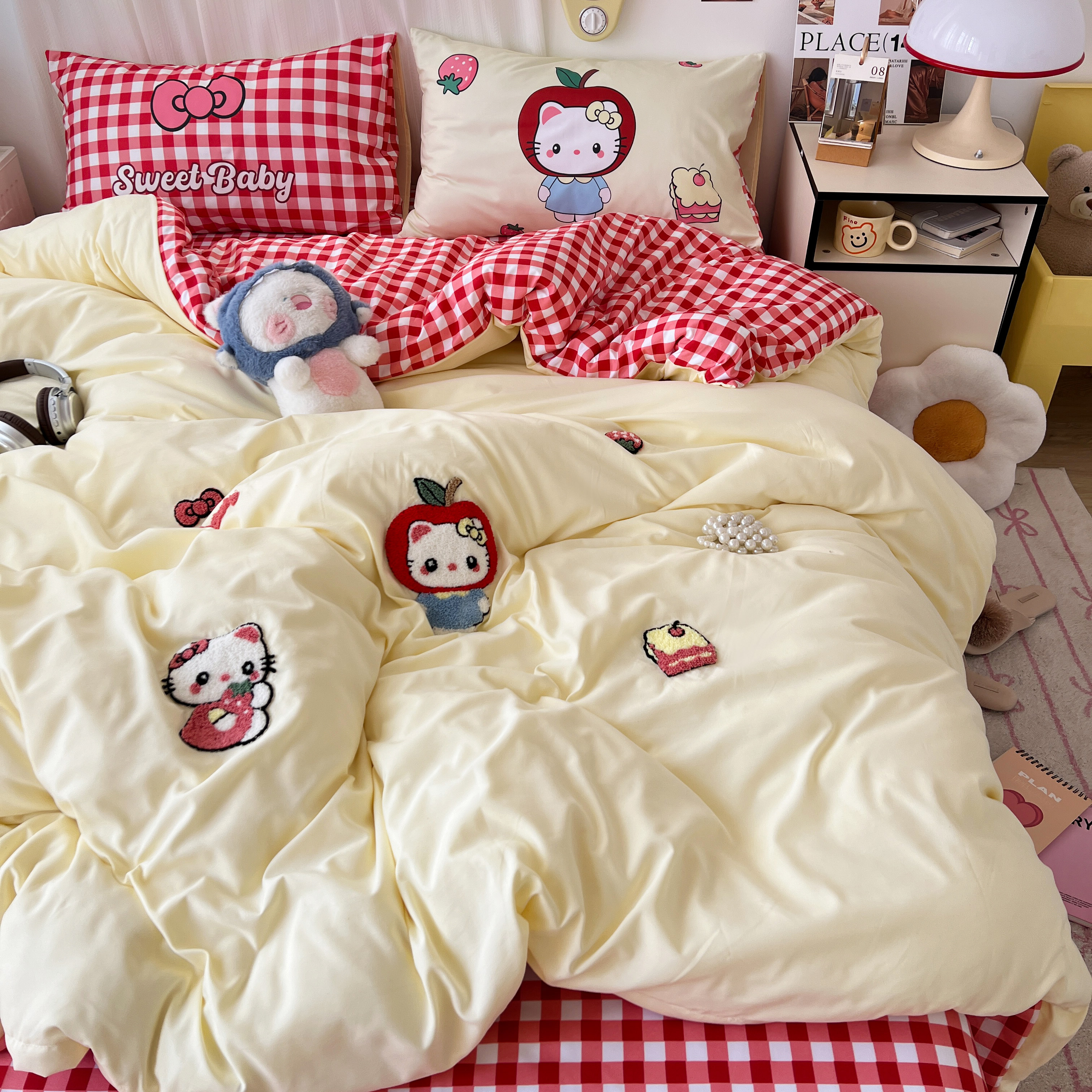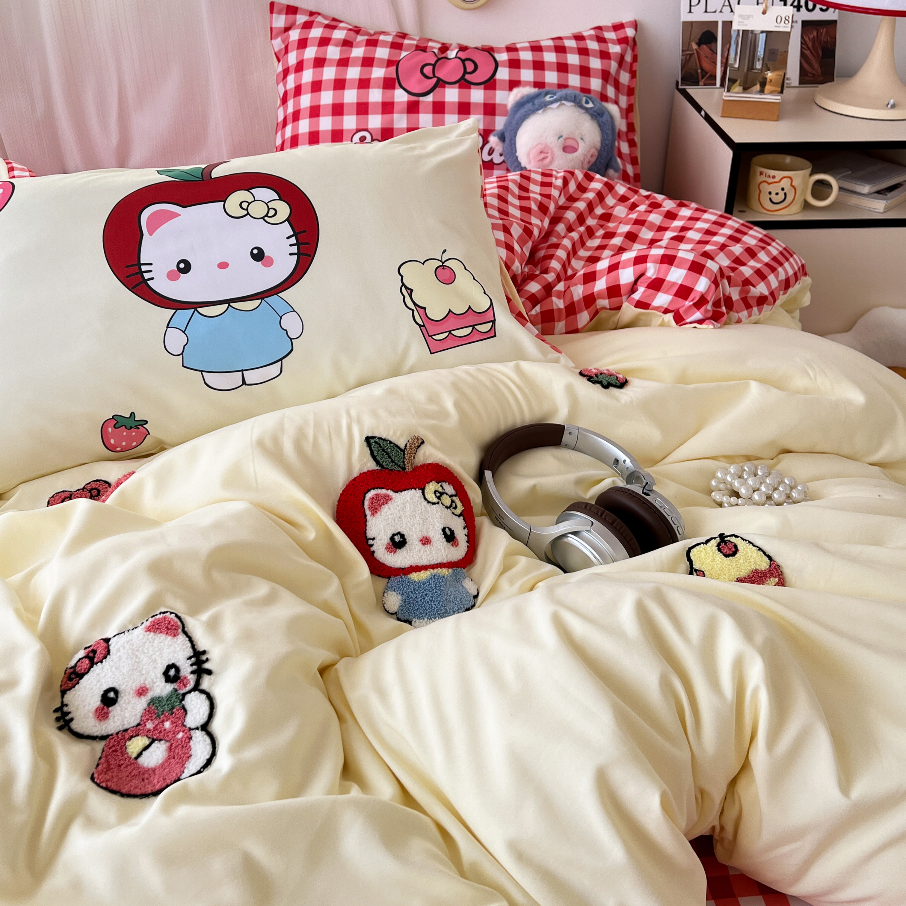 一霖家纺 2025新款高克重云朵棉数码印花+毛巾绣四件套 苹果猫