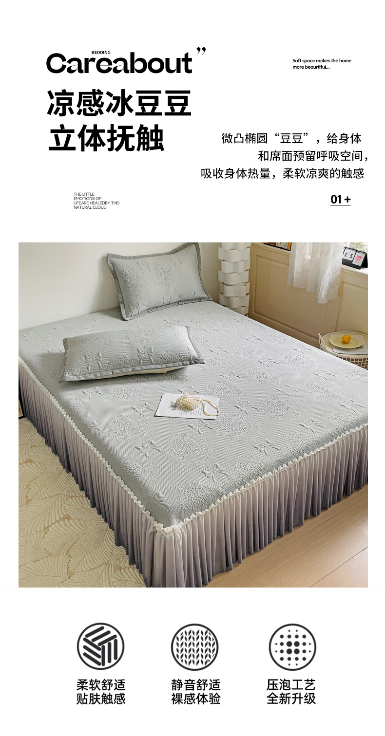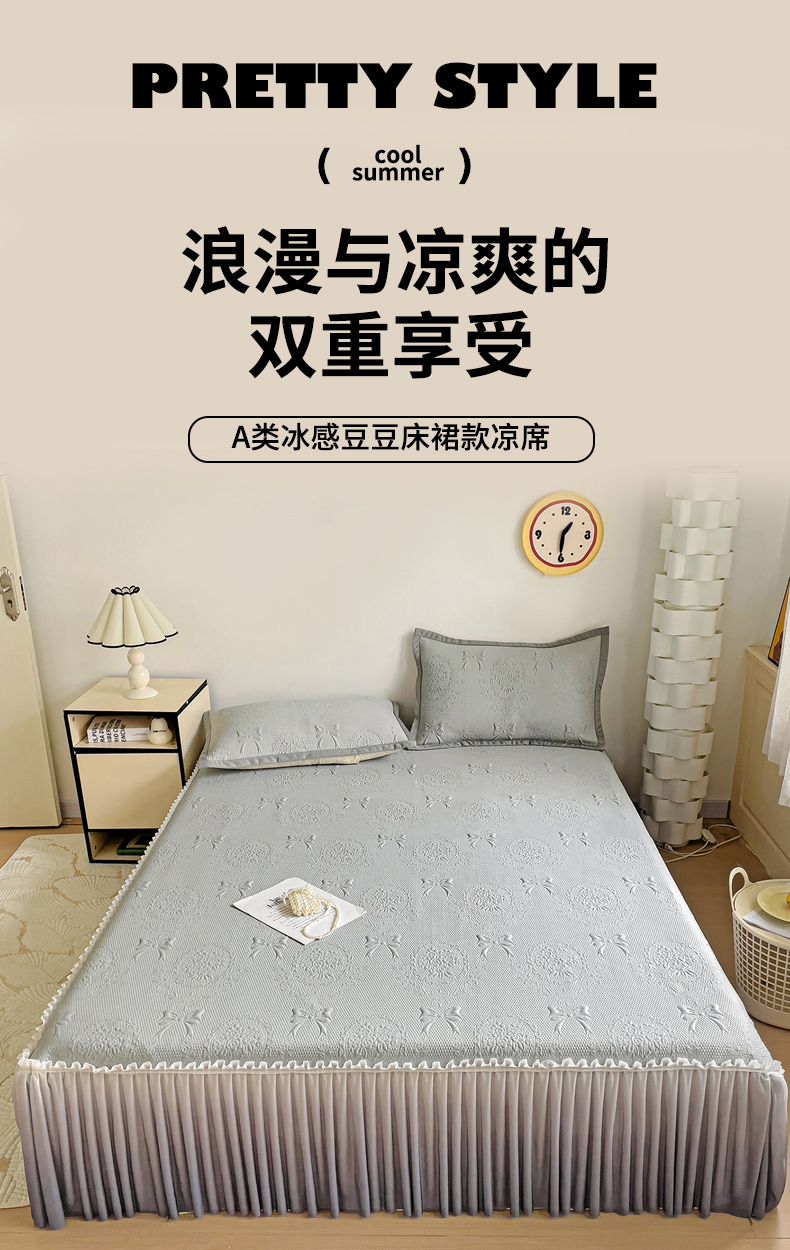 富馨莱 2025春夏新款公主仙女风480克PE凉感凉豆豆床裙凉席三件套 蝴蝶结-灰床裙款