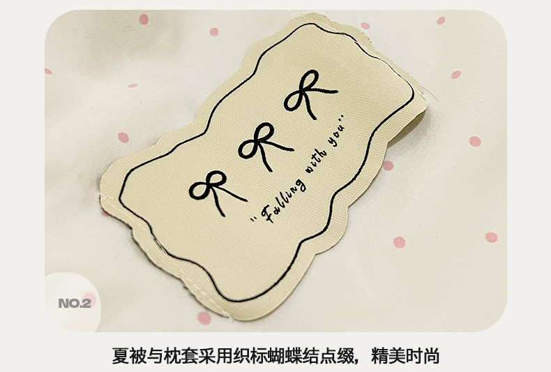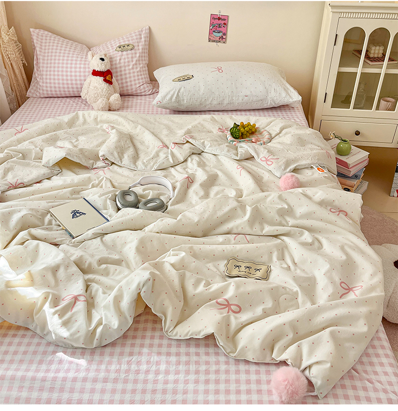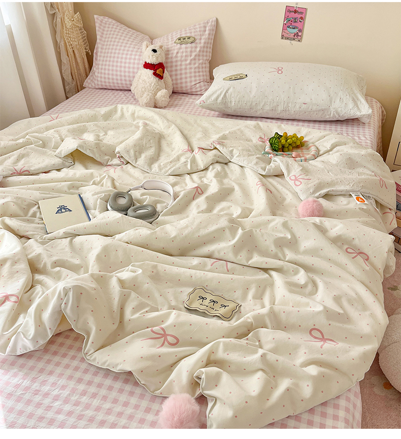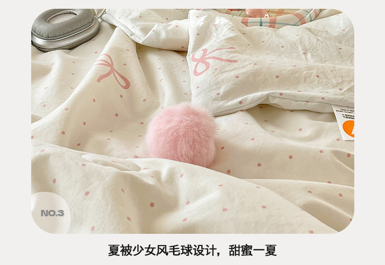 商品名称:桃心家居 2025新款A类ins云柔水洗棉大豆织标蝴蝶结毛球少女单夏被夏被四件套系列 粉果气泡