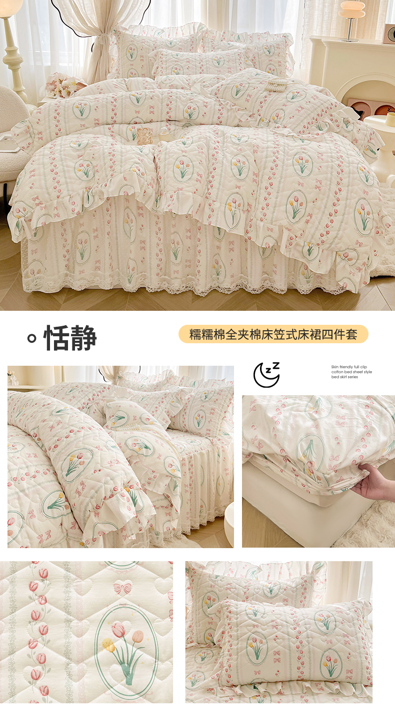 • 91家纺网 家纺一手货源 找家纺 宜凡家纺 2025新款糯糯棉全夹棉床笠式床裙四件套 恬静