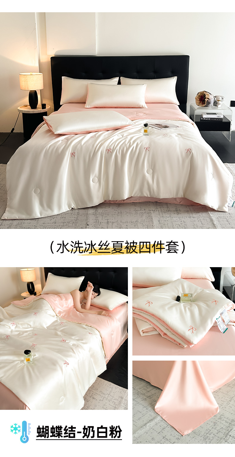 • 91家纺网 家纺一手货源 找家纺 绒世界 2025春夏水洗冰丝夏被四件套满绣系列 蝴蝶结-奶白粉