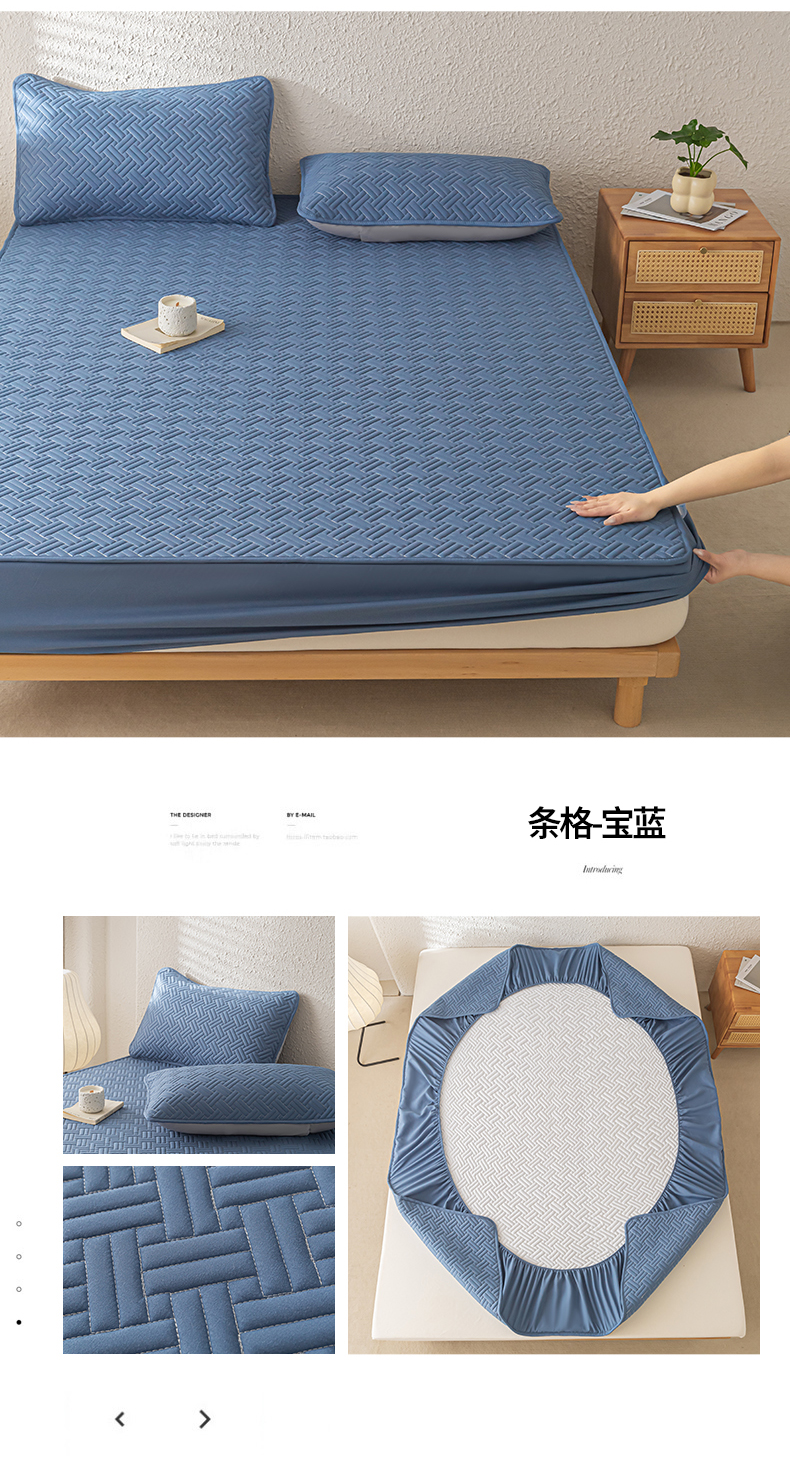 欧邦 2025新款四季款纯色水洗棉夹棉床笠床垫保护罩-场景一 条格-宝蓝