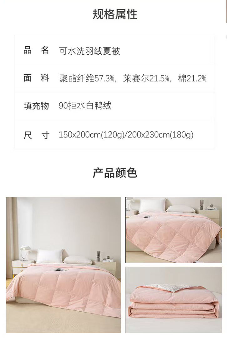 商品名称:圣梦莱羽绒家纺 2025春夏新款可水洗羽绒夏被 90拒水白鸭绒被子被芯羽绒(假一赔十万元) 浅绿+天云灰