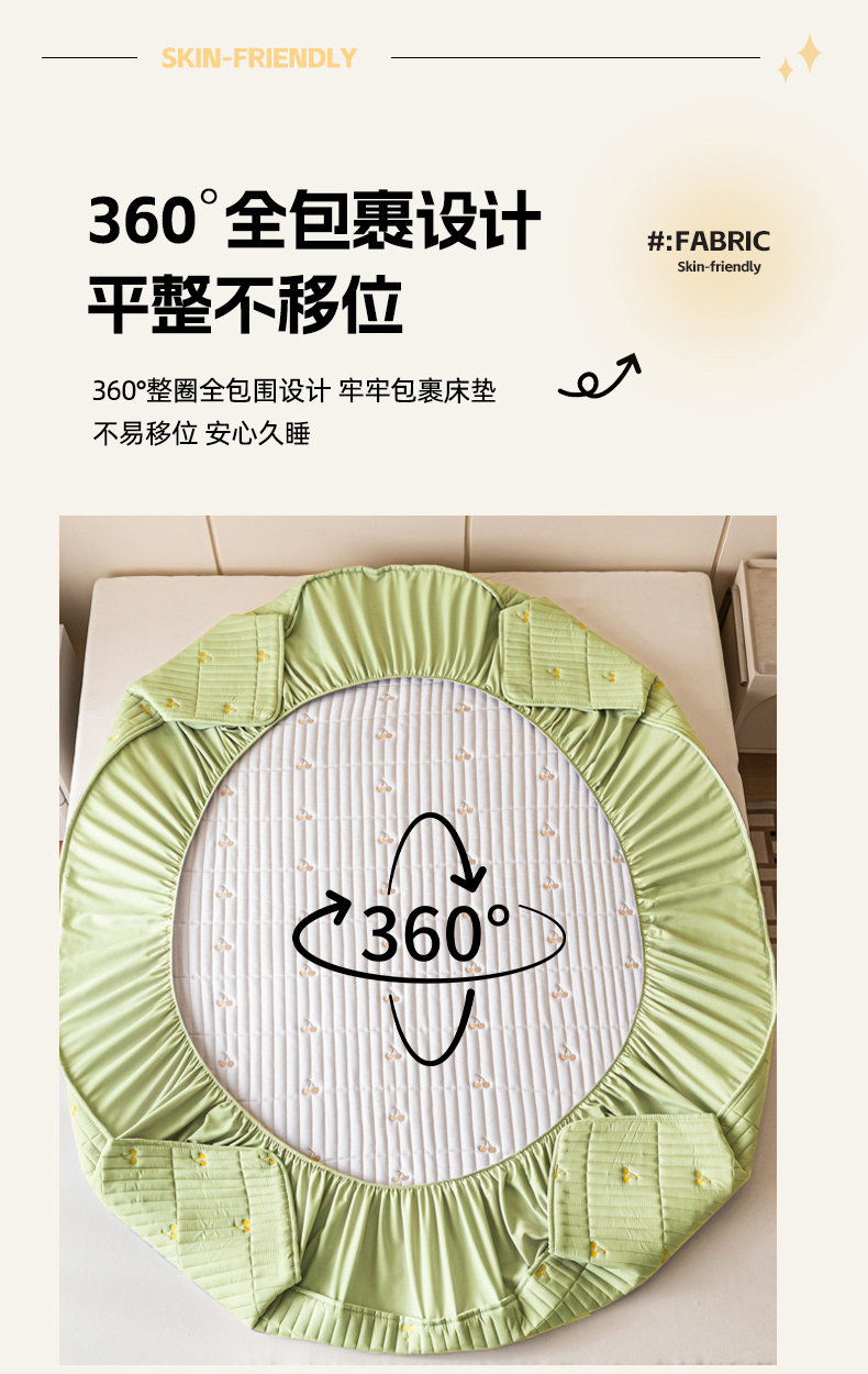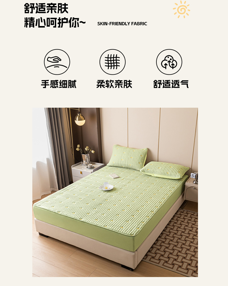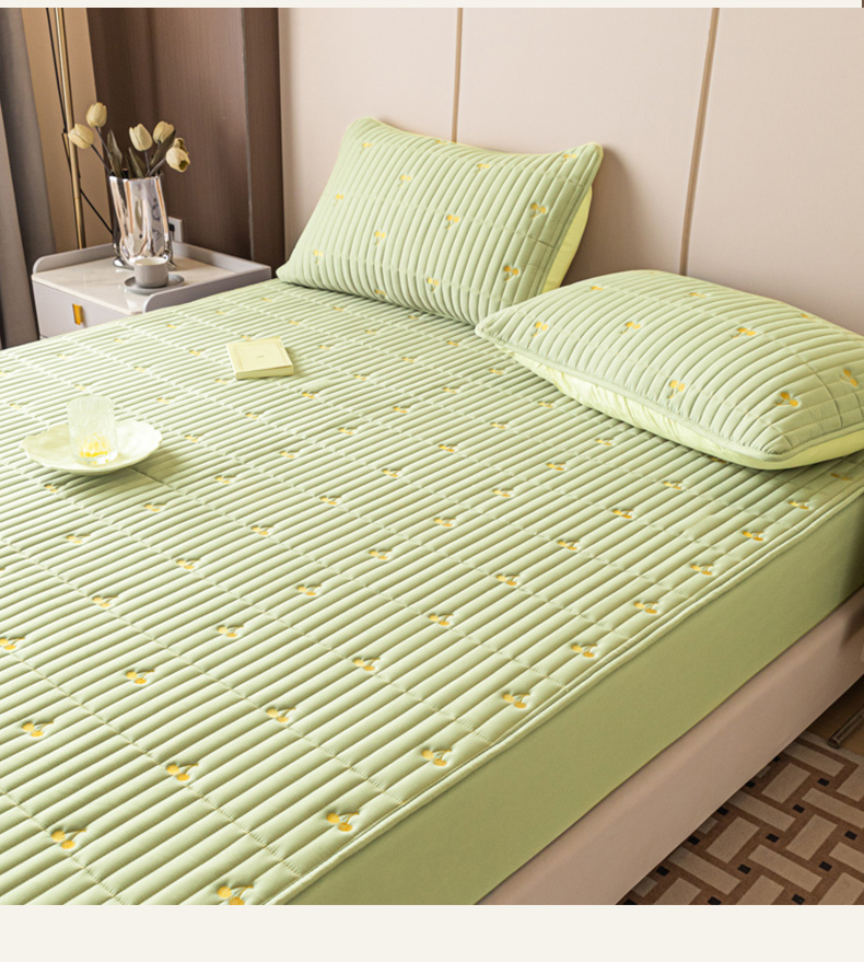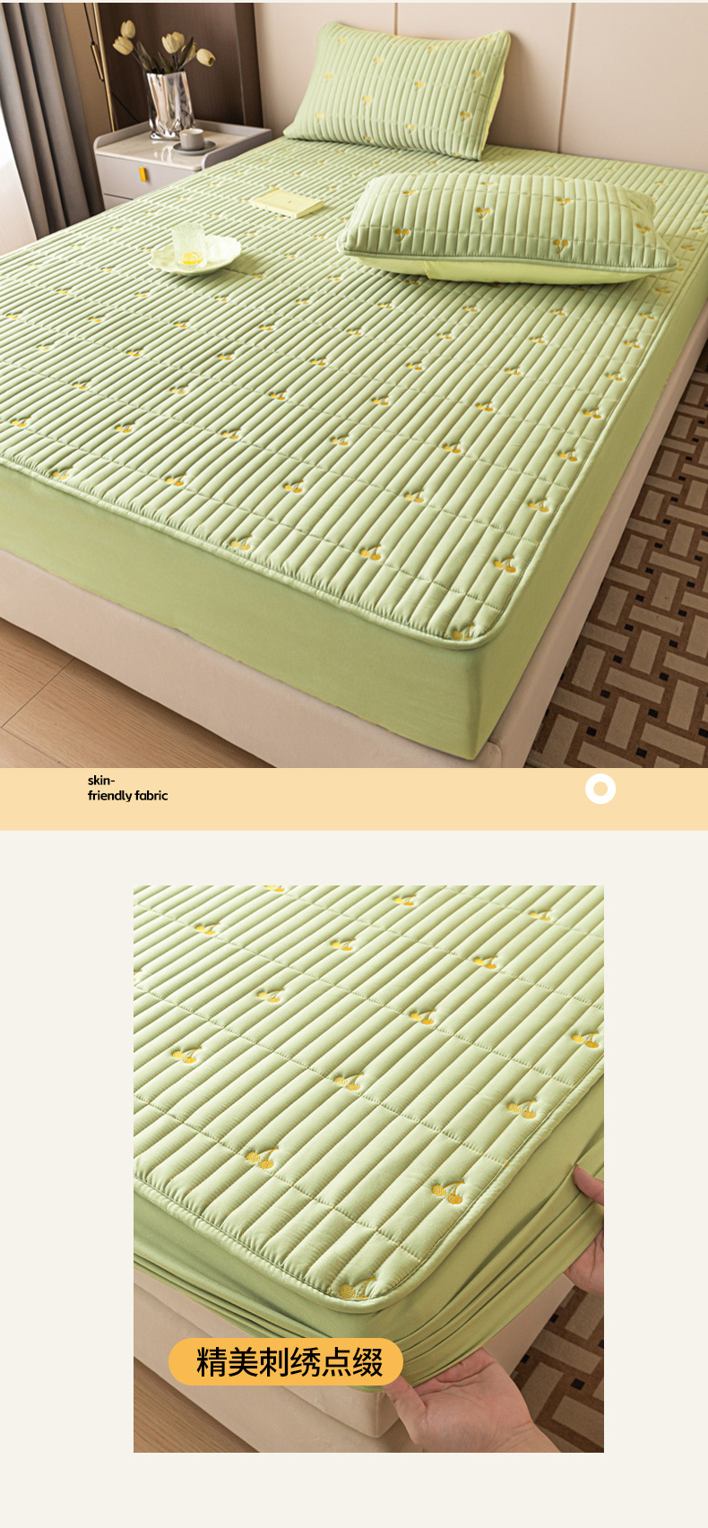 • 91家纺网 家纺一手货源 找家纺 暖季家纺 2025新款A类亲肤面料夹棉绣花床笠-不防水款 小樱桃-果绿-普通款