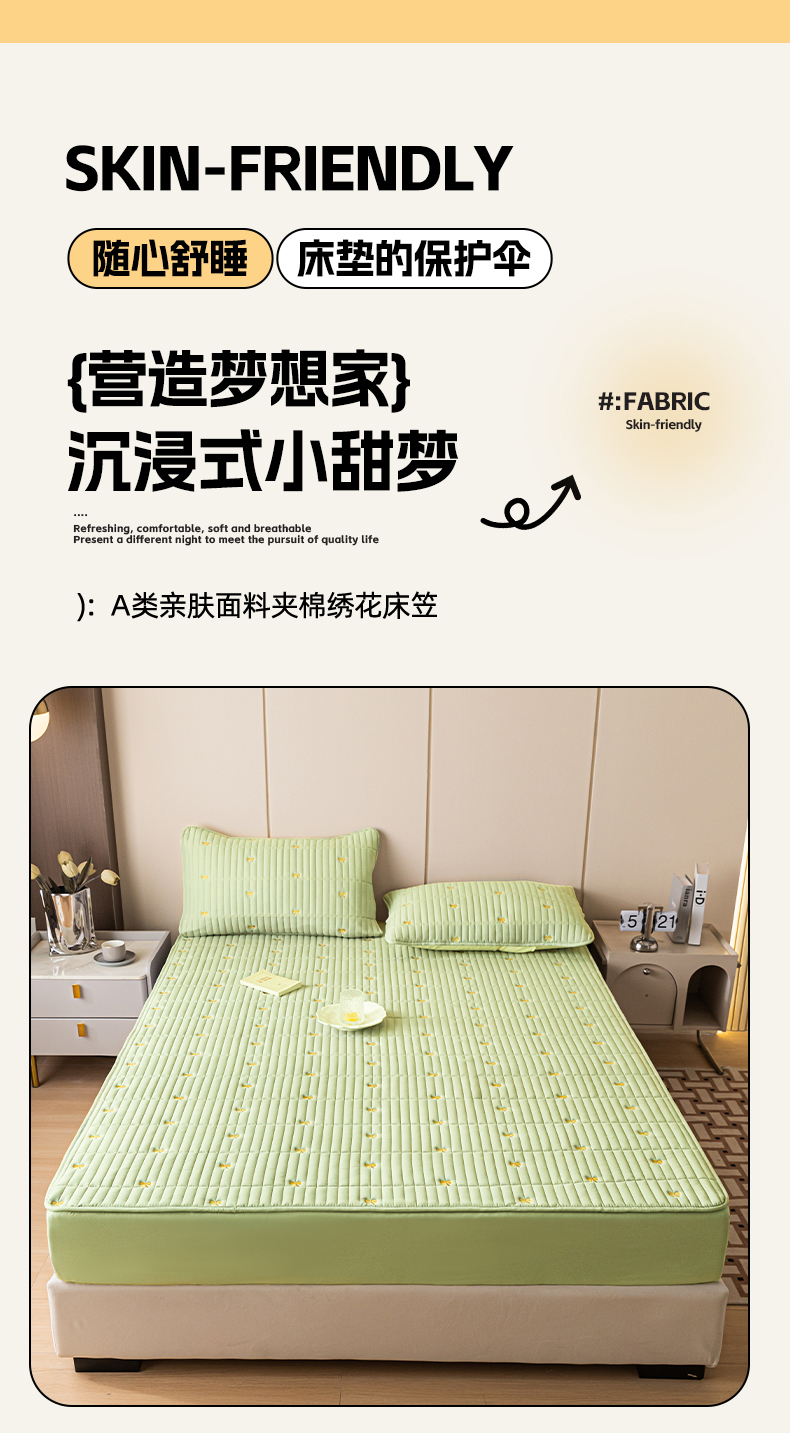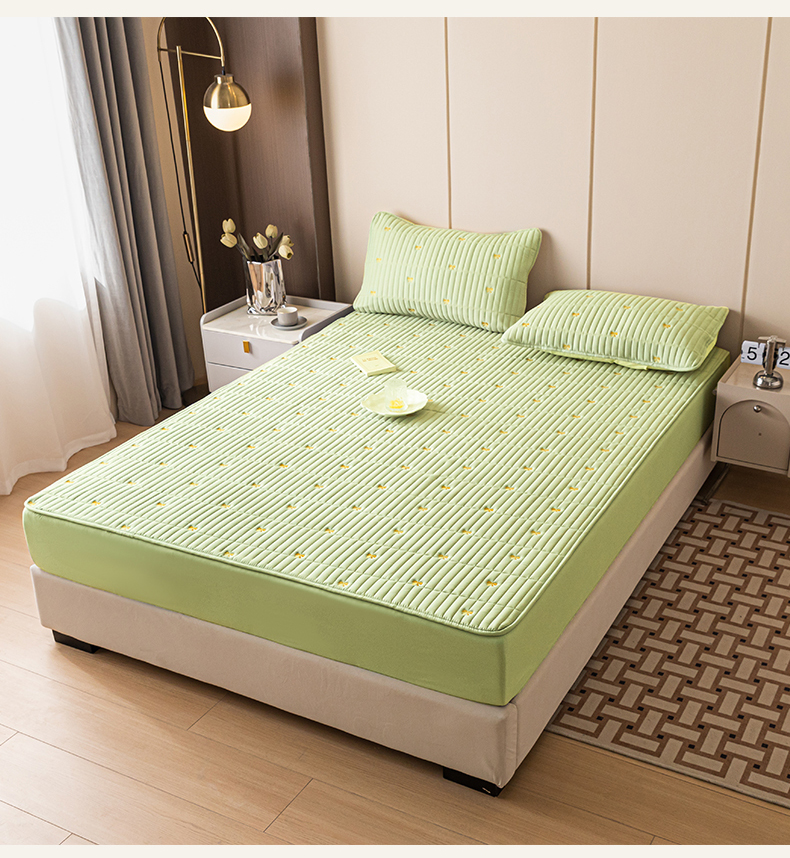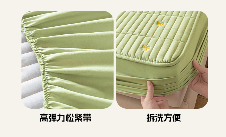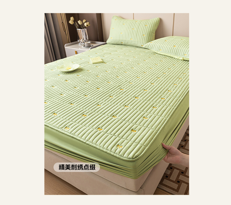 • 91家纺网 家纺一手货源 找家纺 暖季家纺 2025新款A类亲肤面料夹棉绣花床笠-防水款 小蝴蝶结-果绿-防水款