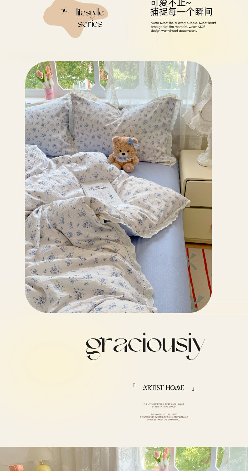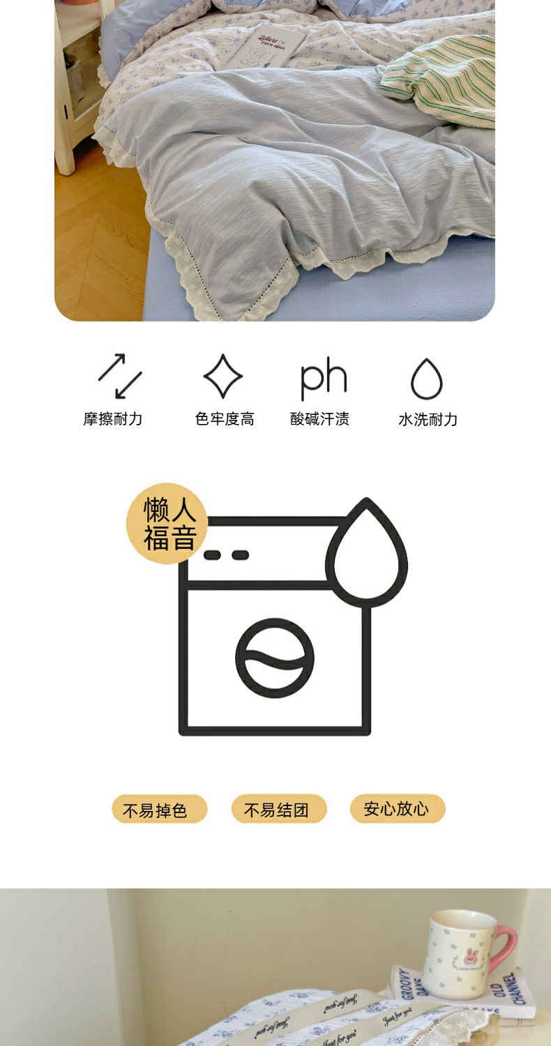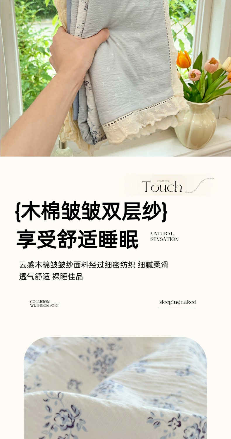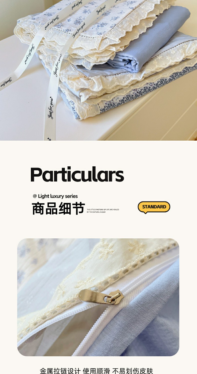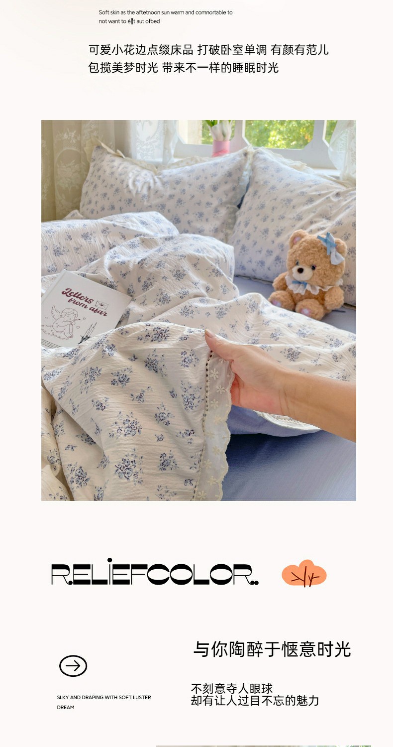 当前位置: 91家纺网 > 商品网购 > 床品套件 > 四件套 > 其它四件套 > 优尚佳生活馆 2025新款云感木棉皱皱双层纱全棉镂空花边四件套(提供买家秀) 蓝雪花语
