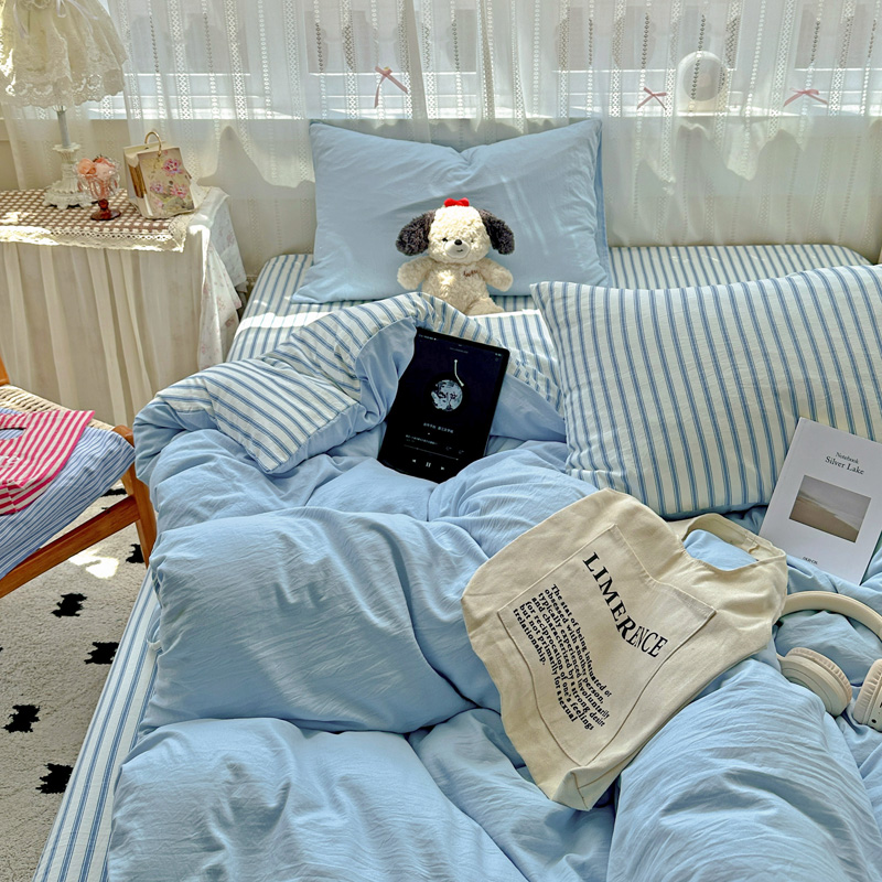 • 91家纺网 家纺一手货源 找家纺 繁花家居 2025新款高克重水洗棉云朵棉条纹撞色系列四件套 天空蓝+蓝条