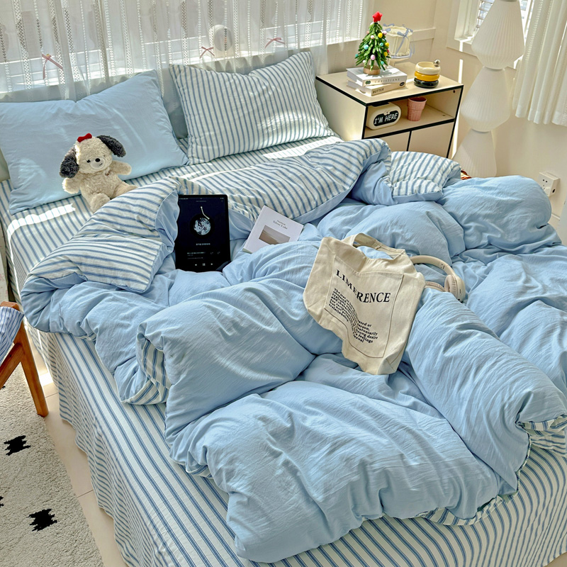 繁花家居 2025新款高克重水洗棉云朵棉条纹撞色系列四件套 天空蓝+蓝条