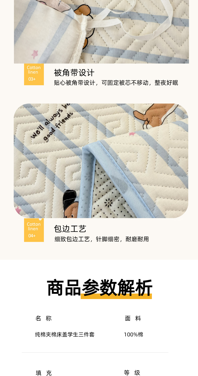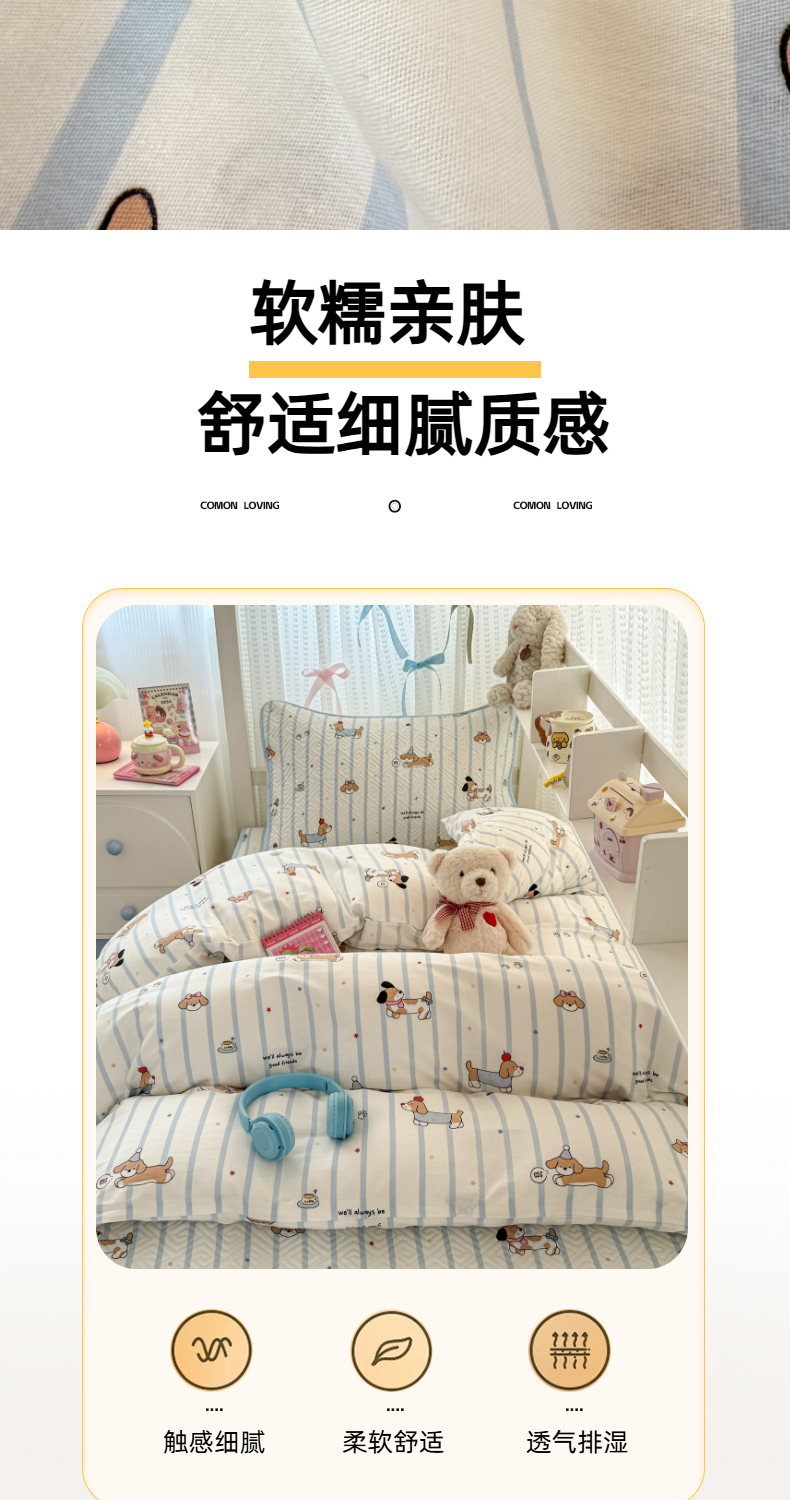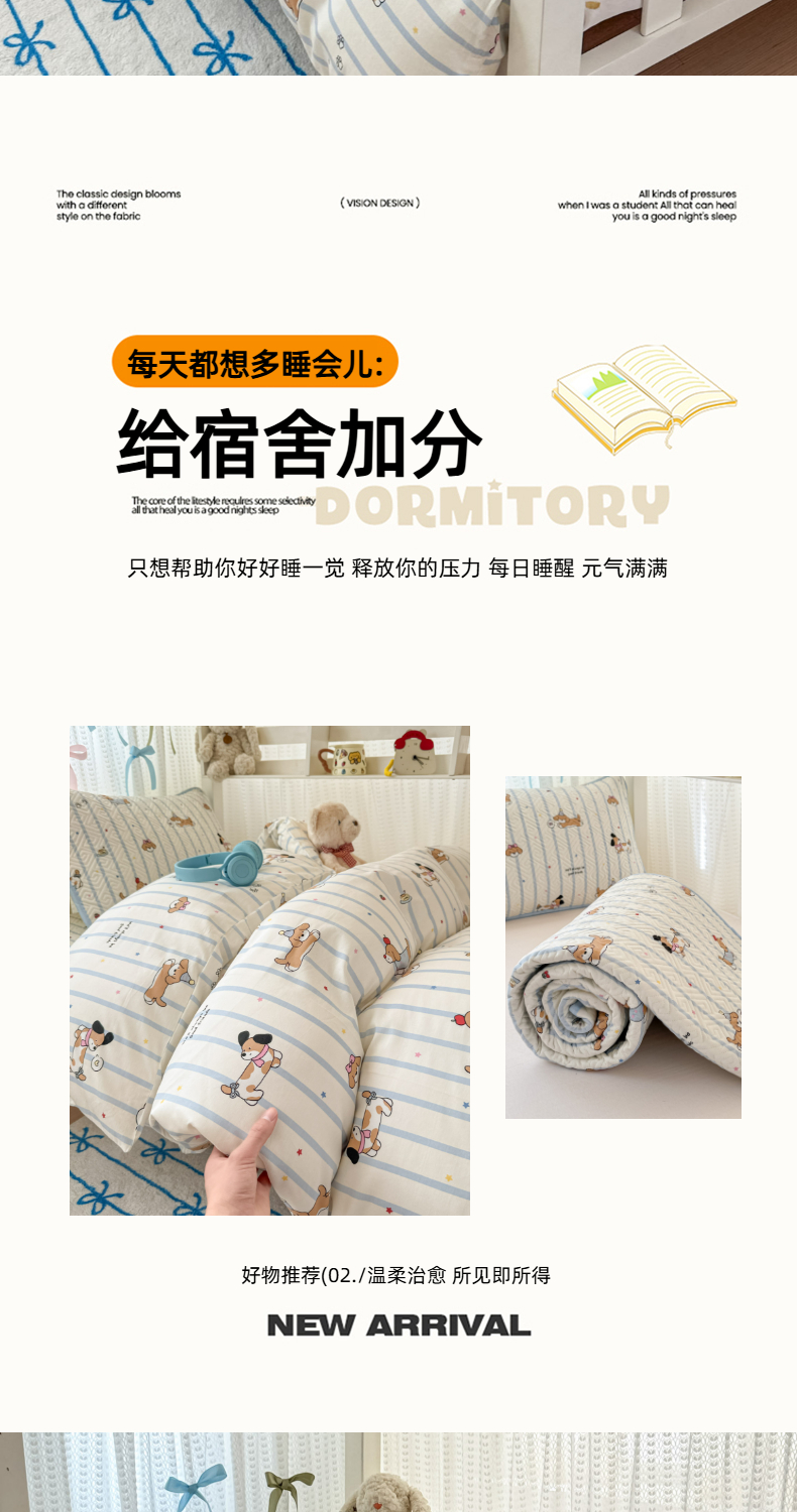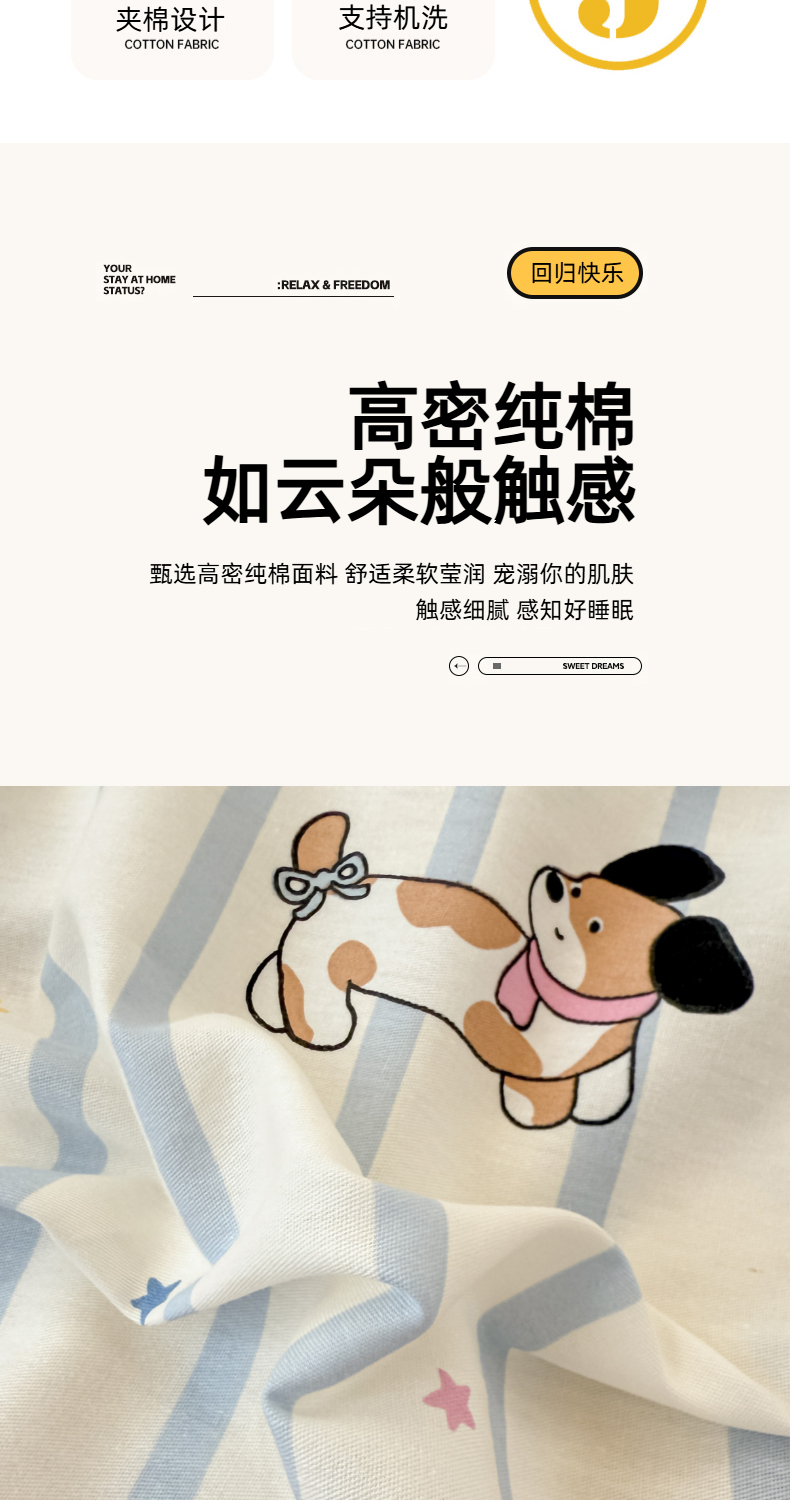 简宜家居(朝初家纺) 2025新款纯棉夹棉床盖学生三件套 小狗条纹 -平铺床盖