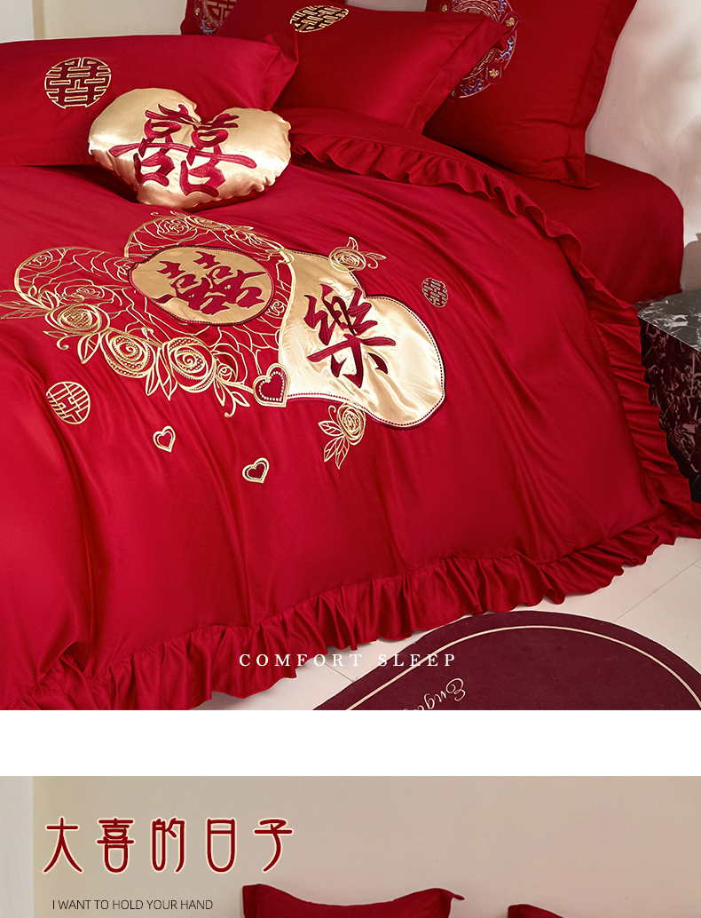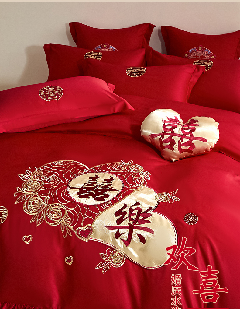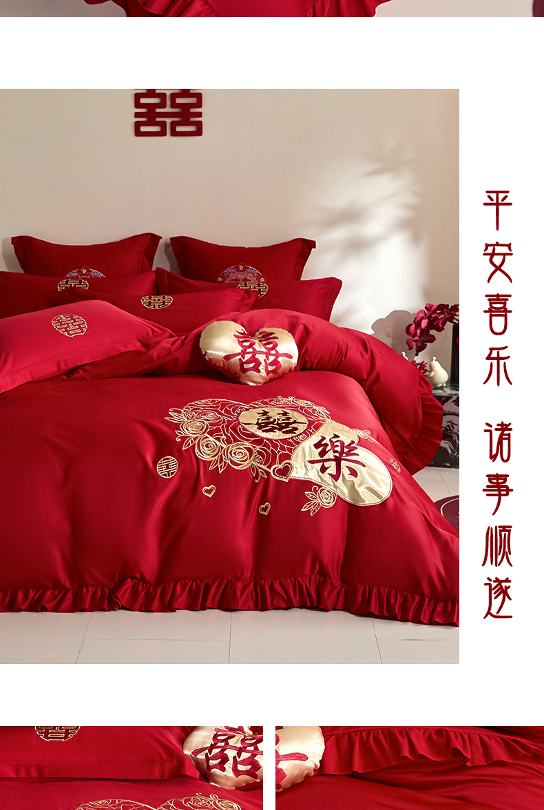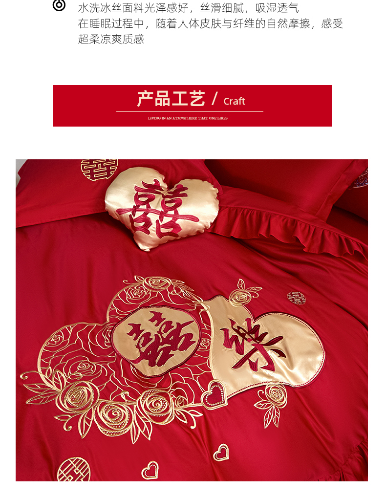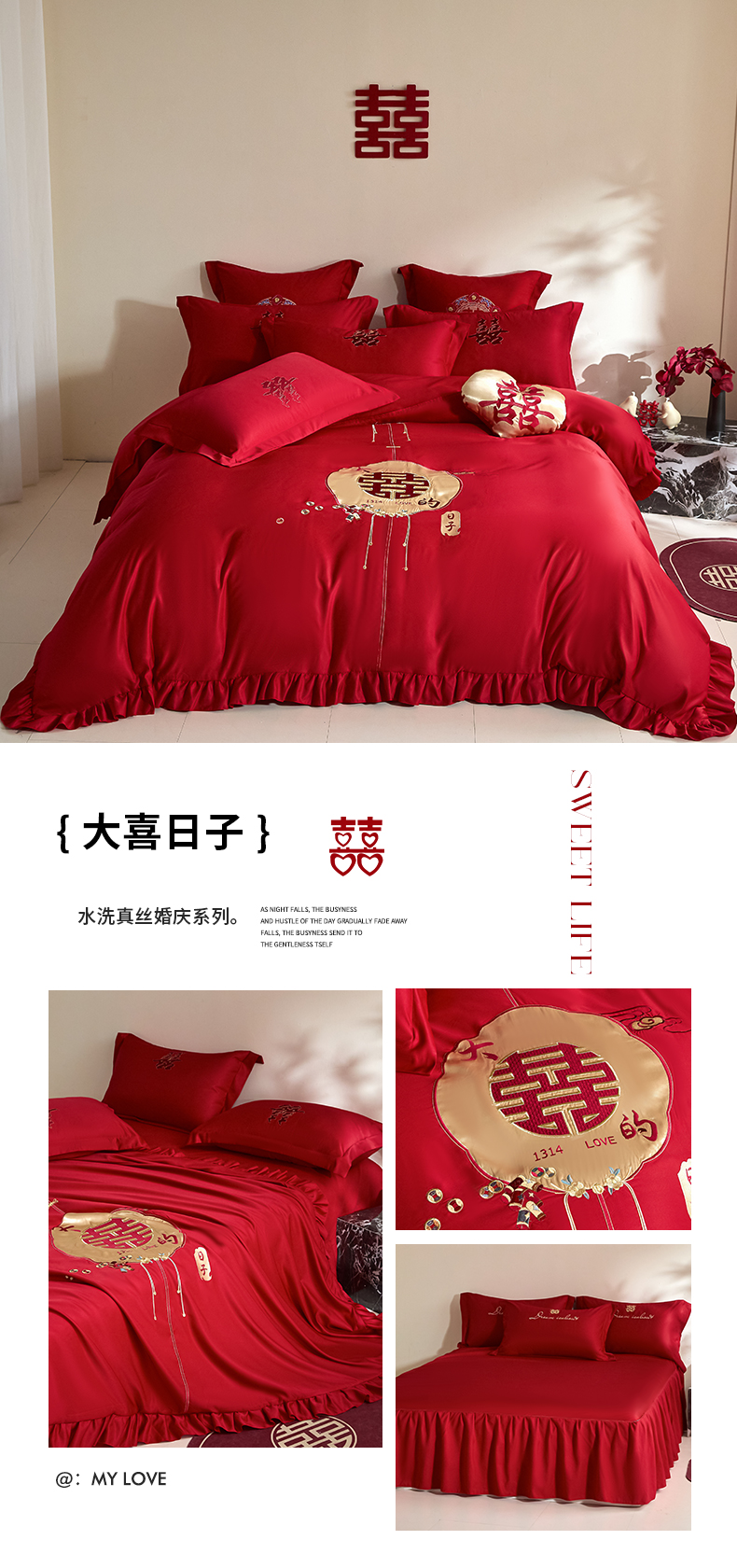当前位置: 91家纺网 > 商品网购 > 床品套件 > 四件套 > 婚庆四件套 > 玉雅家纺 2025新款水洗冰丝刺绣床裙款婚庆四件套 床裙款-心相印