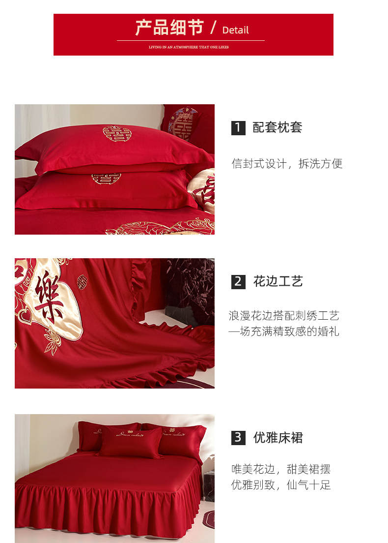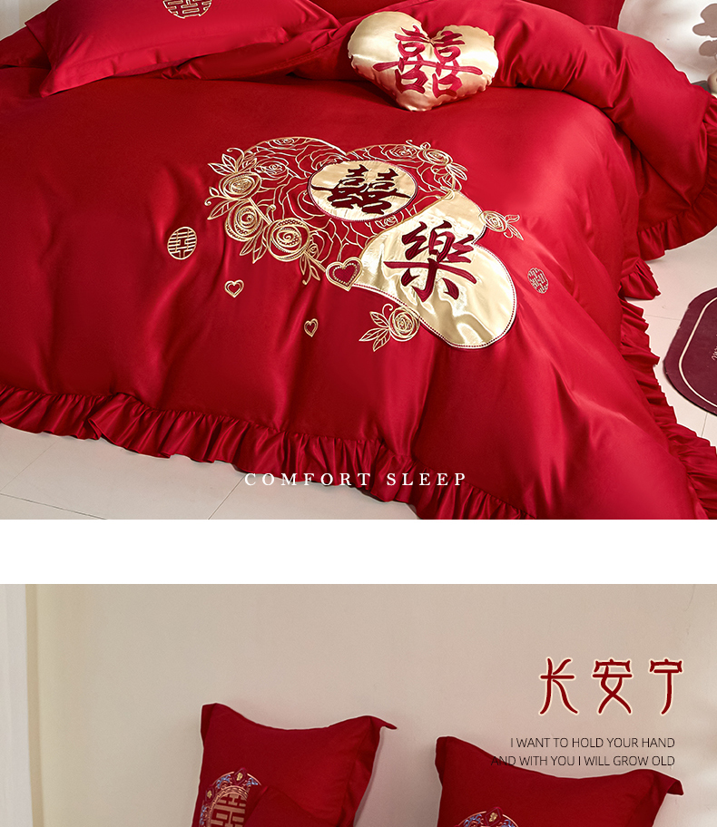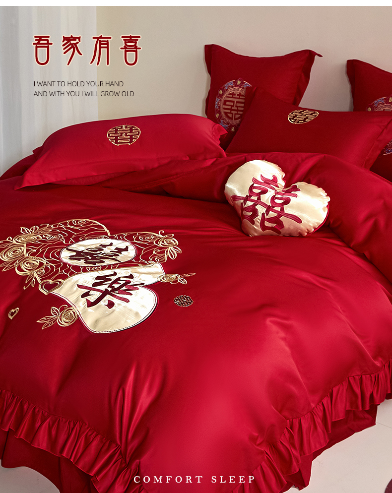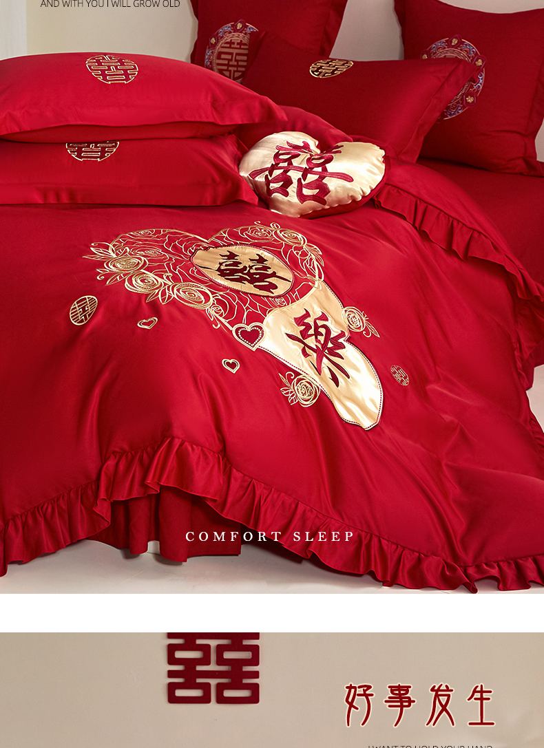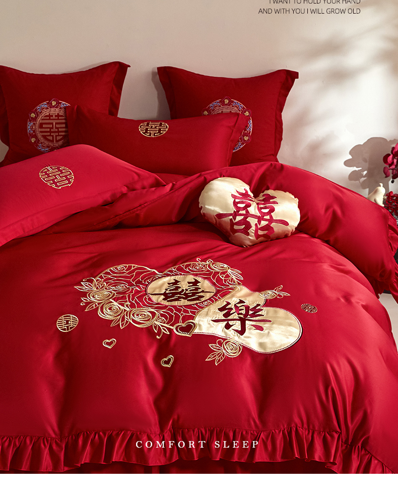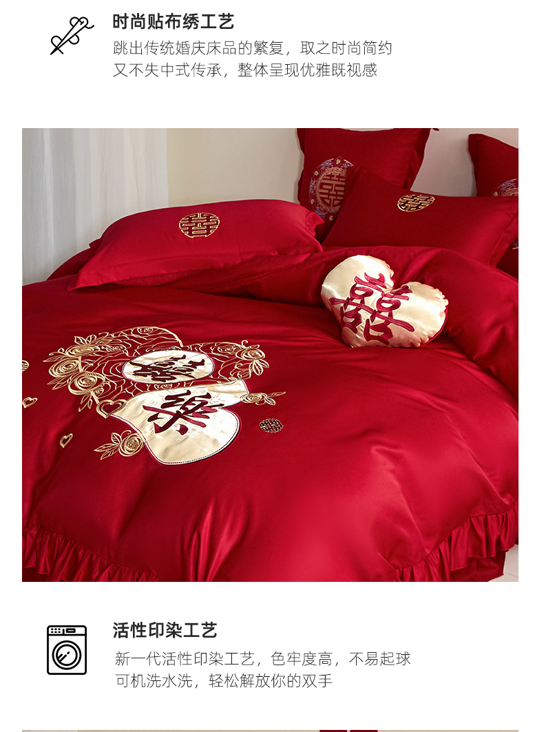 当前位置: 91家纺网 > 商品网购 > 床品套件 > 四件套 > 婚庆四件套 > 玉雅家纺 2025新款水洗冰丝刺绣床裙款婚庆四件套 床裙款-心相印