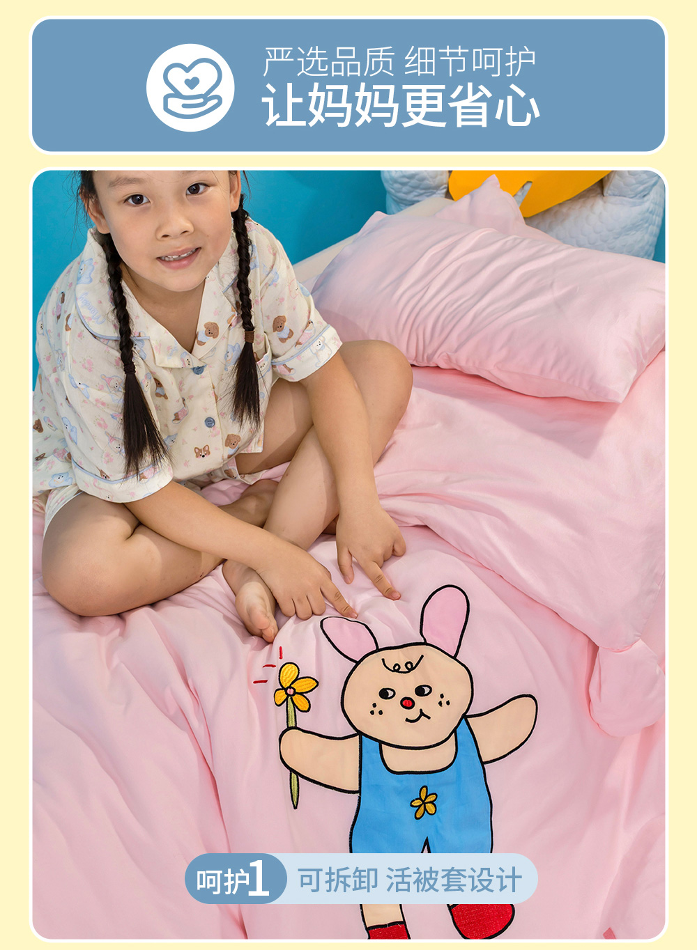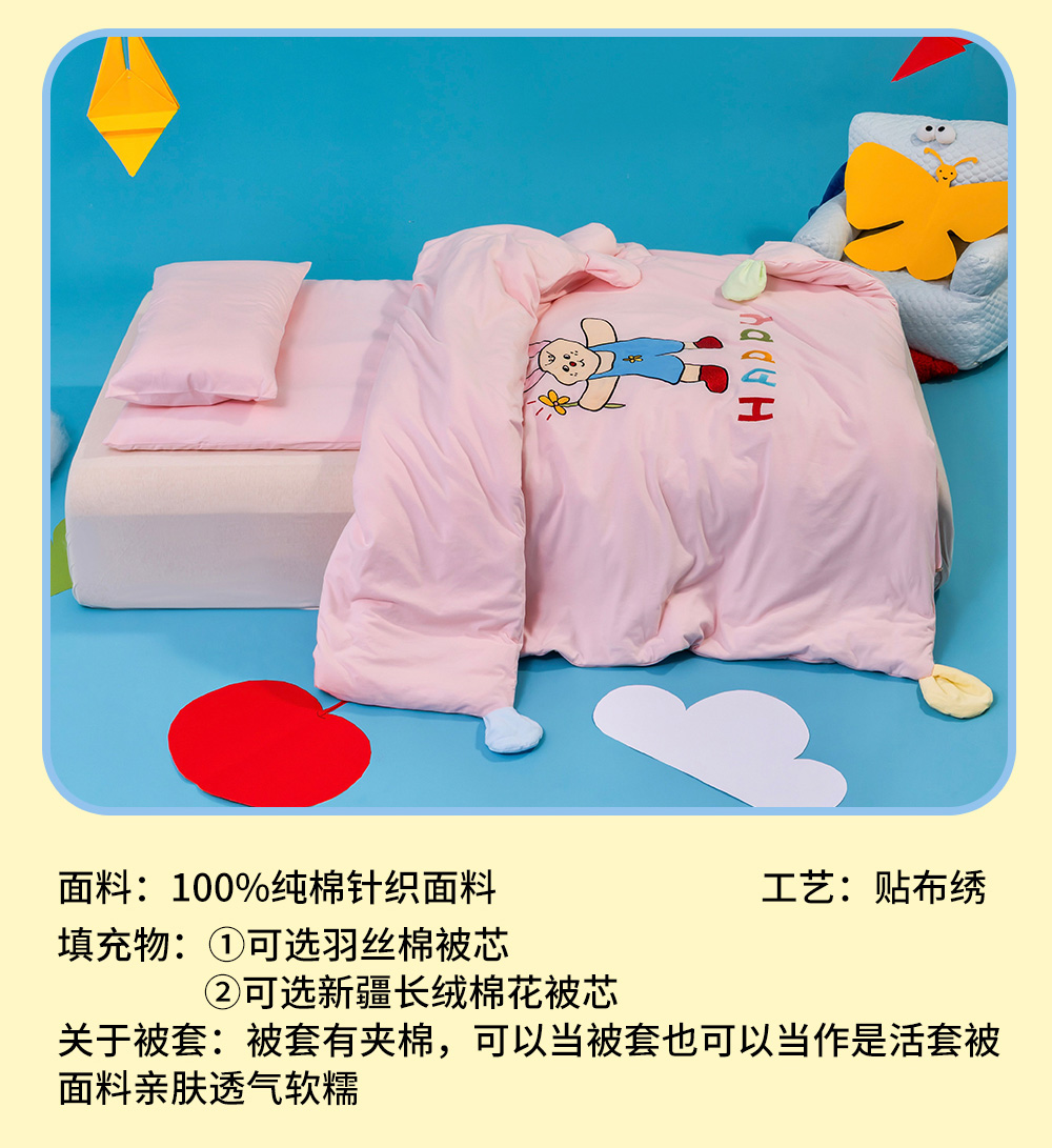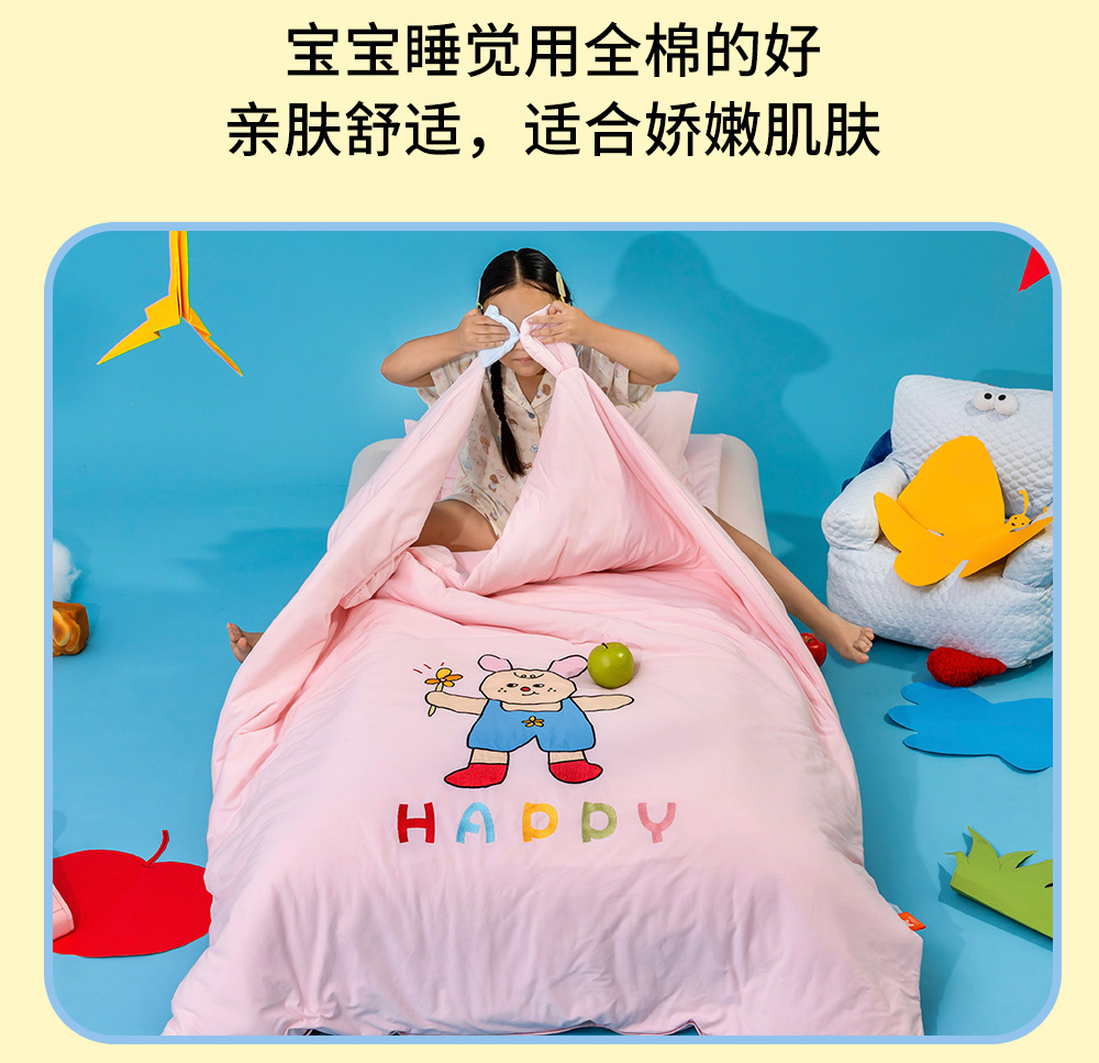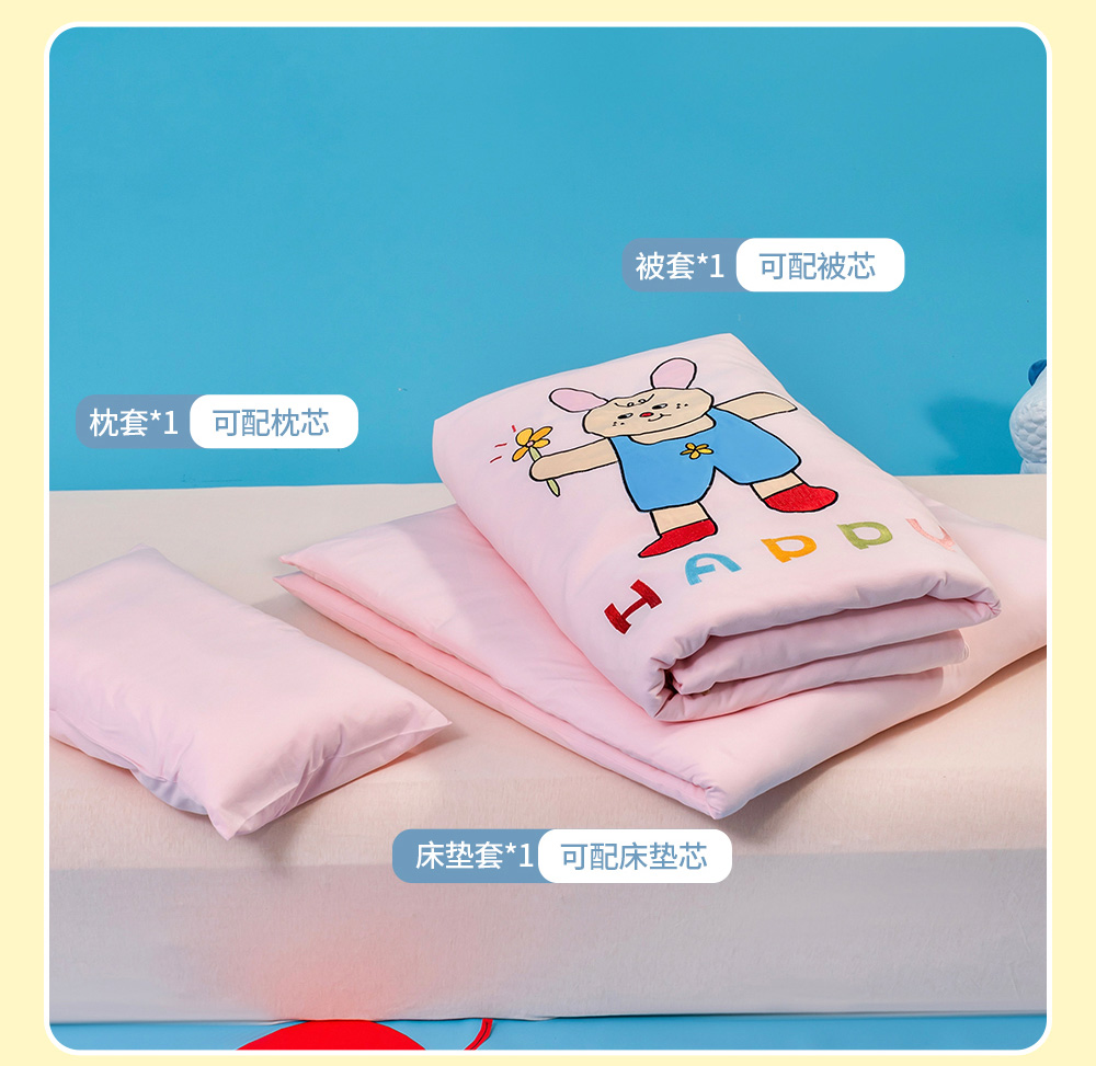 当前位置: 91家纺网 > 商品网购 > 床品套件 > 三件套 > 喜多兔儿童家纺 2025新款小梦幻纯棉针织棉紧密纺绣花幼儿园被子三件套 粉色梦幻小兔