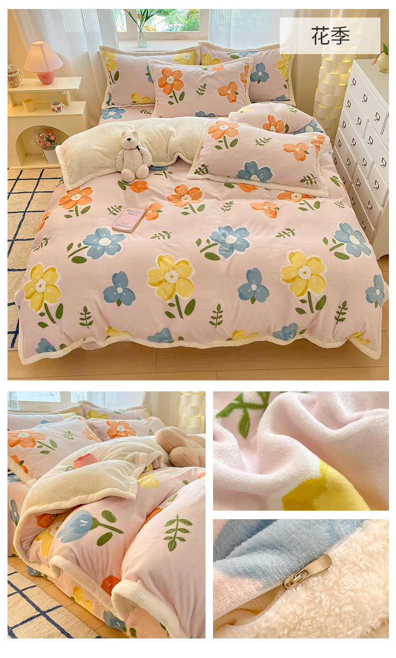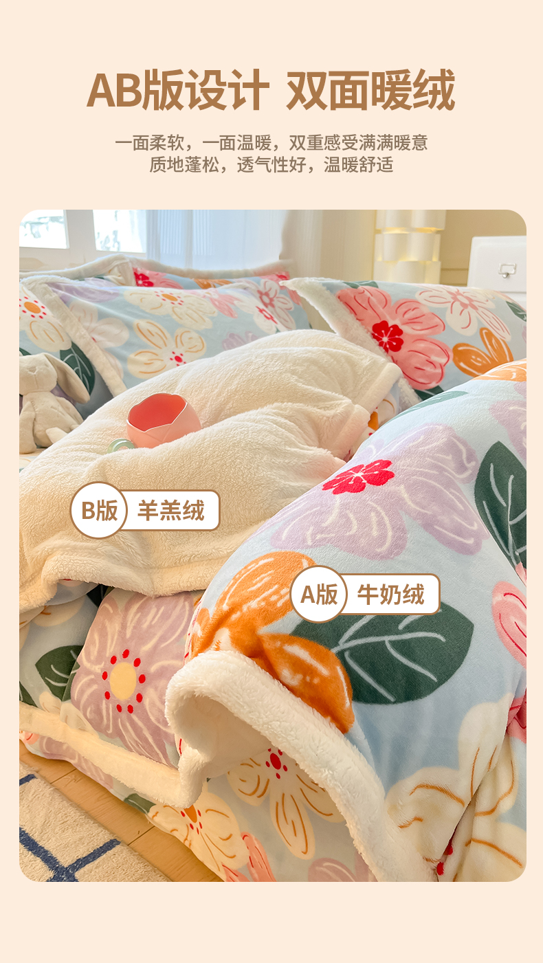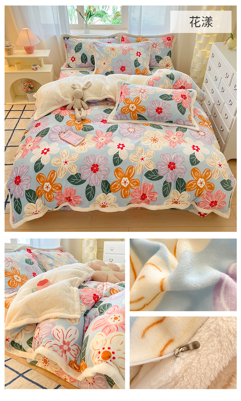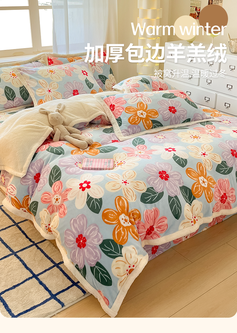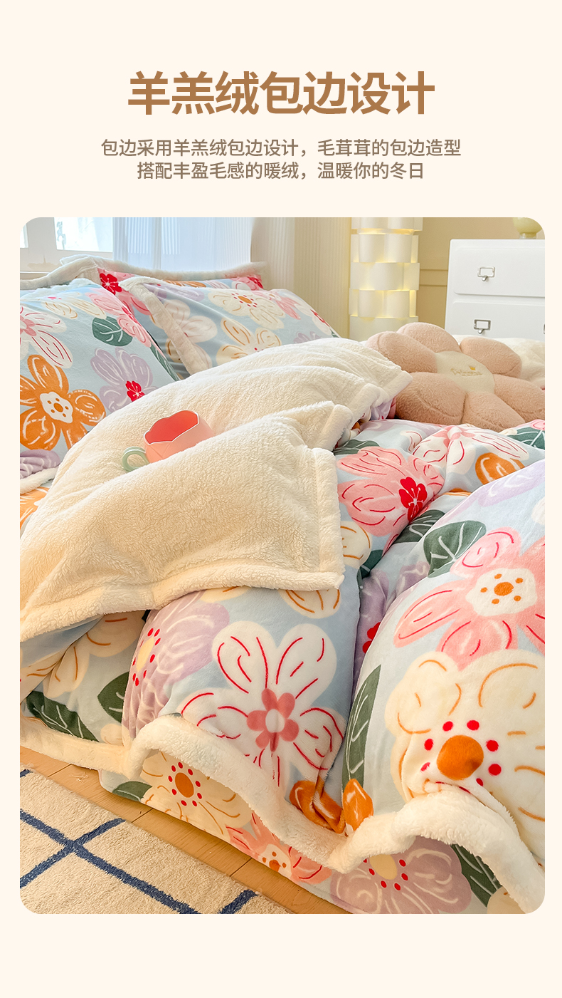当前位置: 91家纺网 > 商品网购 > 床品套件 > 四件套 > 羊羔绒四件套 > 娜朵家纺 2025新款加厚包边羊羔绒印花四件套 花漾