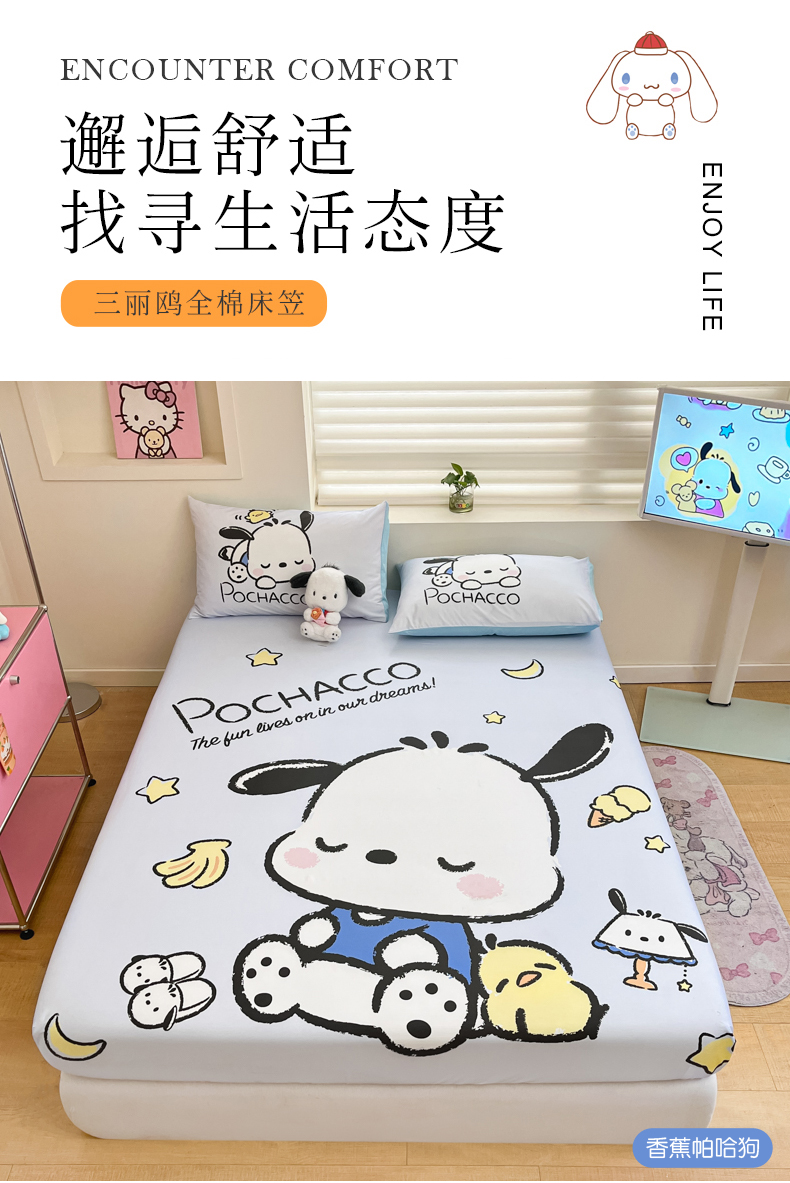 • 91家纺网 家纺一手货源 找家纺 金爱家 2025新款三丽鸥全棉床笠 棉单品-香蕉帕哈狗