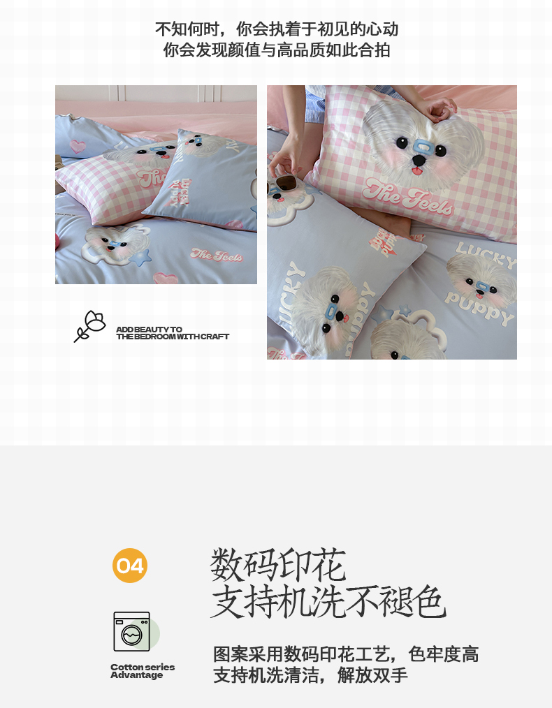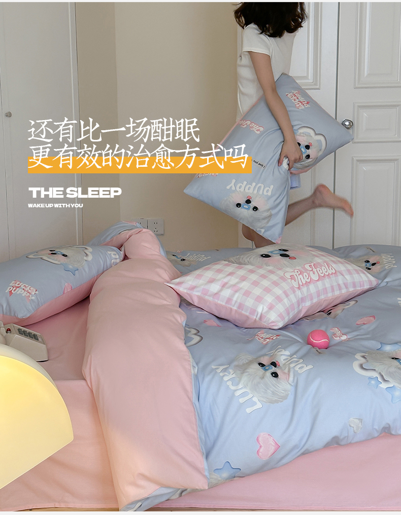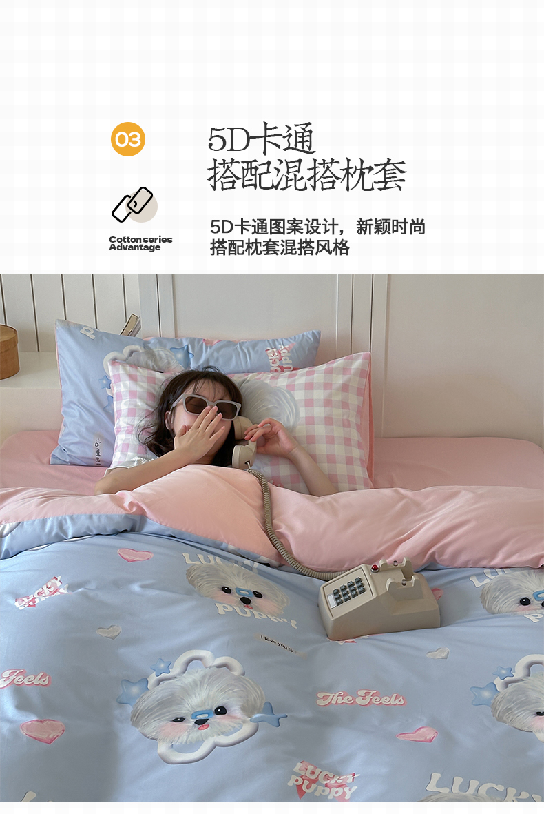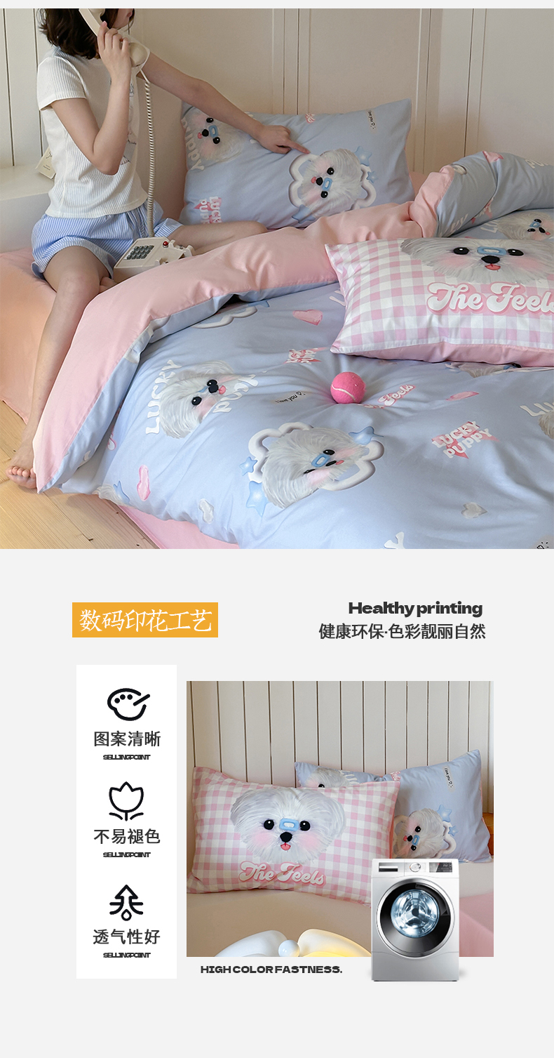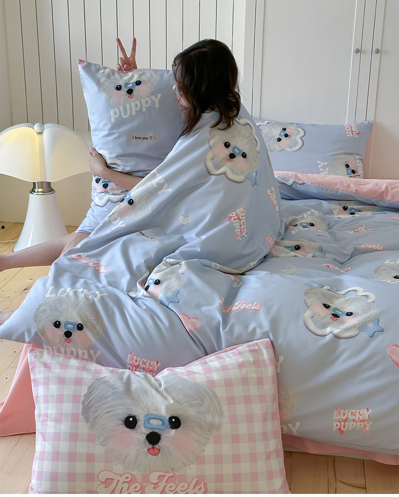 商品名称:桃子家居 2025新款纯棉数码印花5D卡通混搭可爱少女纯棉系列四件套 棉5D-甜美幸运狗