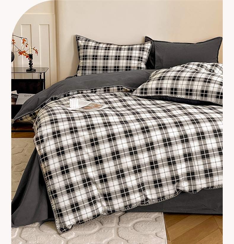 忆生活 2025秋冬全棉加厚磨毛贝壳边四件套格韵-黑