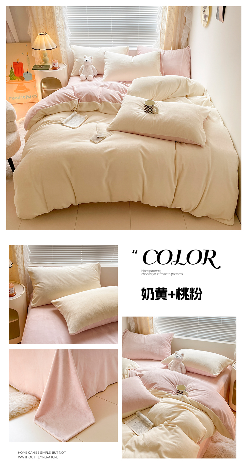 商品名称:蓝极人 2025新款纯色双拼牛奶绒四件套190克 米杏+奶咖