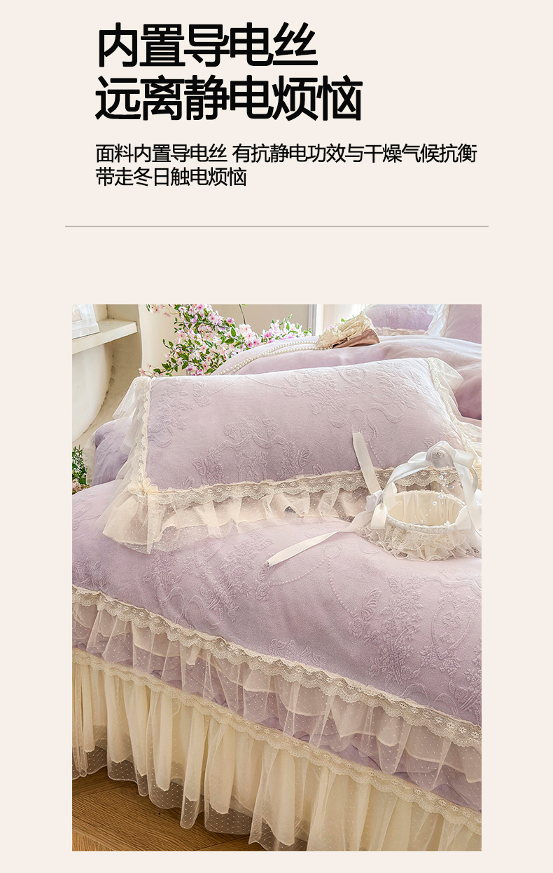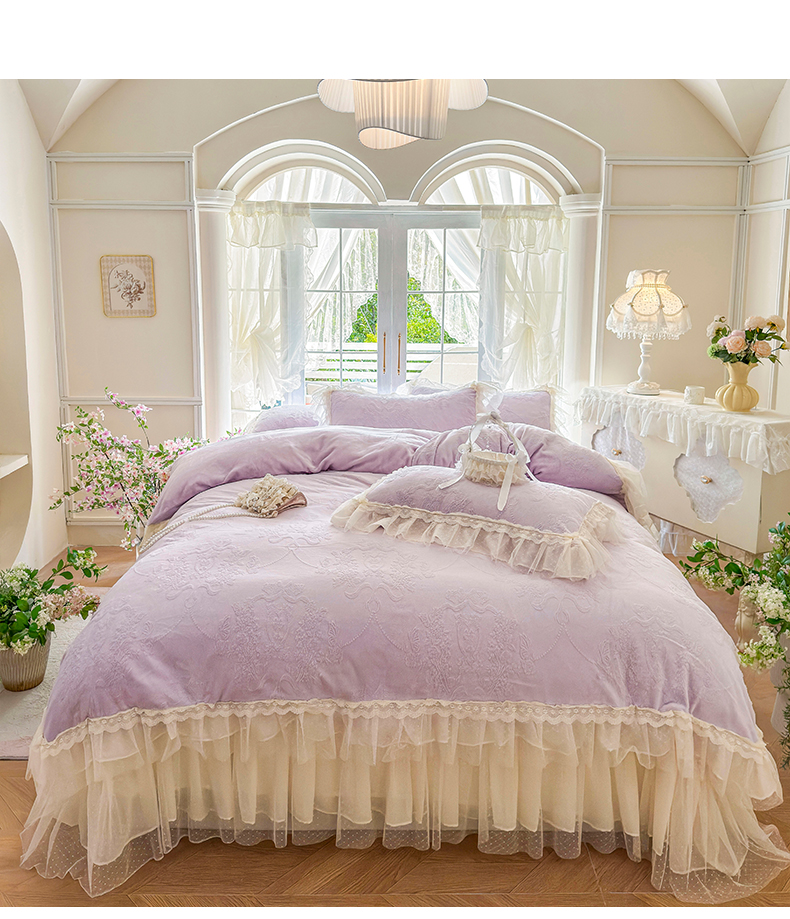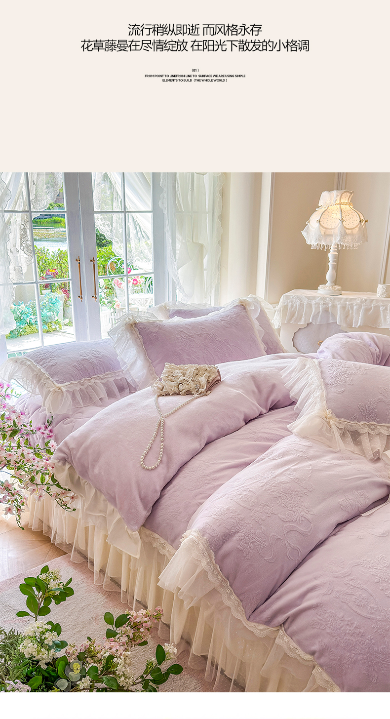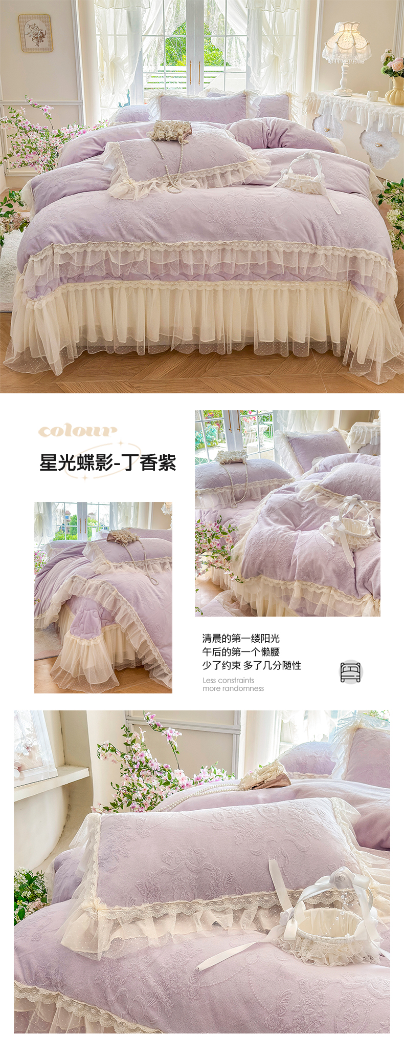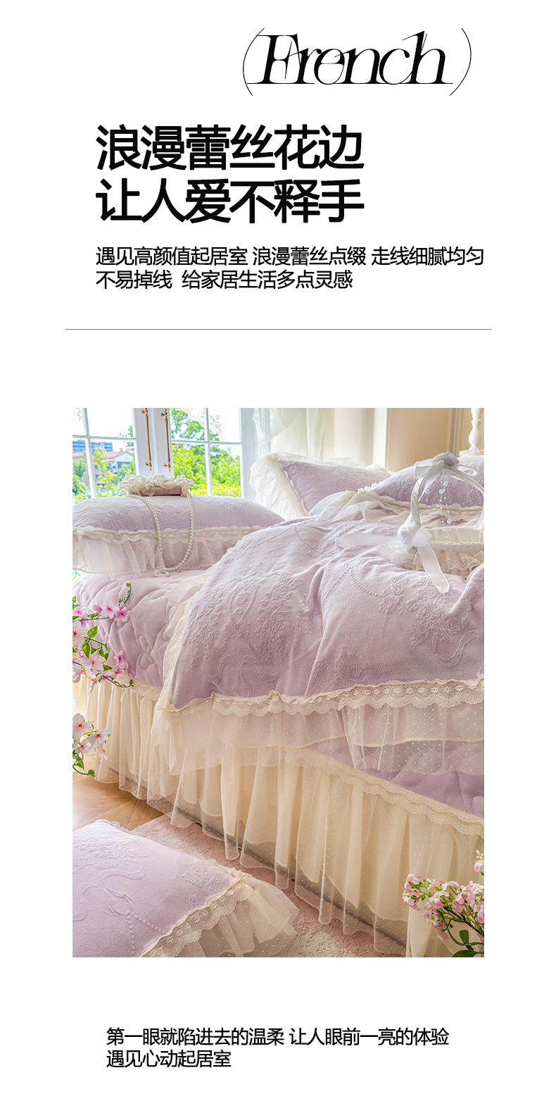 商品名称:虹星家纺 2025新款法式雕花牛奶绒花边床盖四件套-星光碟影 星光蝶影-丁香紫