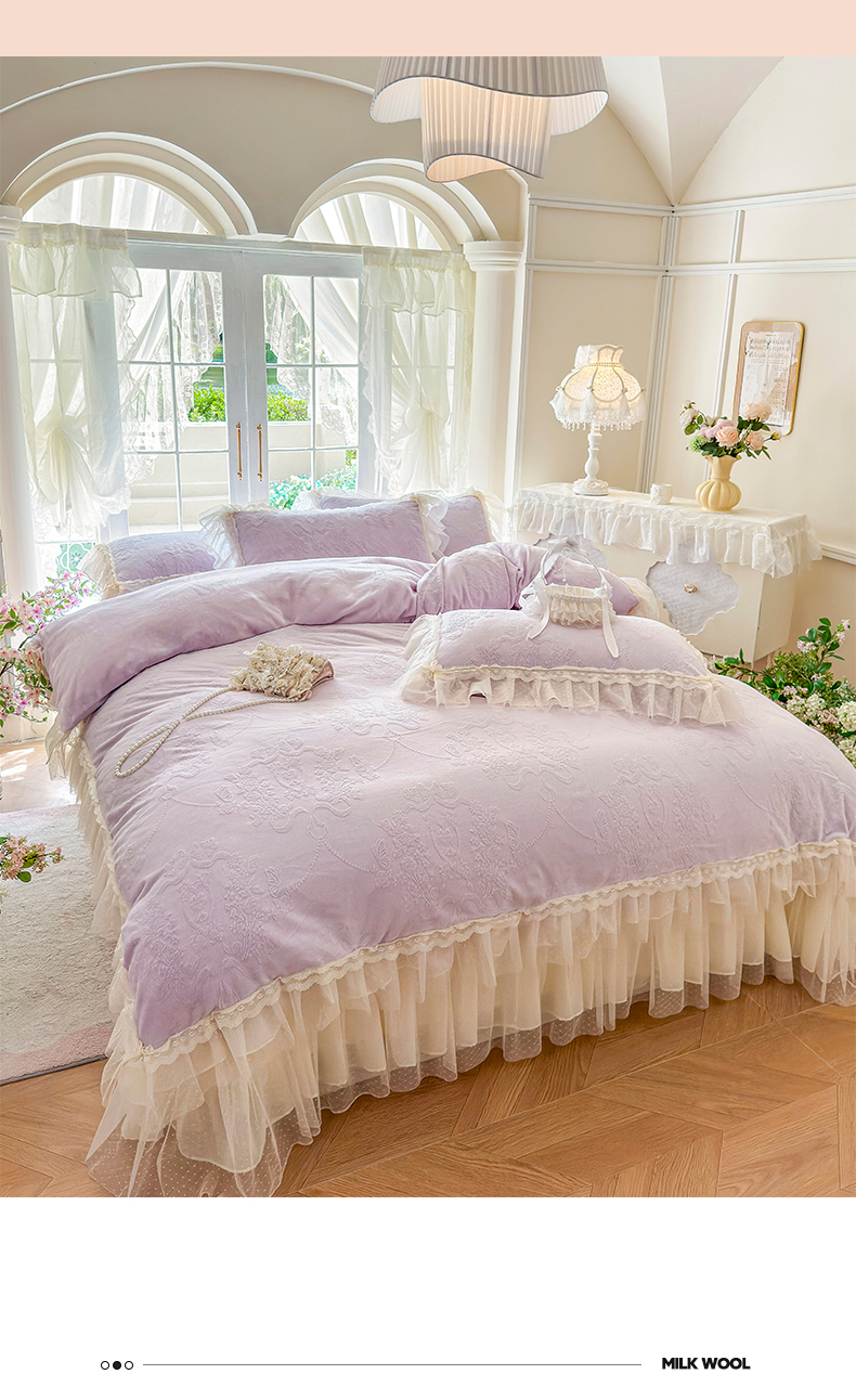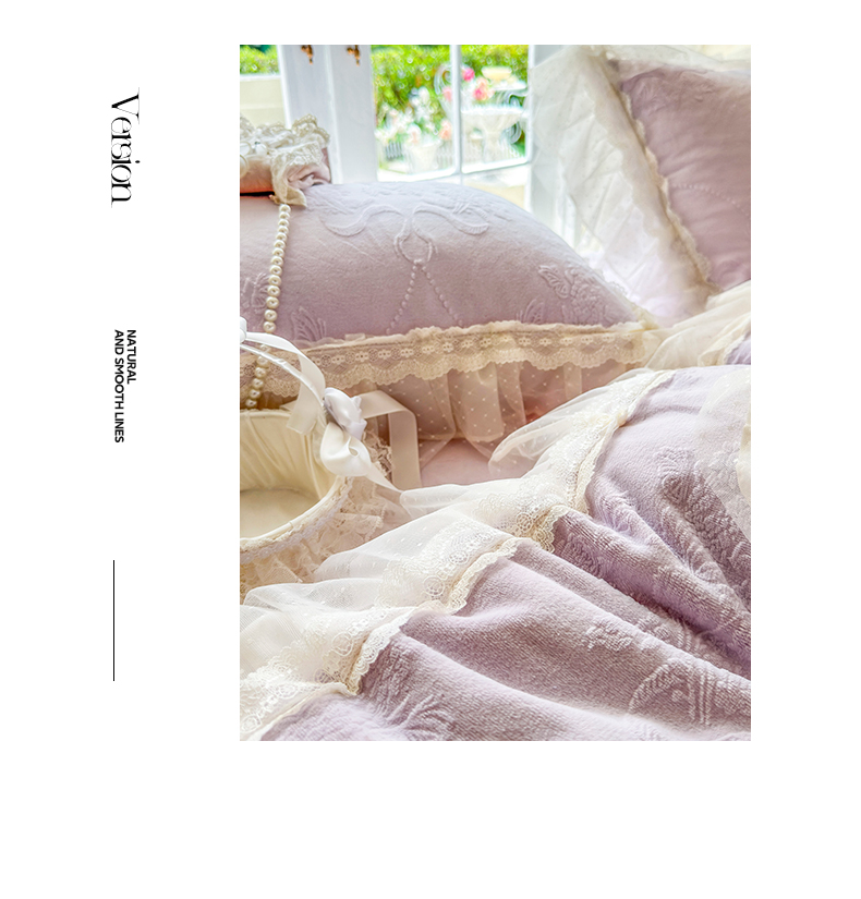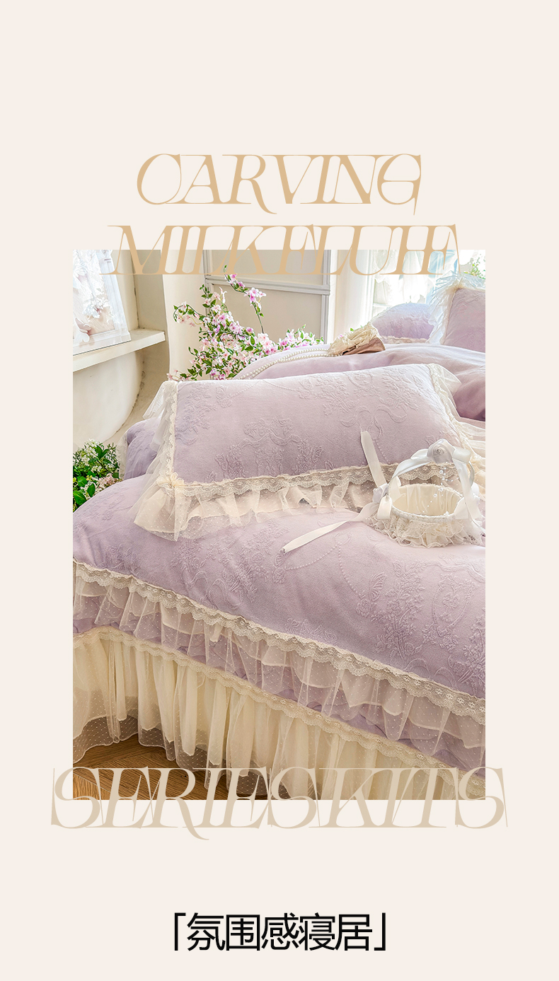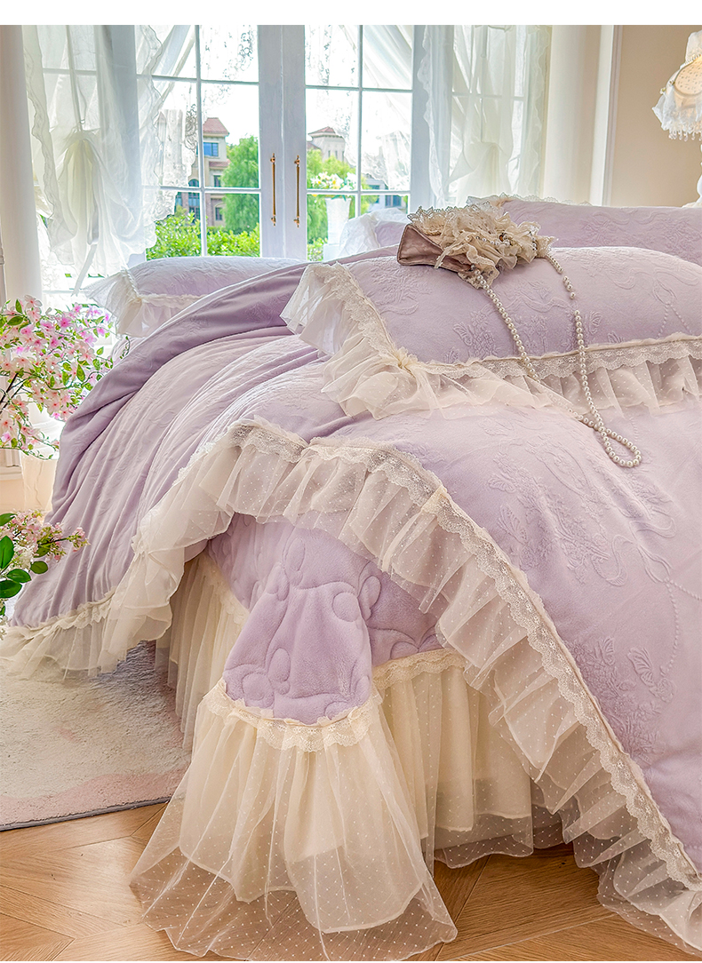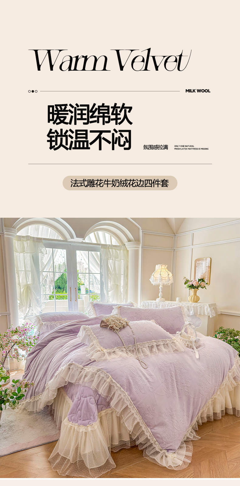 商品名称:虹星家纺 2025新款法式雕花牛奶绒花边床盖四件套-星光碟影 星光蝶影-丁香紫