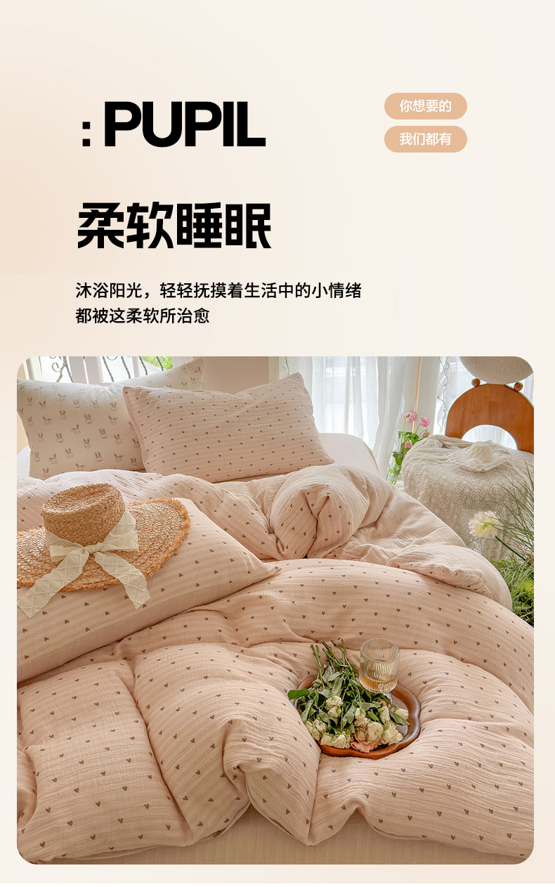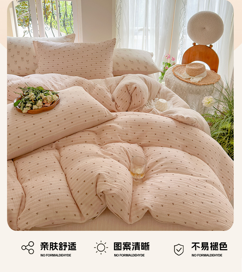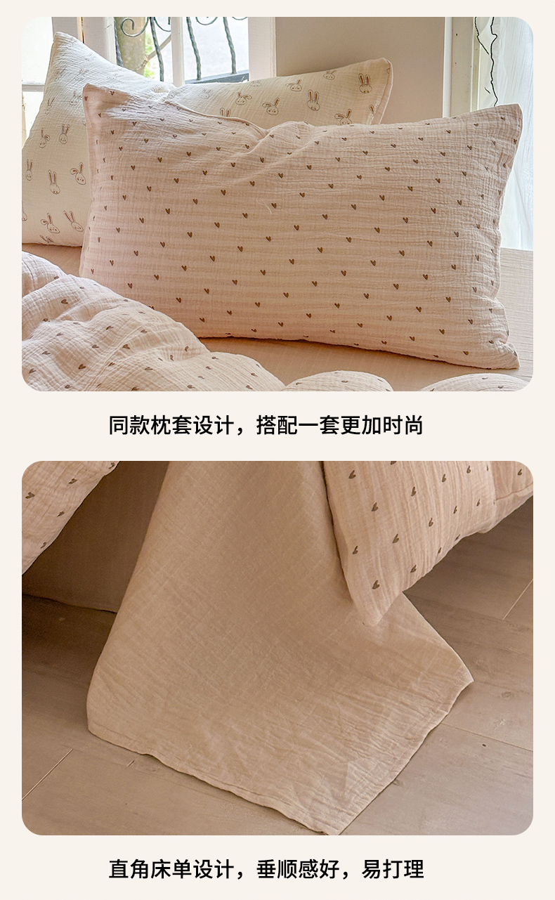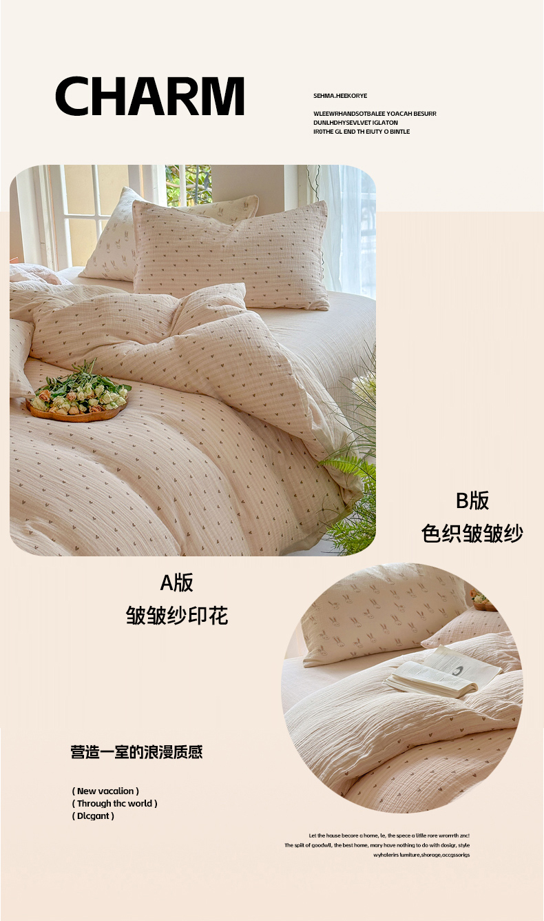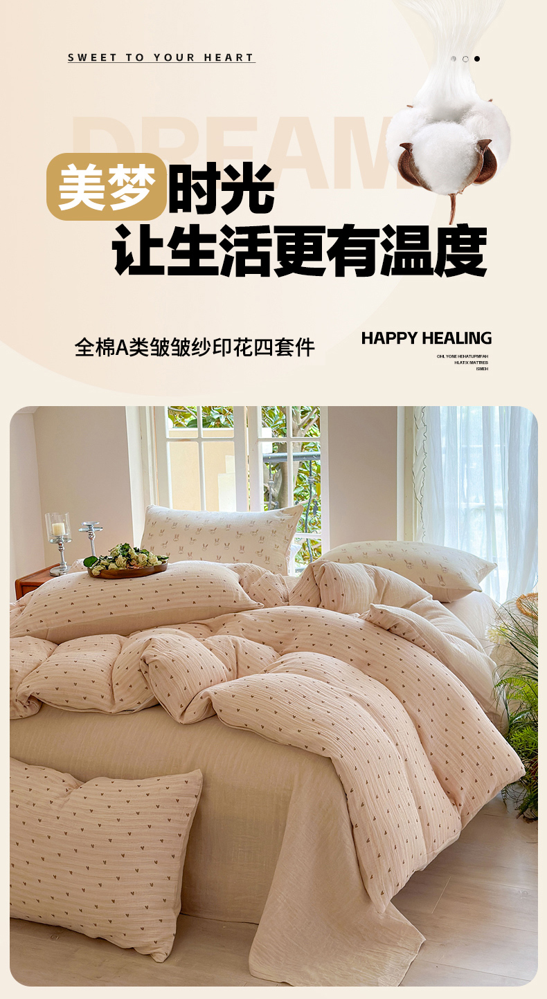 商品名称:木楌家居 2025春夏新品全棉A类皱皱纱印花四件套 可心咖