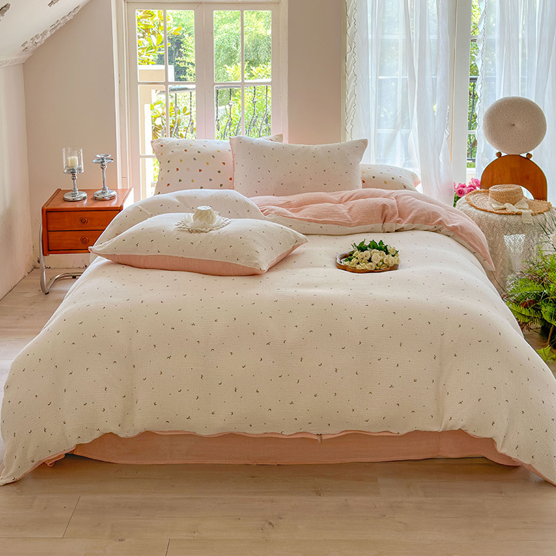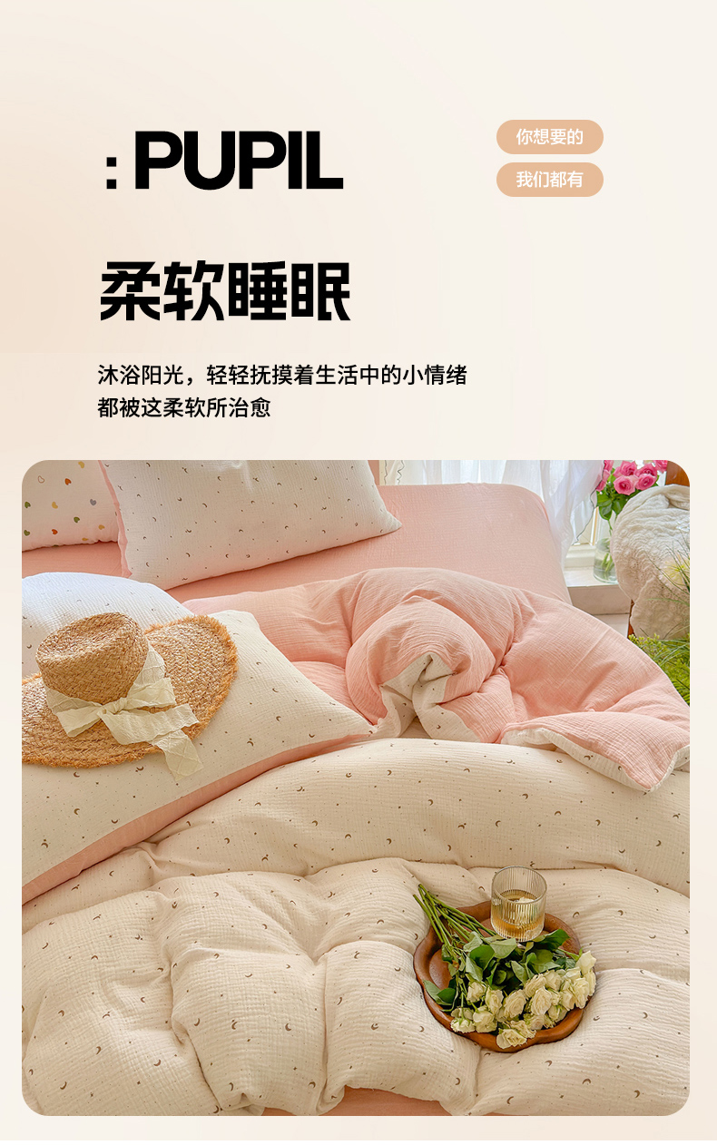 (总)木楌家居 2026新款全棉纱布云感冰冰被床盖四件套系列,樱桃狗,粉黛,兰颜,七彩爱心,时光里,甜心萝卜,小仓兰,小汽车,小星星,阳光小马,樱桃熊,云瑾
