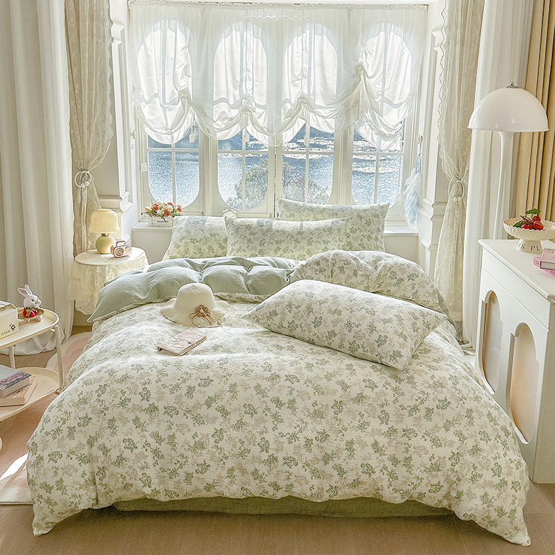 木楌 2025新款全棉A类皱皱纱印花四件套 丁香-绿,丁香-绿