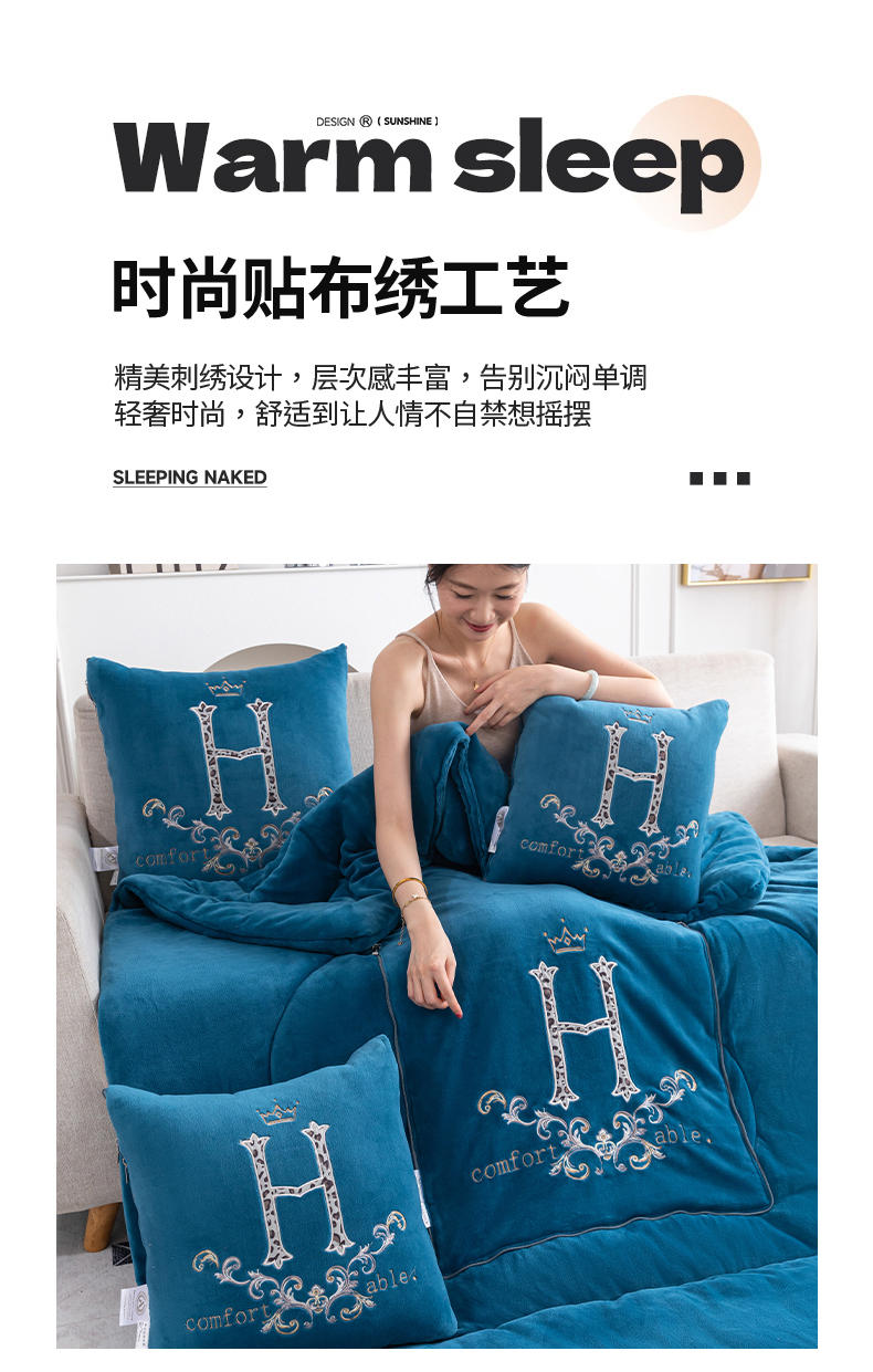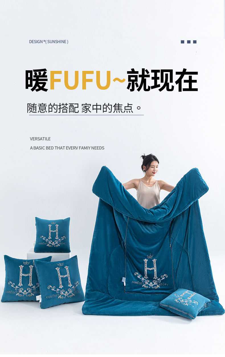 商品名称:照世家纺 2025新款牛奶绒简约复古款抱枕被 天兰