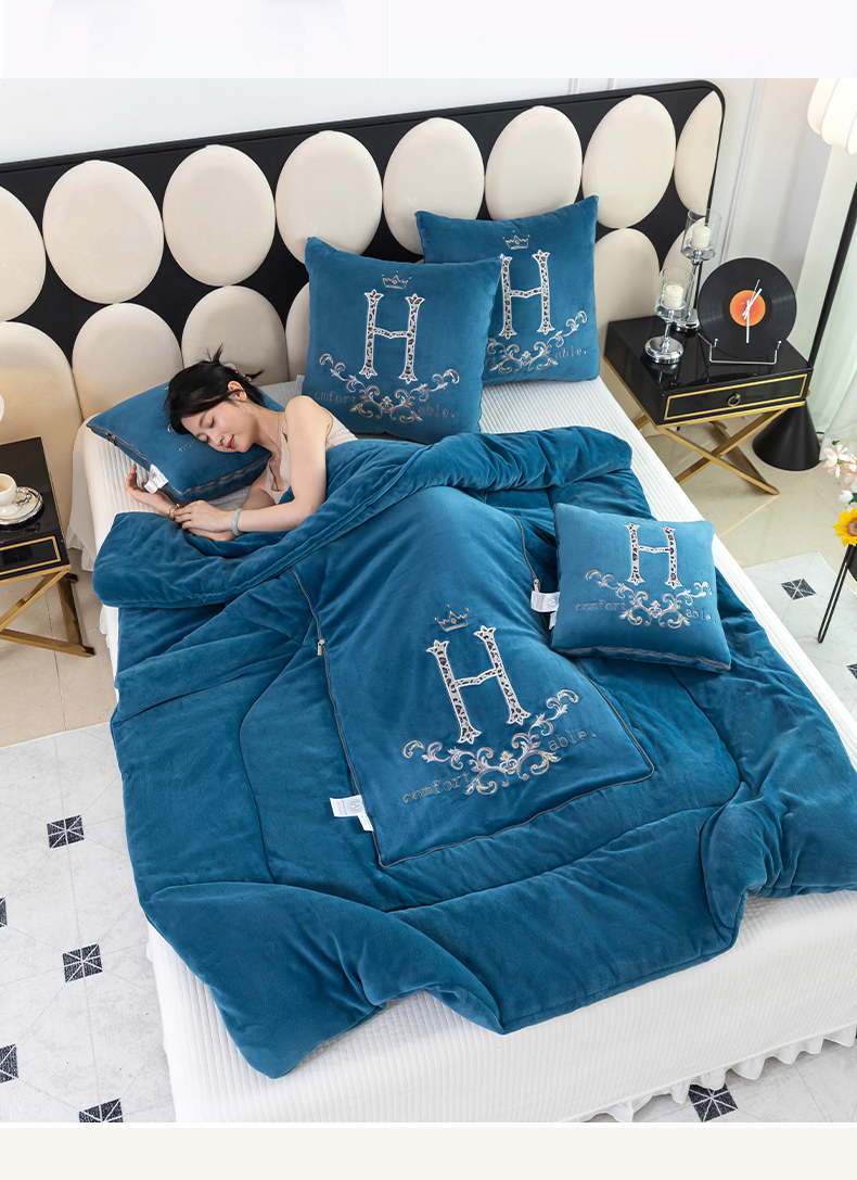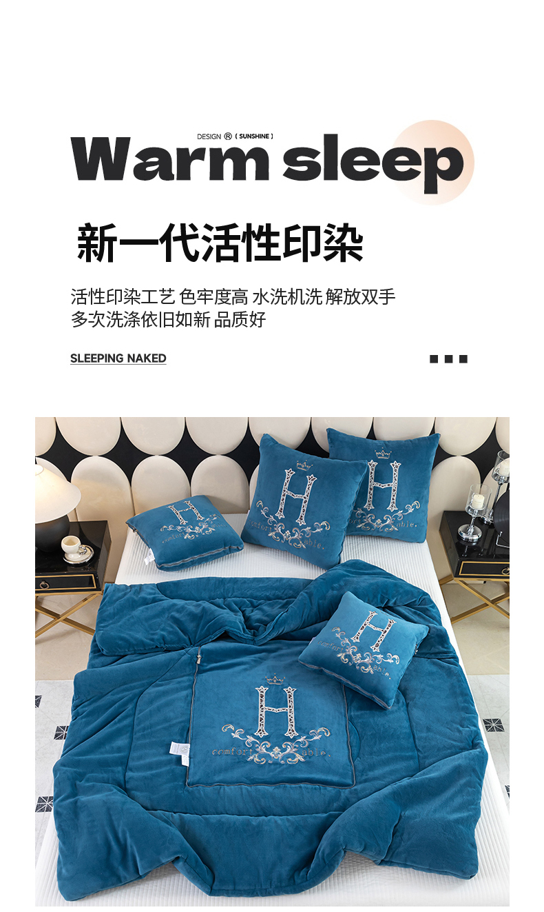 照世家纺 2025新款牛奶绒简约复古款抱枕被 天兰