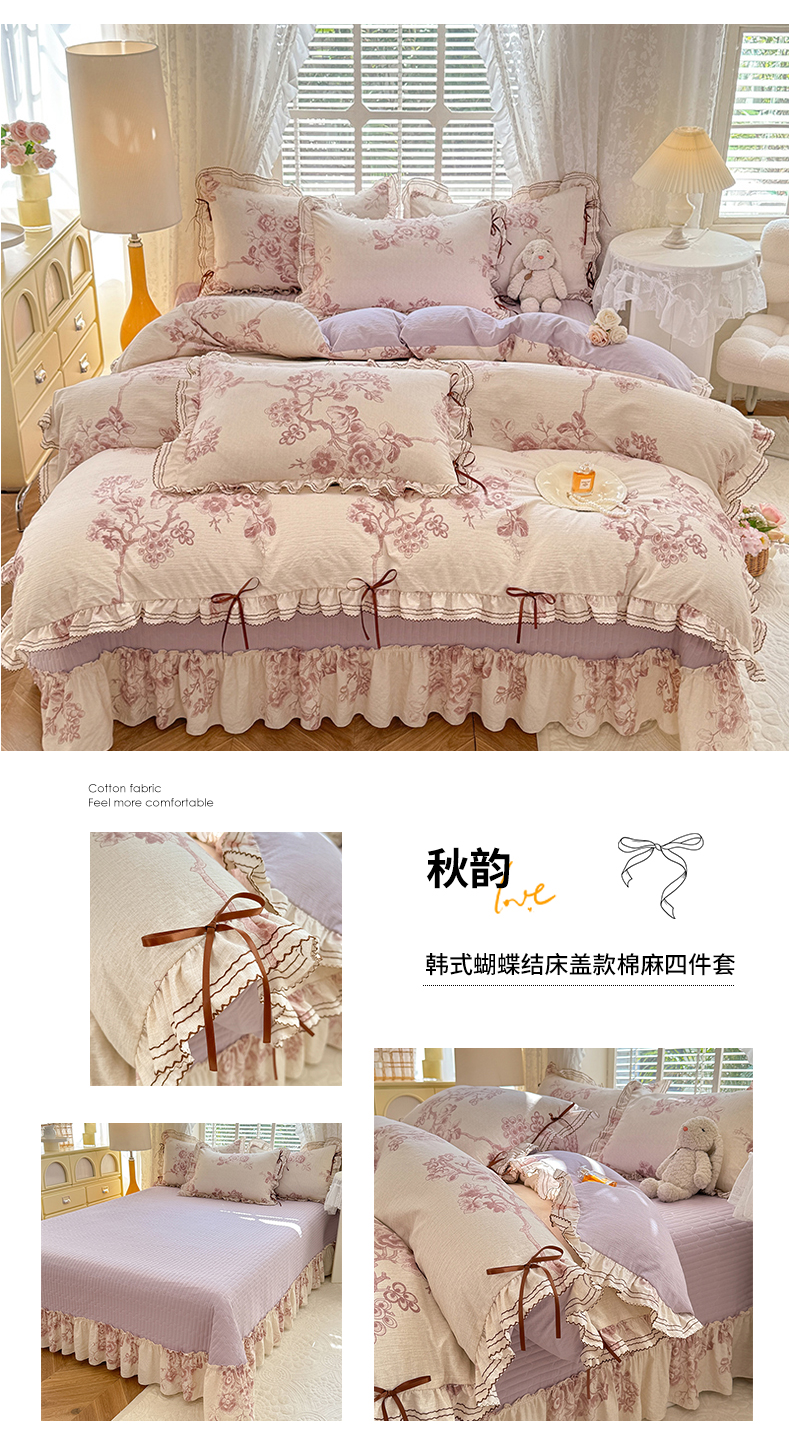 韩约家纺 2025新款韩约1韩式蝴蝶结床盖款棉麻四件套 诗雨