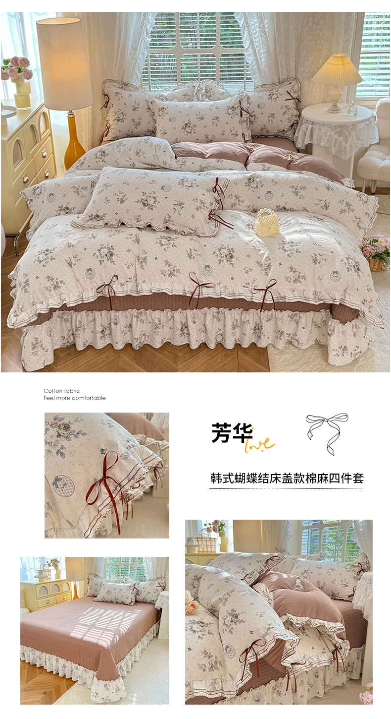商品名称:韩约家纺 2025新款韩约1韩式蝴蝶结床盖款棉麻四件套 诗雨