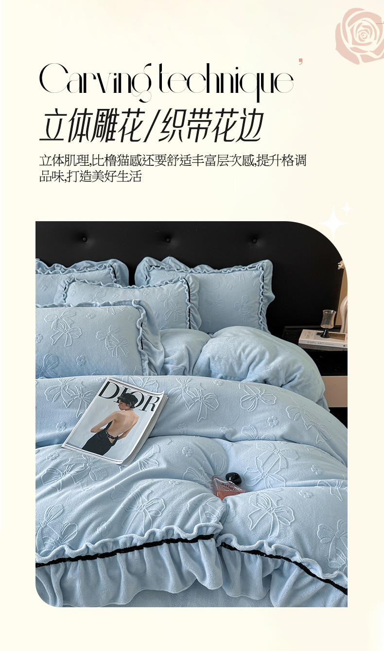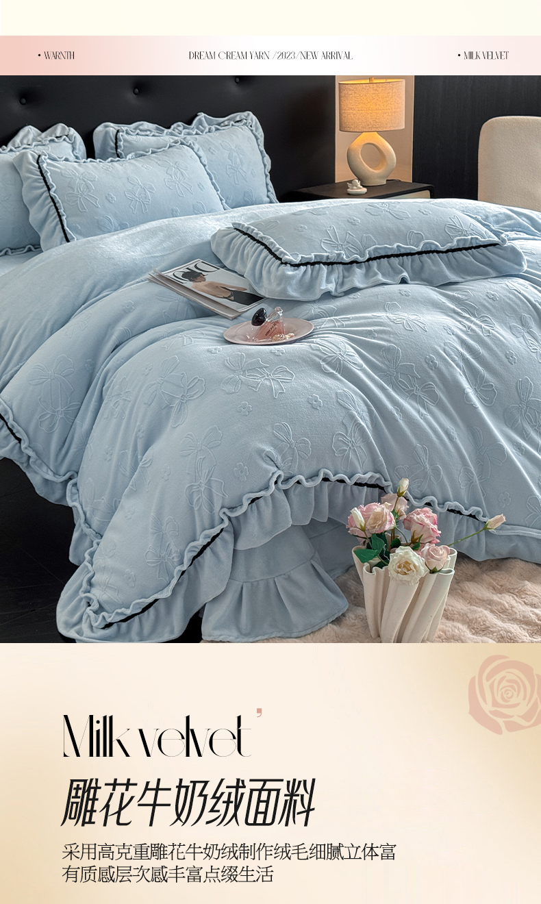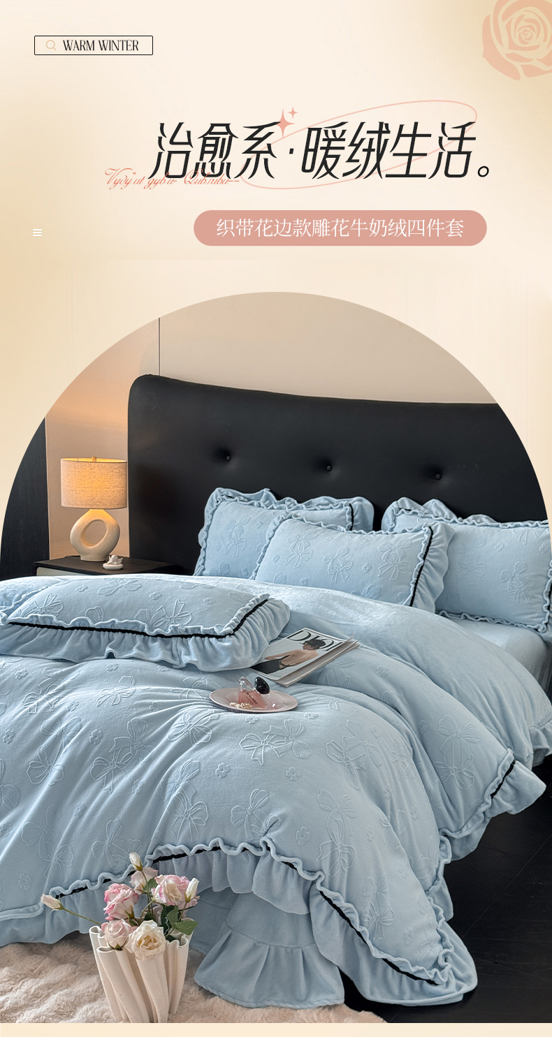 绘萱家居 2025新款新品爆款高密消光织带花边款雕花牛奶绒四件套 薇薇安-兰