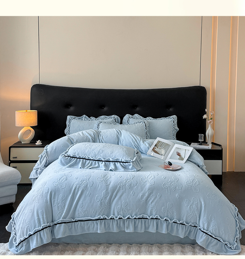 商品名称:绘萱家居 2025新款新品爆款高密消光织带花边款雕花牛奶绒四件套 薇薇安-兰