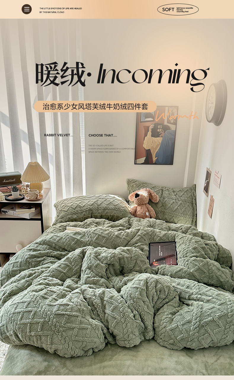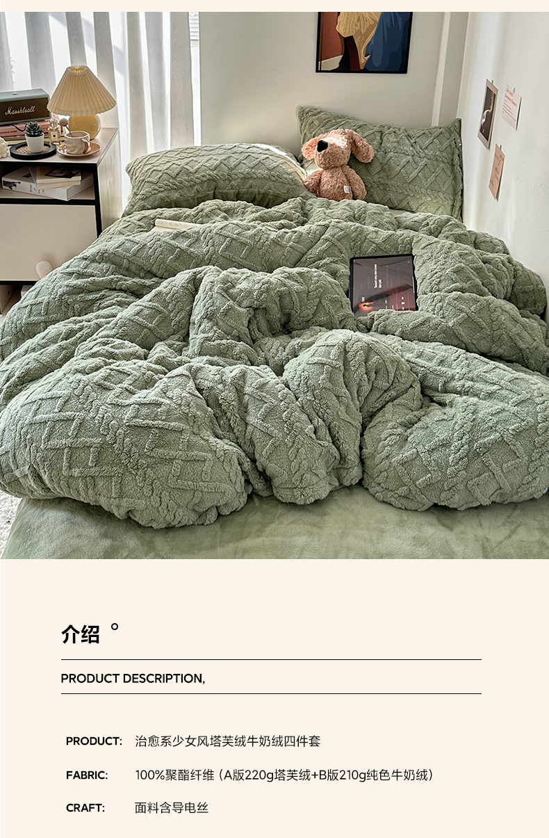 商品名称:艾咪-Amy ntmy 2025新款治愈系少女风塔芙绒牛奶绒四件套 抹茶