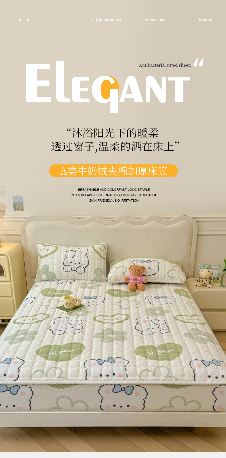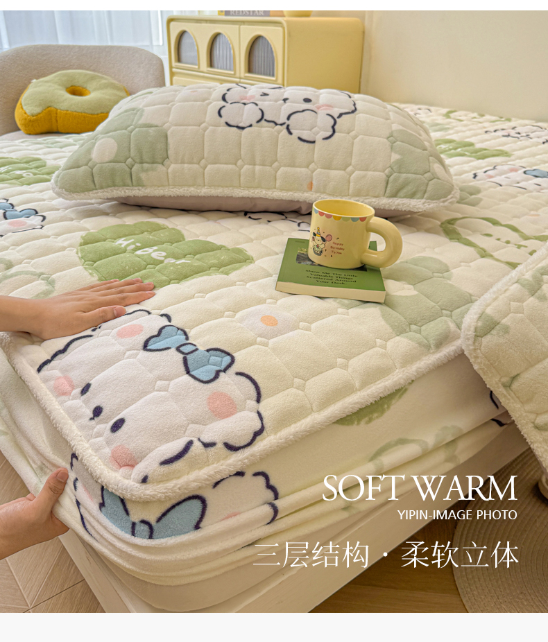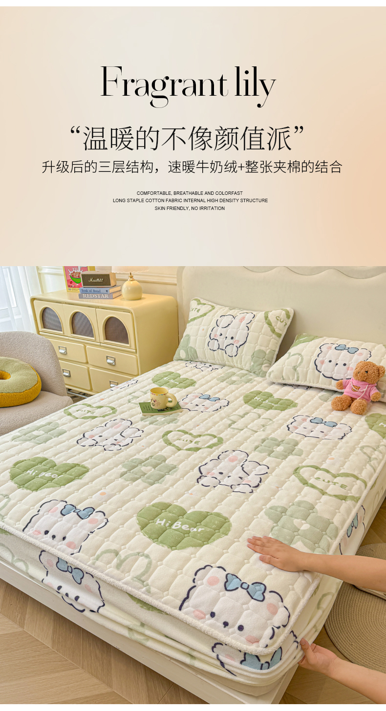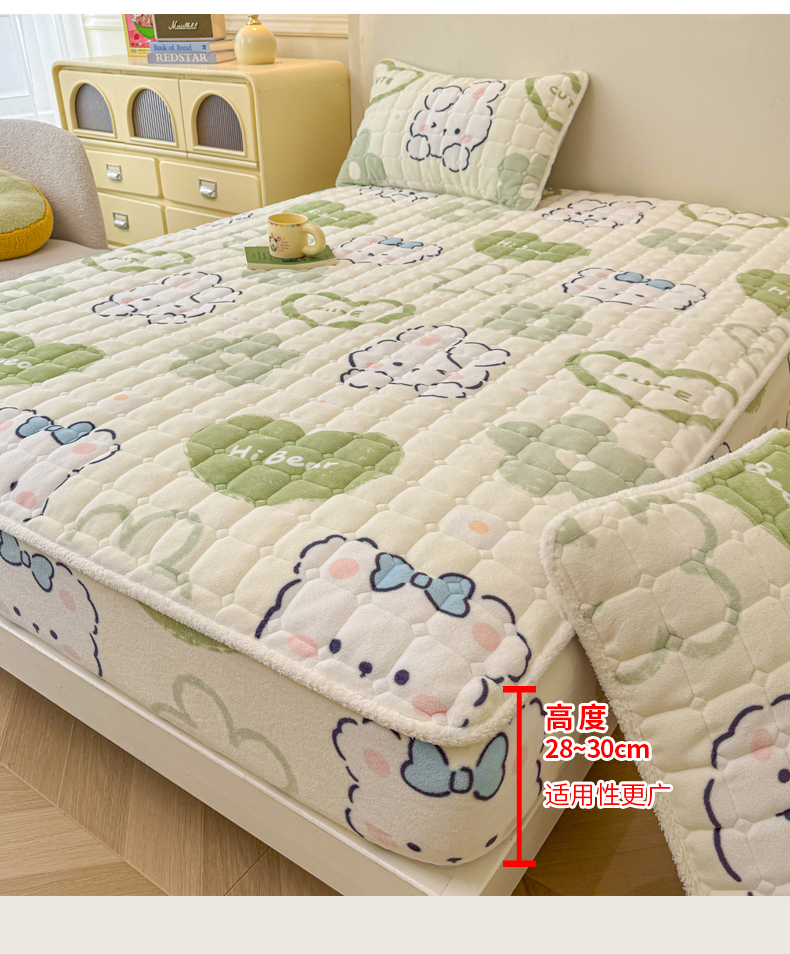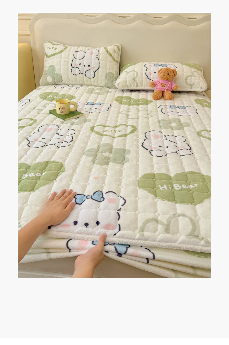 • 91家纺网 家纺一手货源 找家纺 LIFE.丽芙 2025秋冬新款牛奶绒加厚夹棉单床笠印花款床垫子保护套秋冬保暖床罩子三件套 爱心小宠-绿