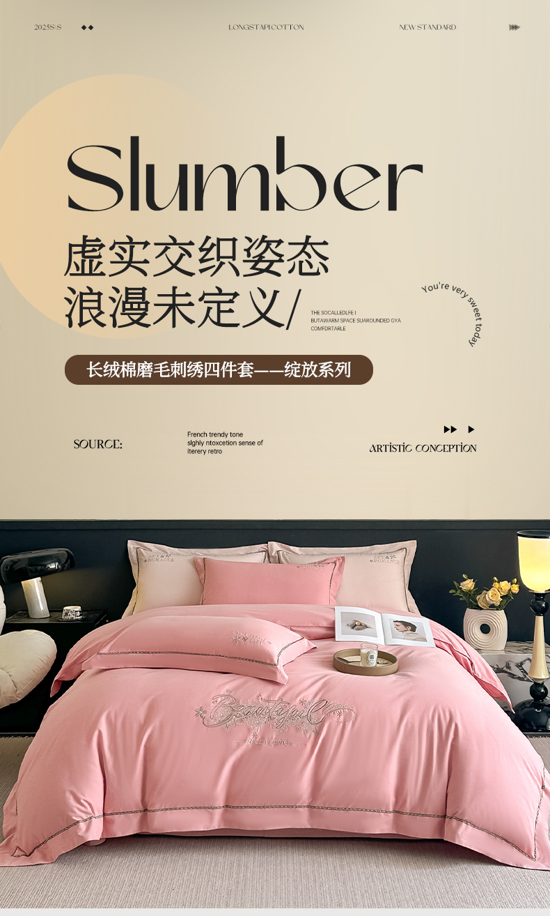曲之慕 2025新款高端全棉纯棉长绒棉磨毛刺绣四件套【高端礼盒】 粉豆沙