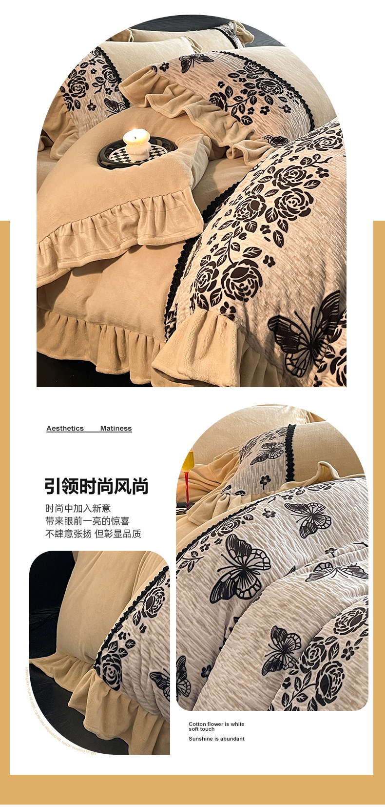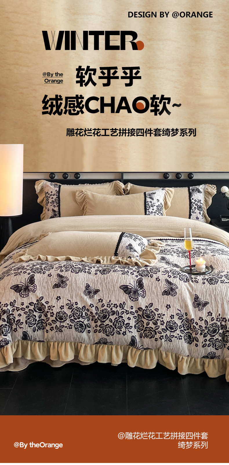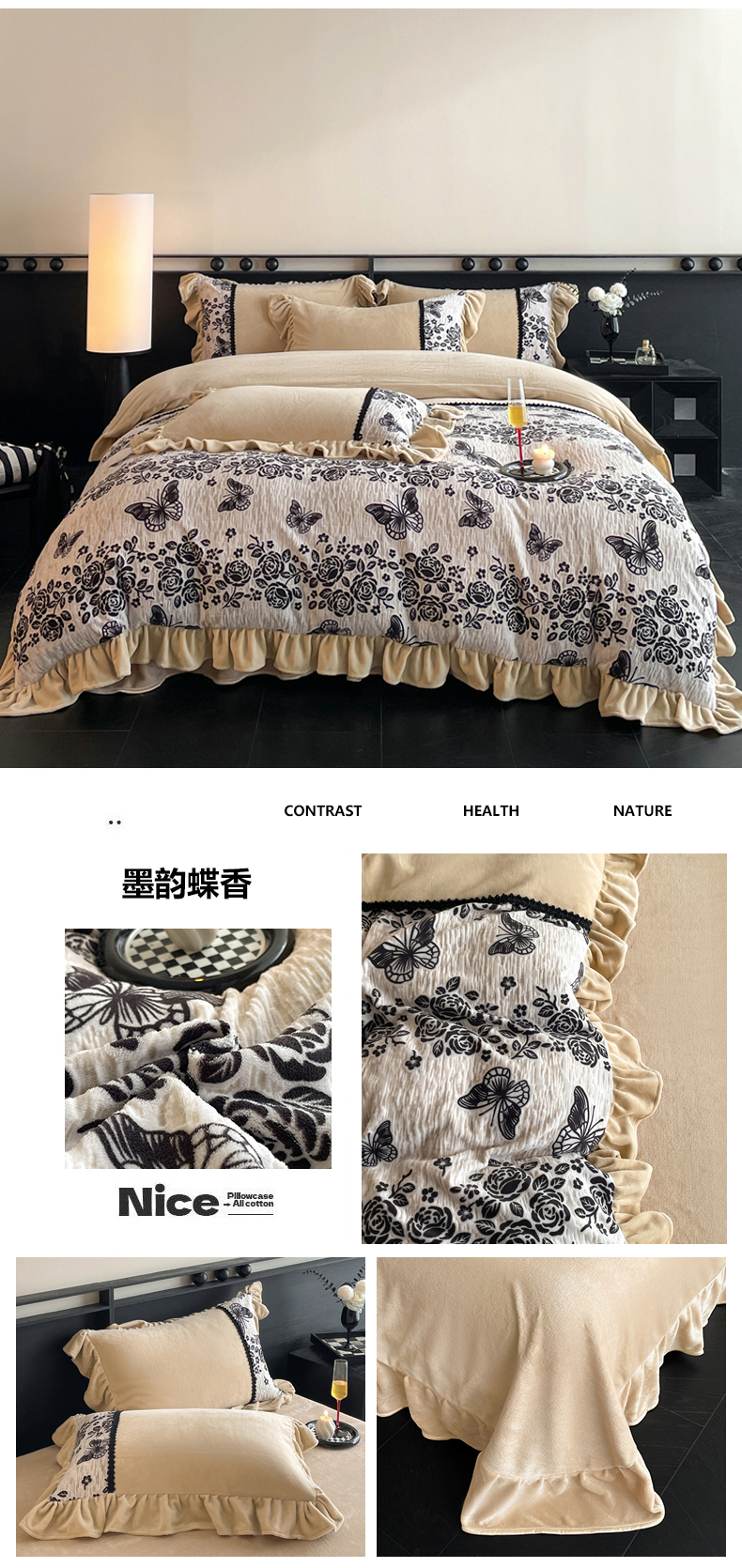 商品名称:慕木家纺 2025新款A类高克重高端雕花烂花AB版工艺款拼接四件套绮梦系列(直播热款) 墨韵蝶香