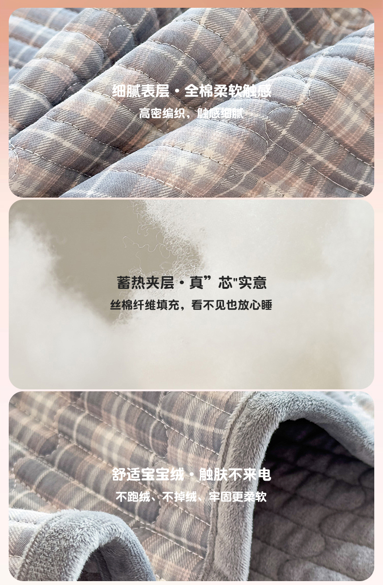 恒爱家纺 2025新款全棉宝宝绒双拼床盖三件套 灰小格