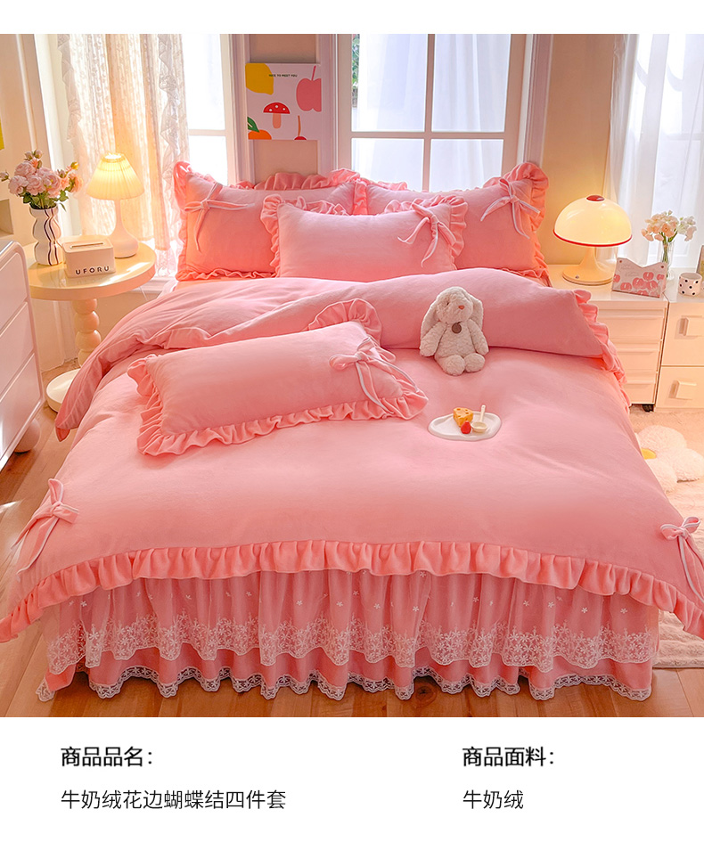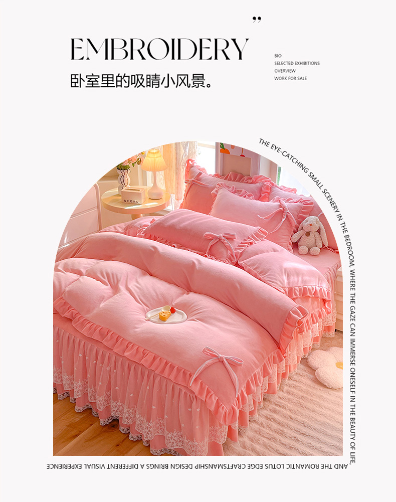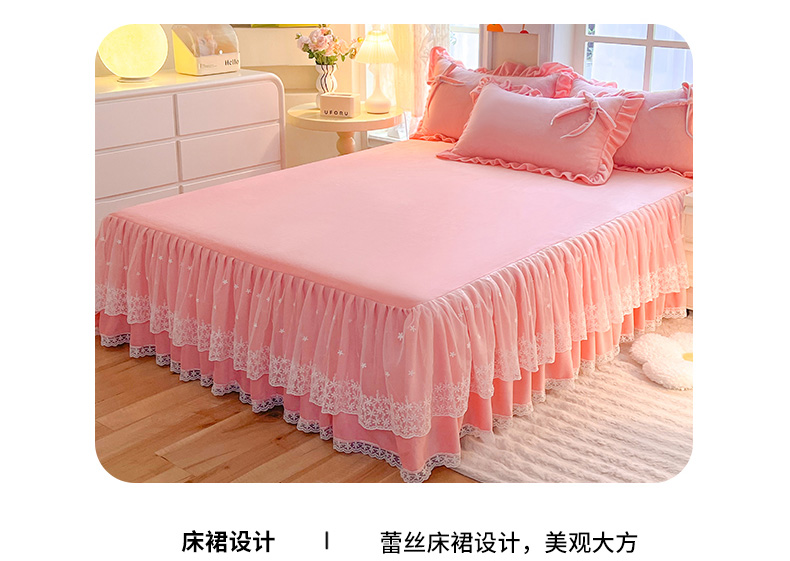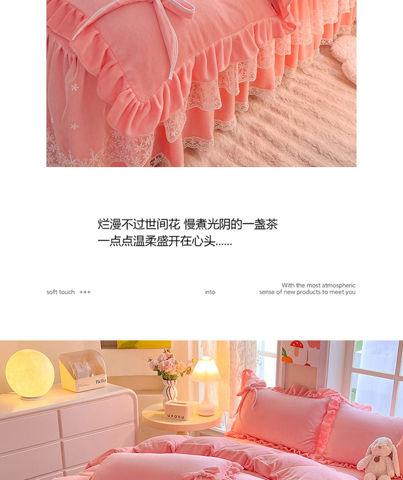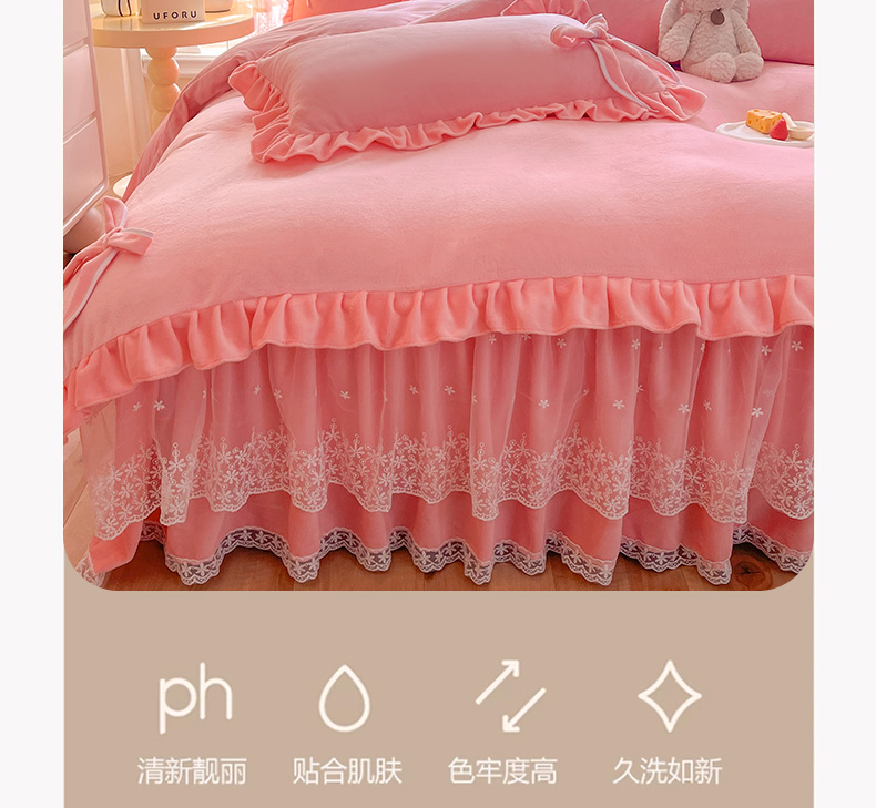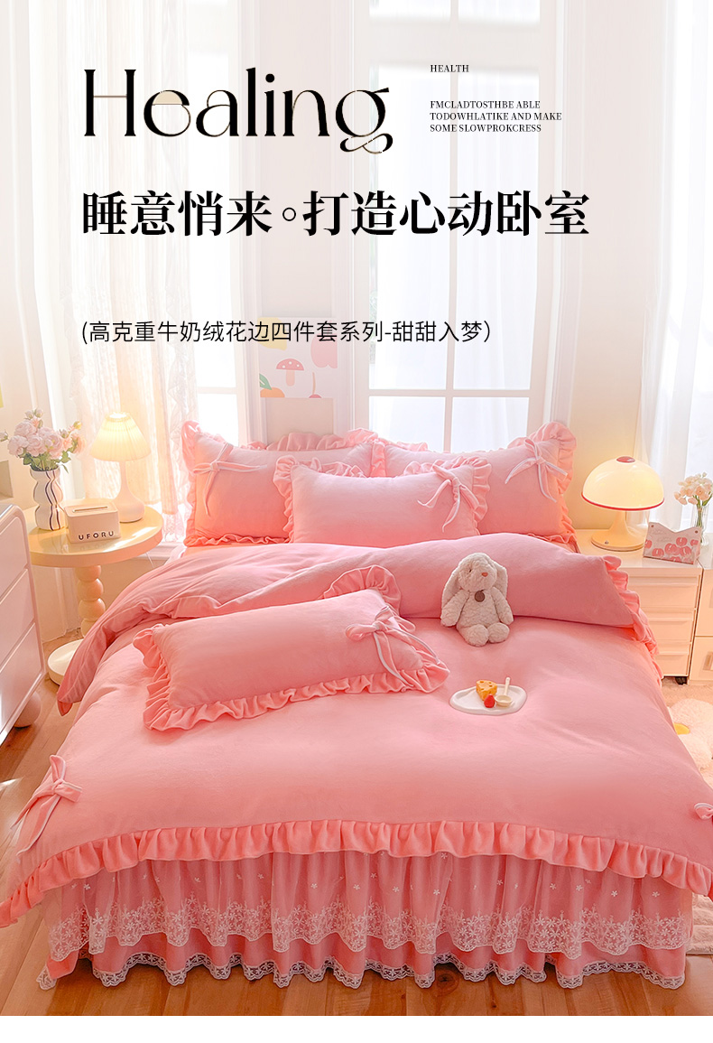 商品名称:后庭寝室 2025新款牛奶绒花边床裙四件套-浪漫花语系列 浪漫花语-暖粉玉