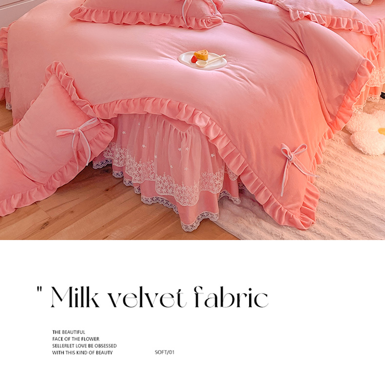 后庭寝室 2025新款牛奶绒花边床裙四件套-浪漫花语系列 浪漫花语-暖粉玉