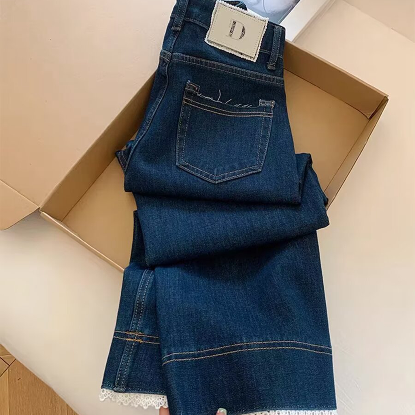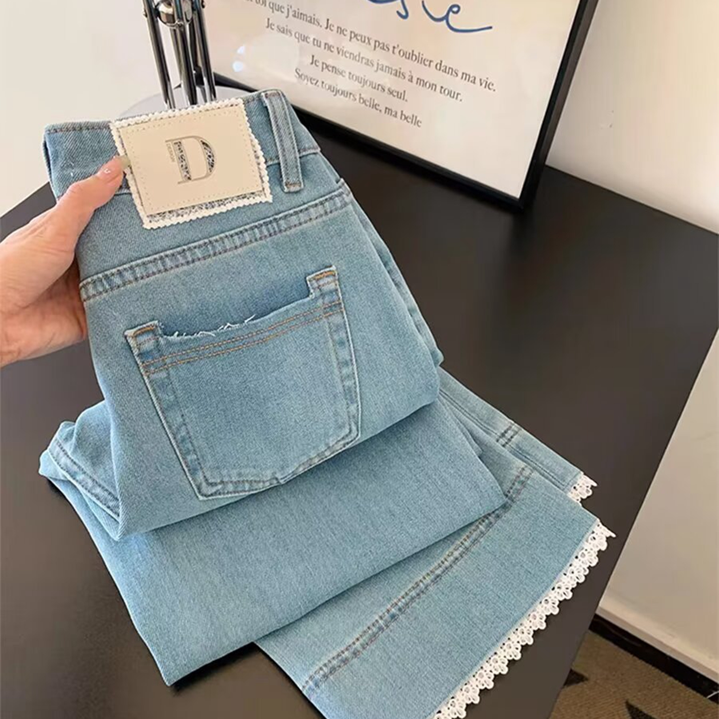 洛兰沙家居馆【只代发】【只代发】 2025新款蕾丝花边直筒牛仔裤女夏薄款小个子九分裤大码胖mm显瘦浅色阔腿牛仔裤5 深蓝