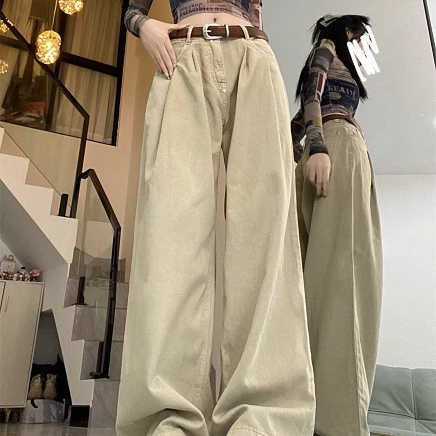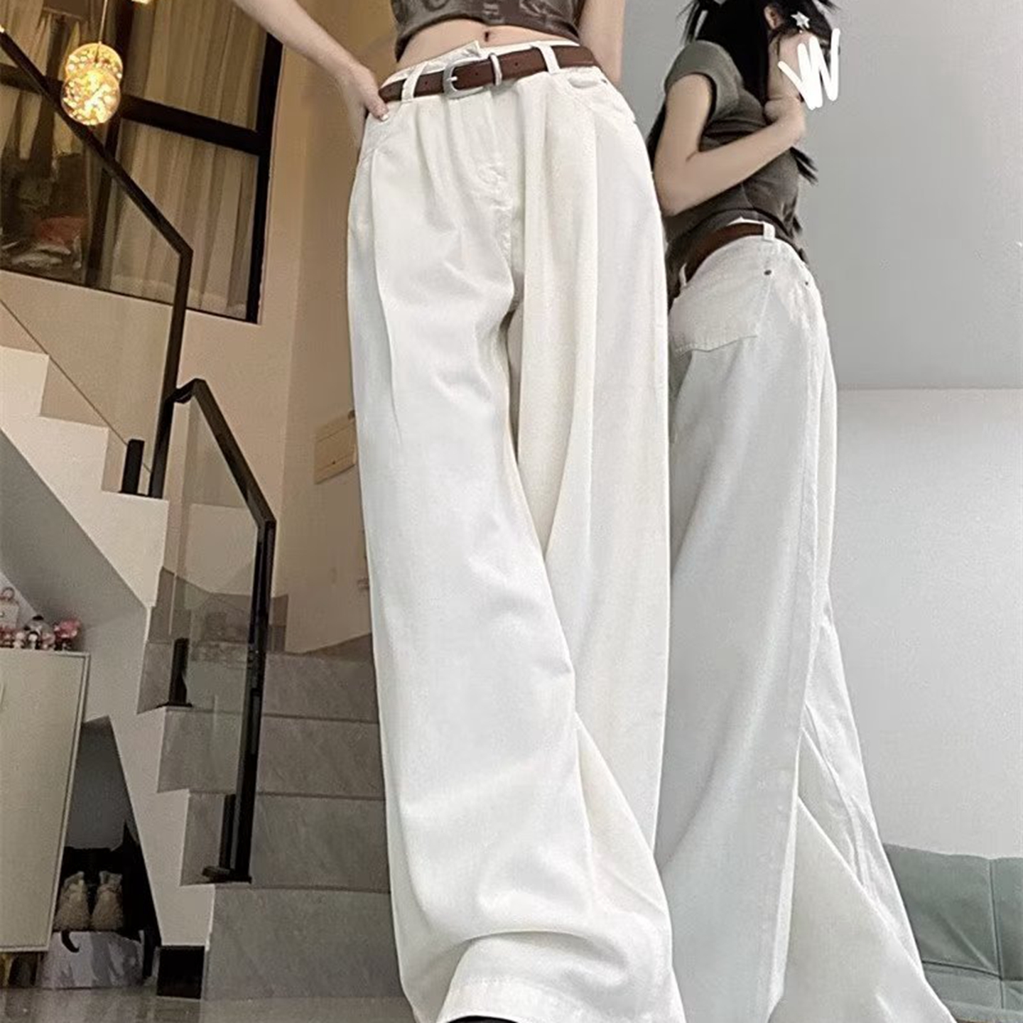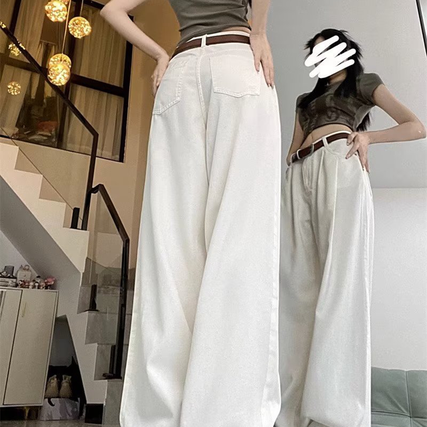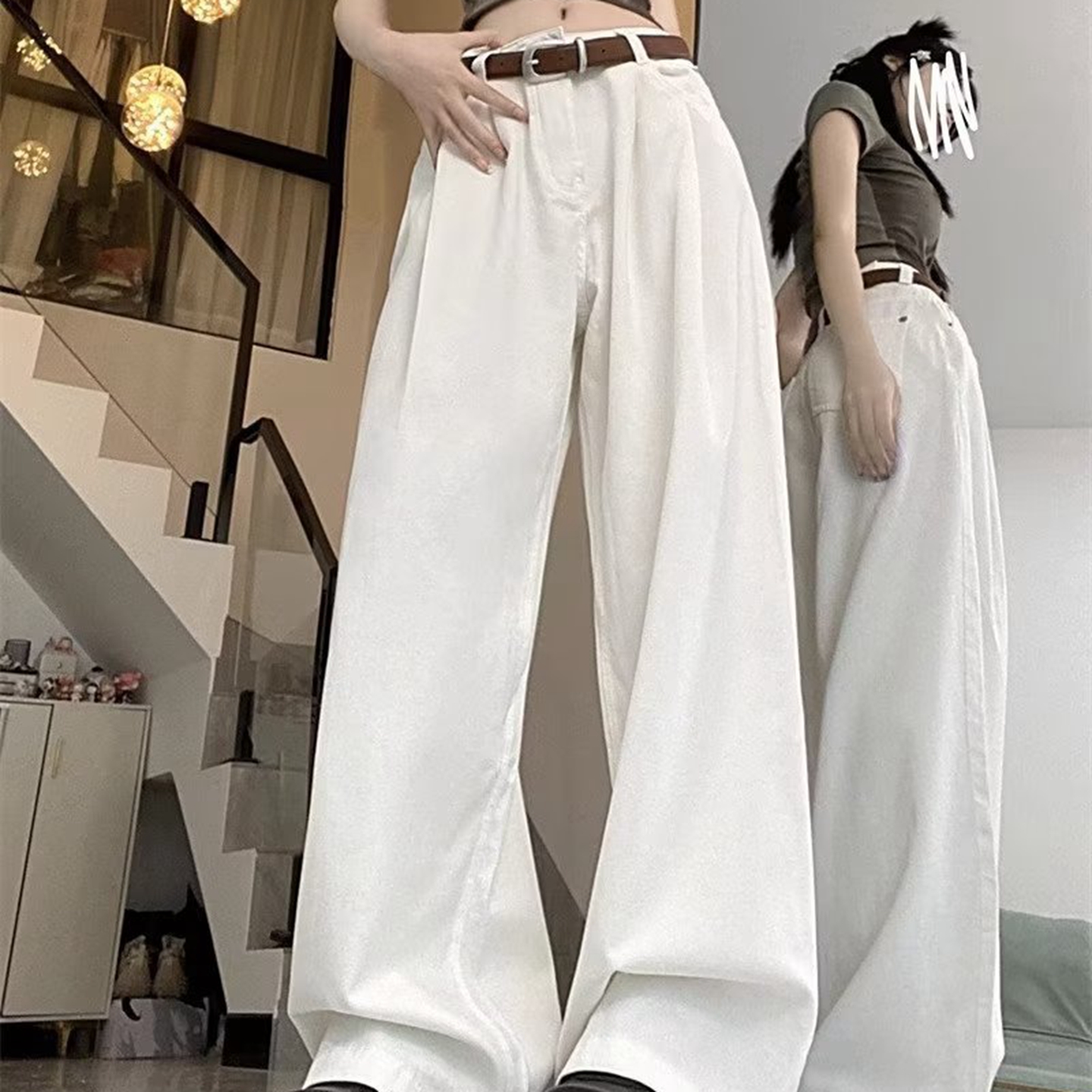 洛兰沙家居馆【只代发】【只代发】 2025新款白色垂感直筒休闲裤女秋季2023新款美式工装裤宽松阔腿裤拖地牛仔裤6 白色