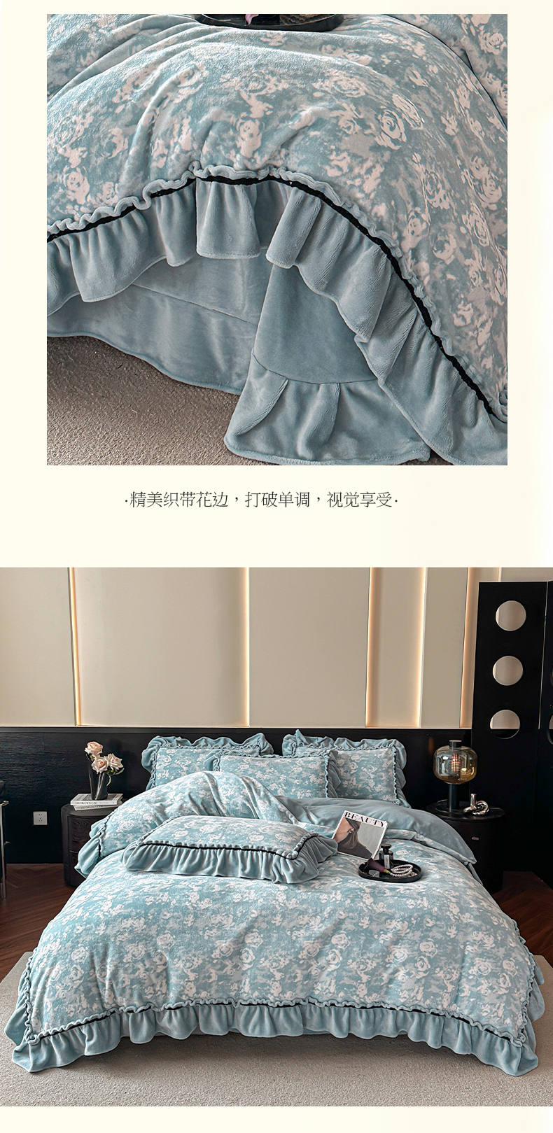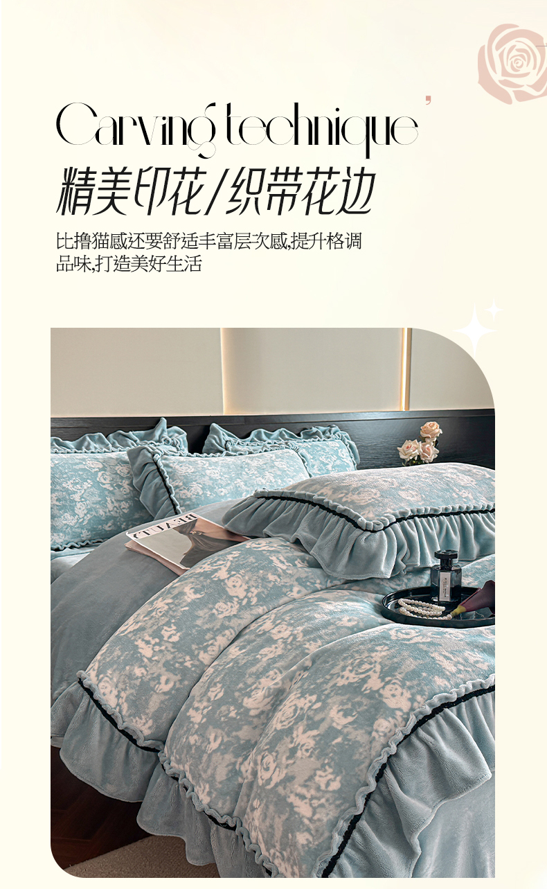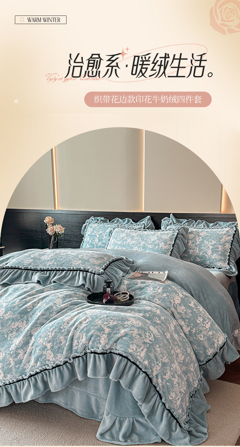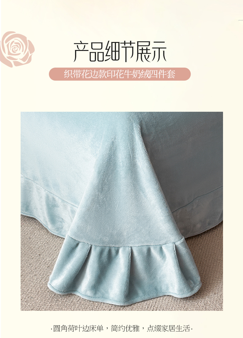 商品名称:绘萱家居 2025新款爆款高密消光织带花边款印花牛奶绒四件套纯色 芳华玫瑰-蓝