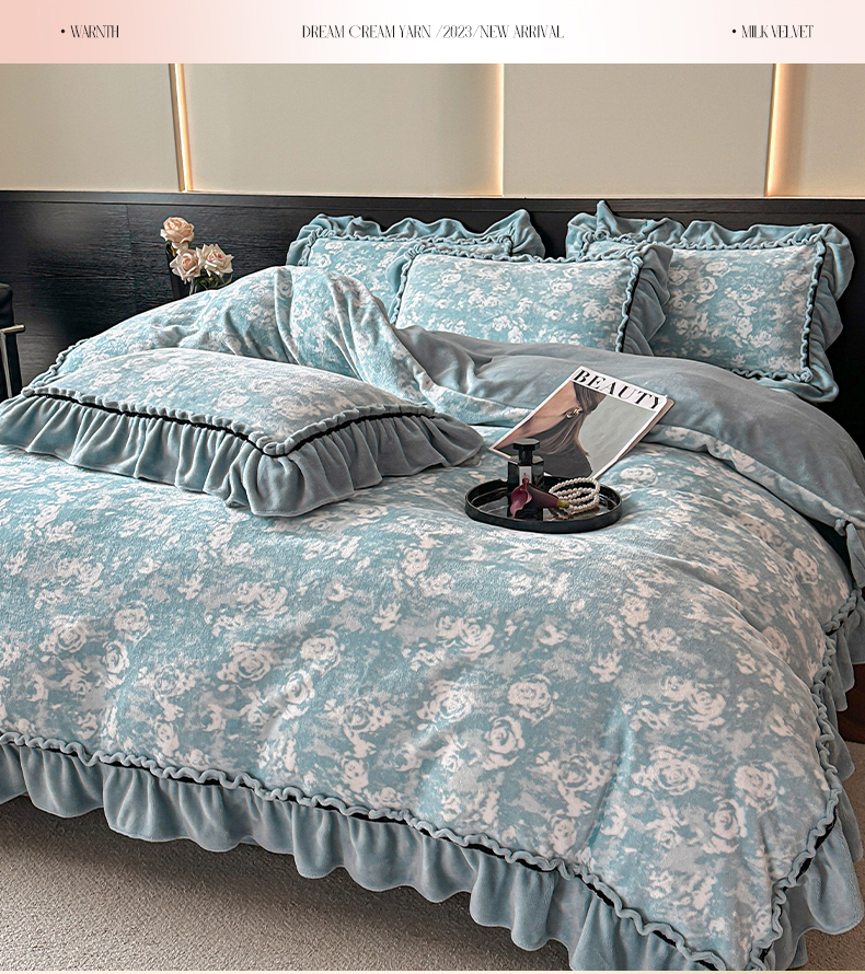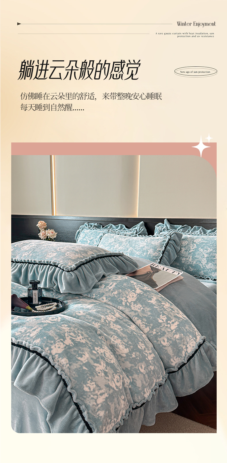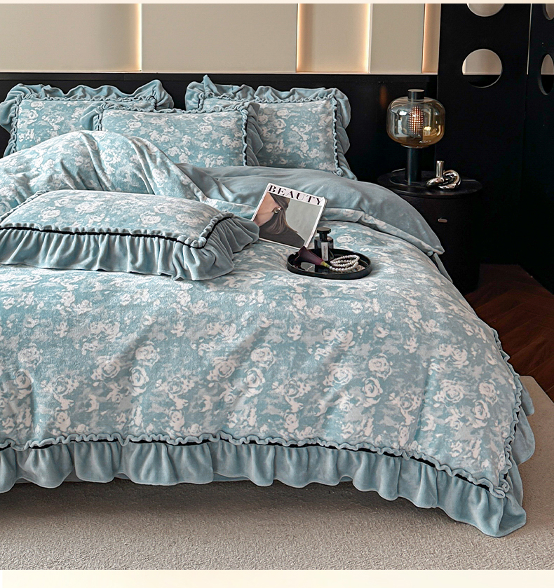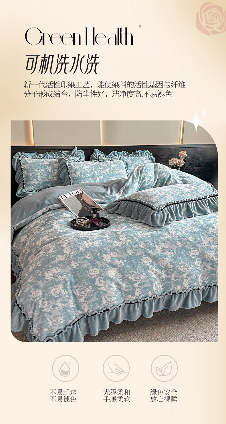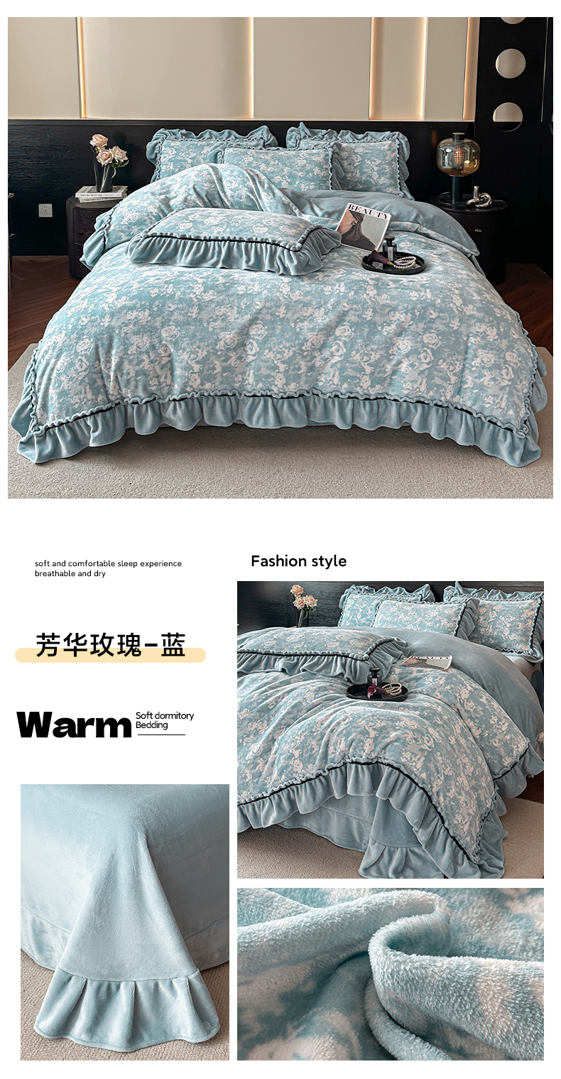 商品名称:绘萱家居 2025新款爆款高密消光织带花边款印花牛奶绒四件套纯色 芳华玫瑰-蓝