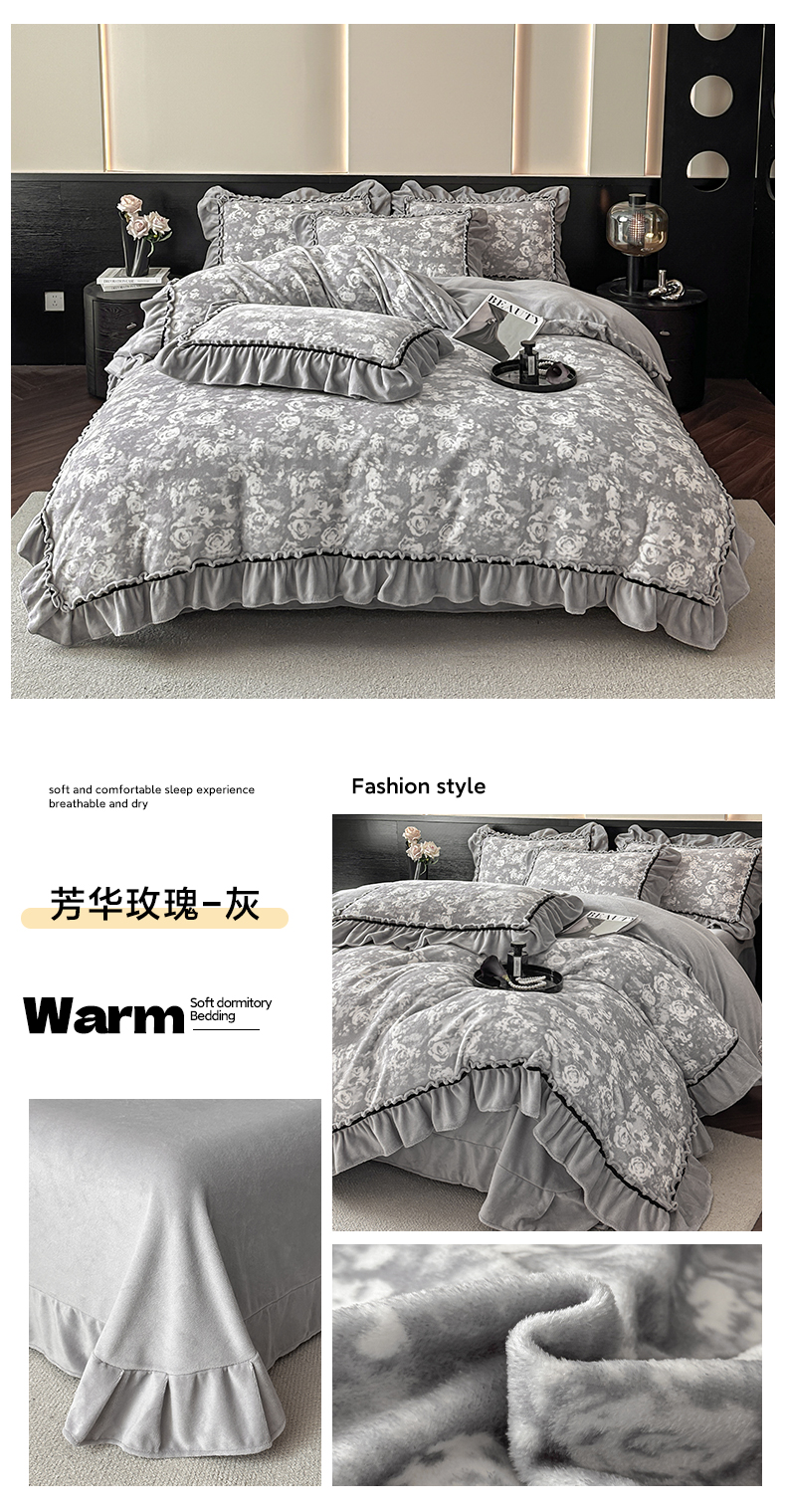绘萱家居 2025新款爆款高密消光织带花边款印花牛奶绒四件套纯色 芳华玫瑰-蓝