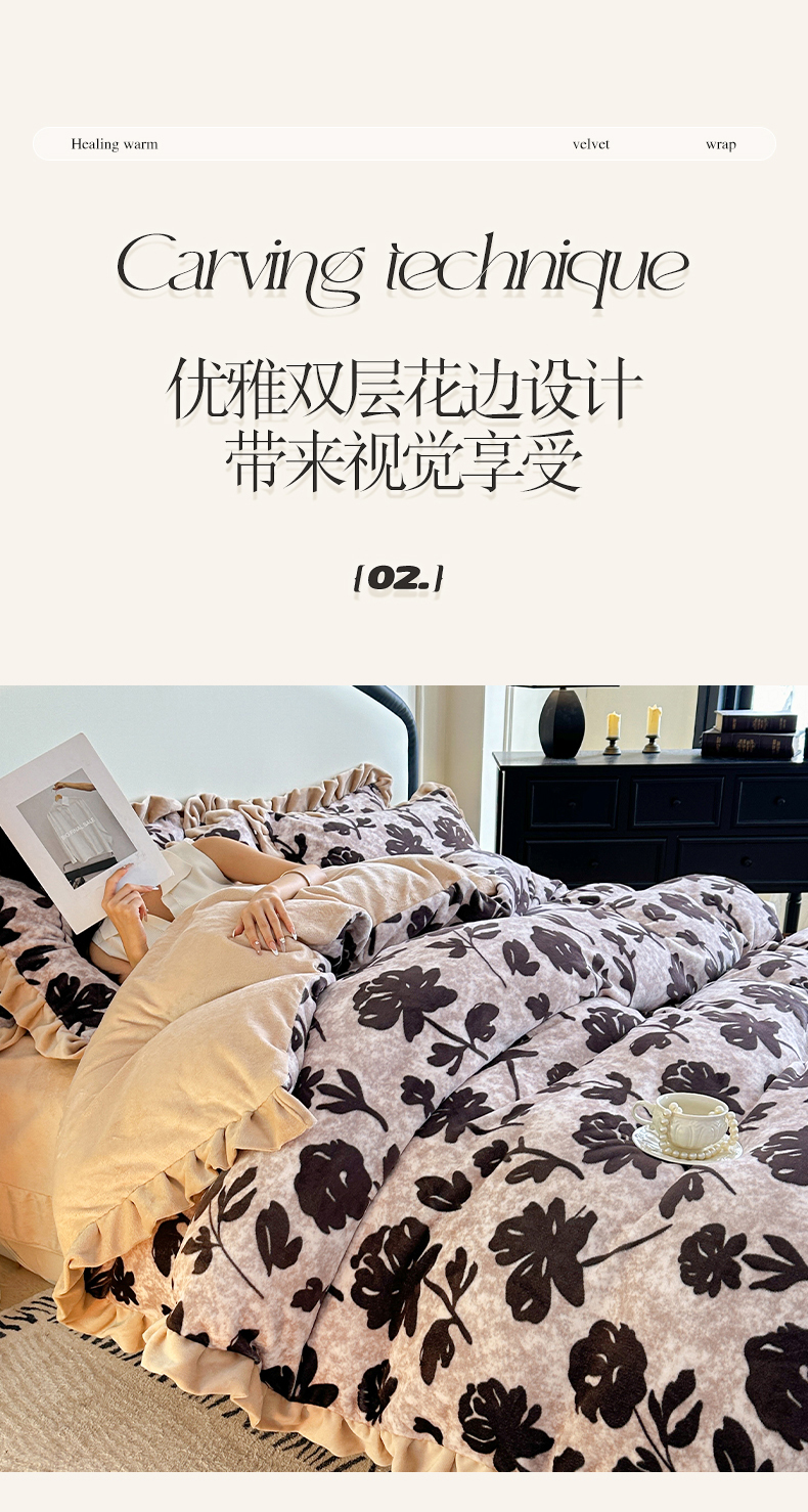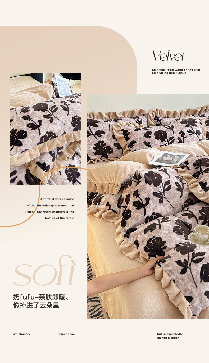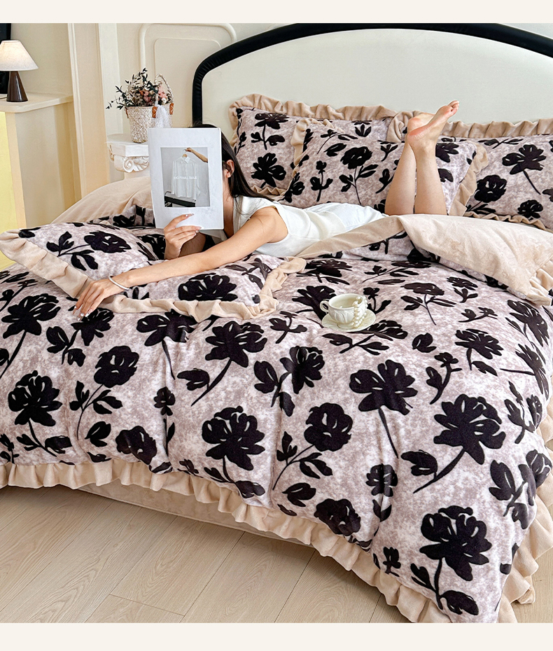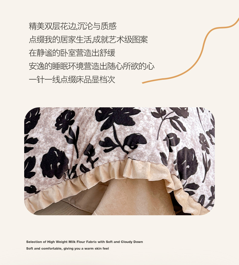 商品名称:绘萱家居 2025新款爆款高密消光双层花边牛奶绒四件套印花 奥黛丽